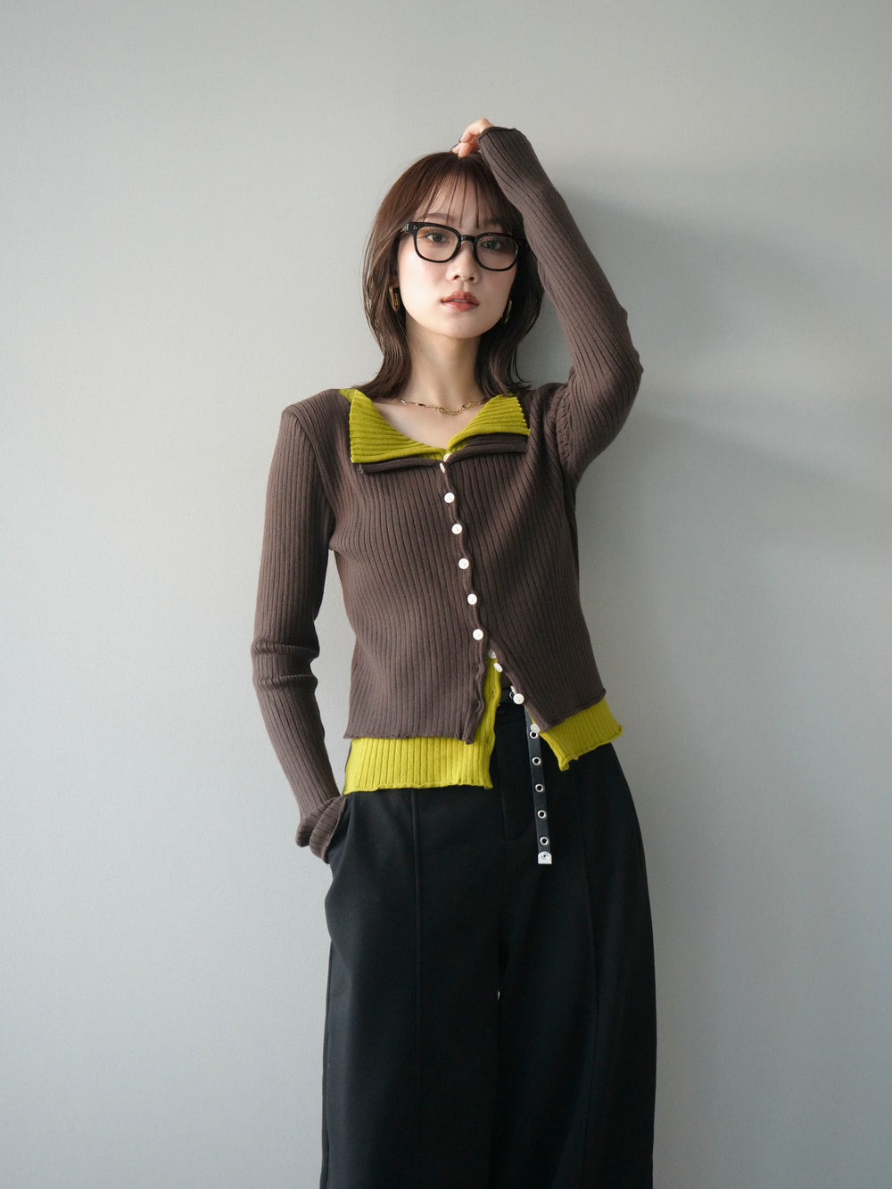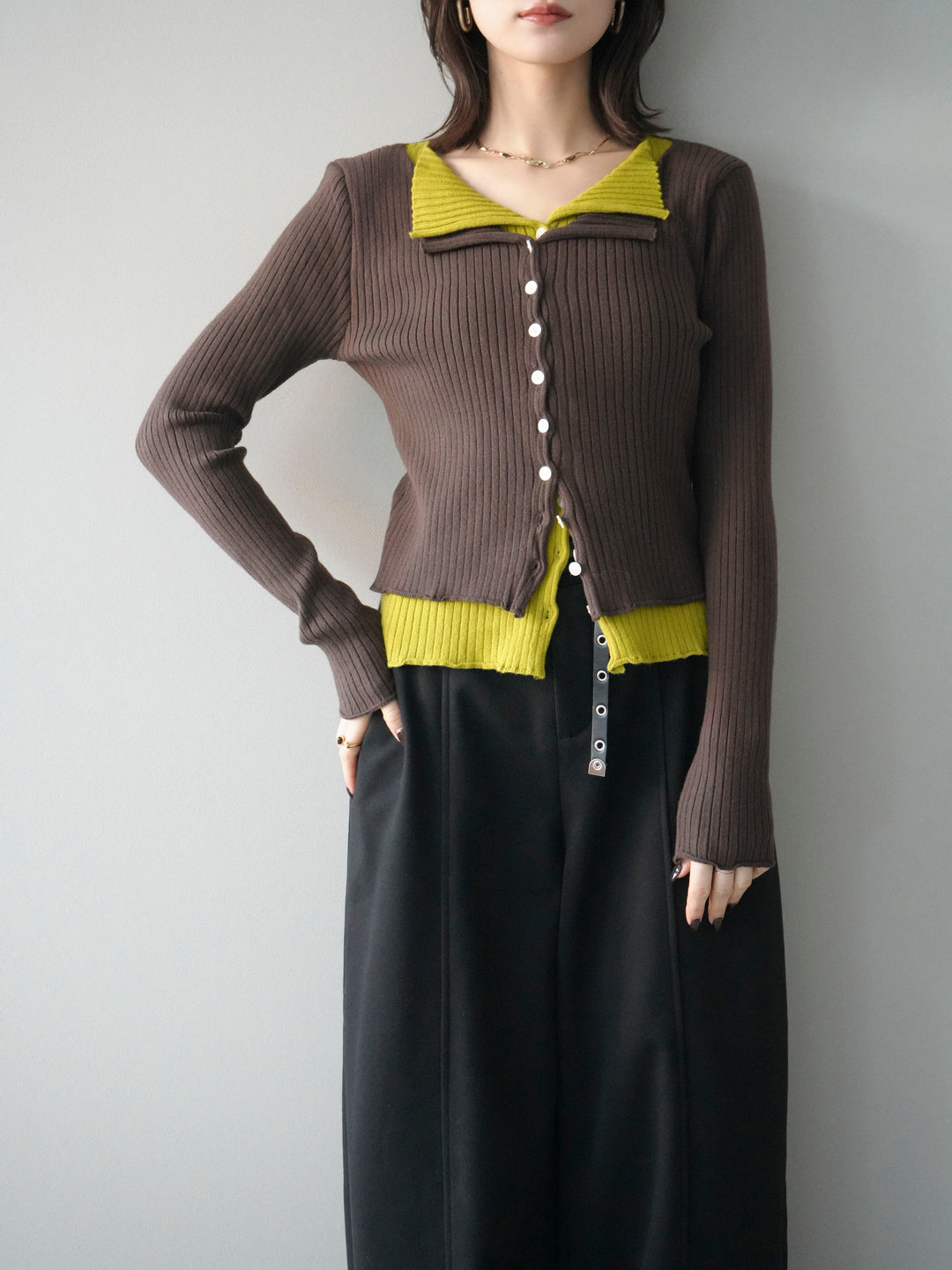 [予約]配色レイヤードリブニットカーディガン/brown