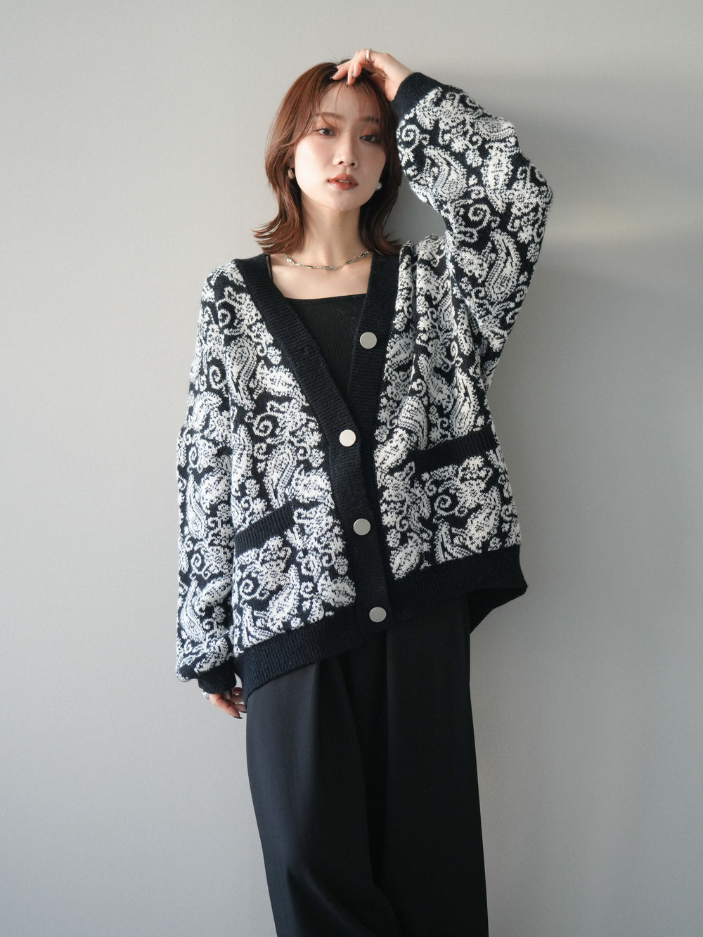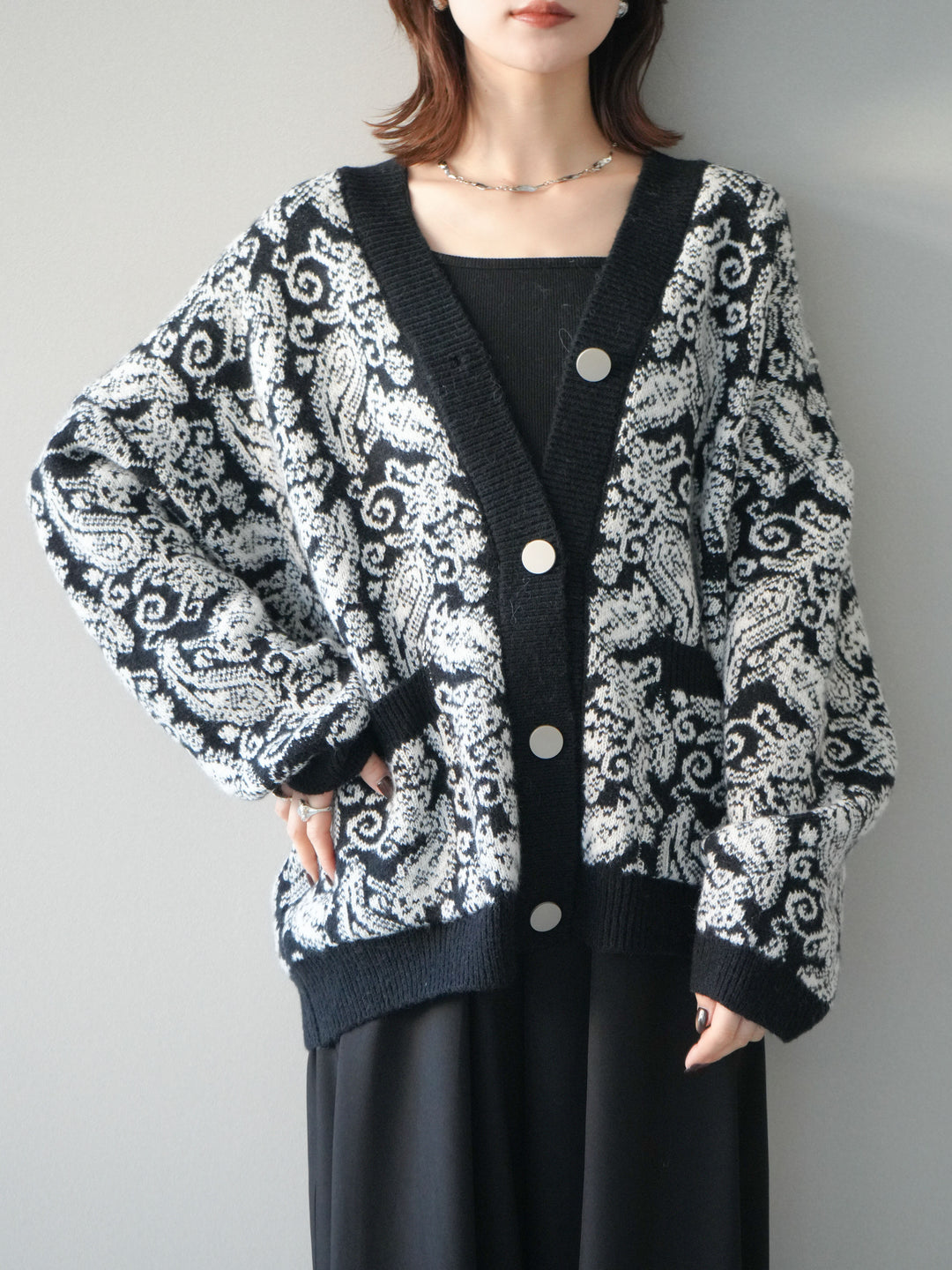 [予約]ペイズリー柄ニットカーディガン/black