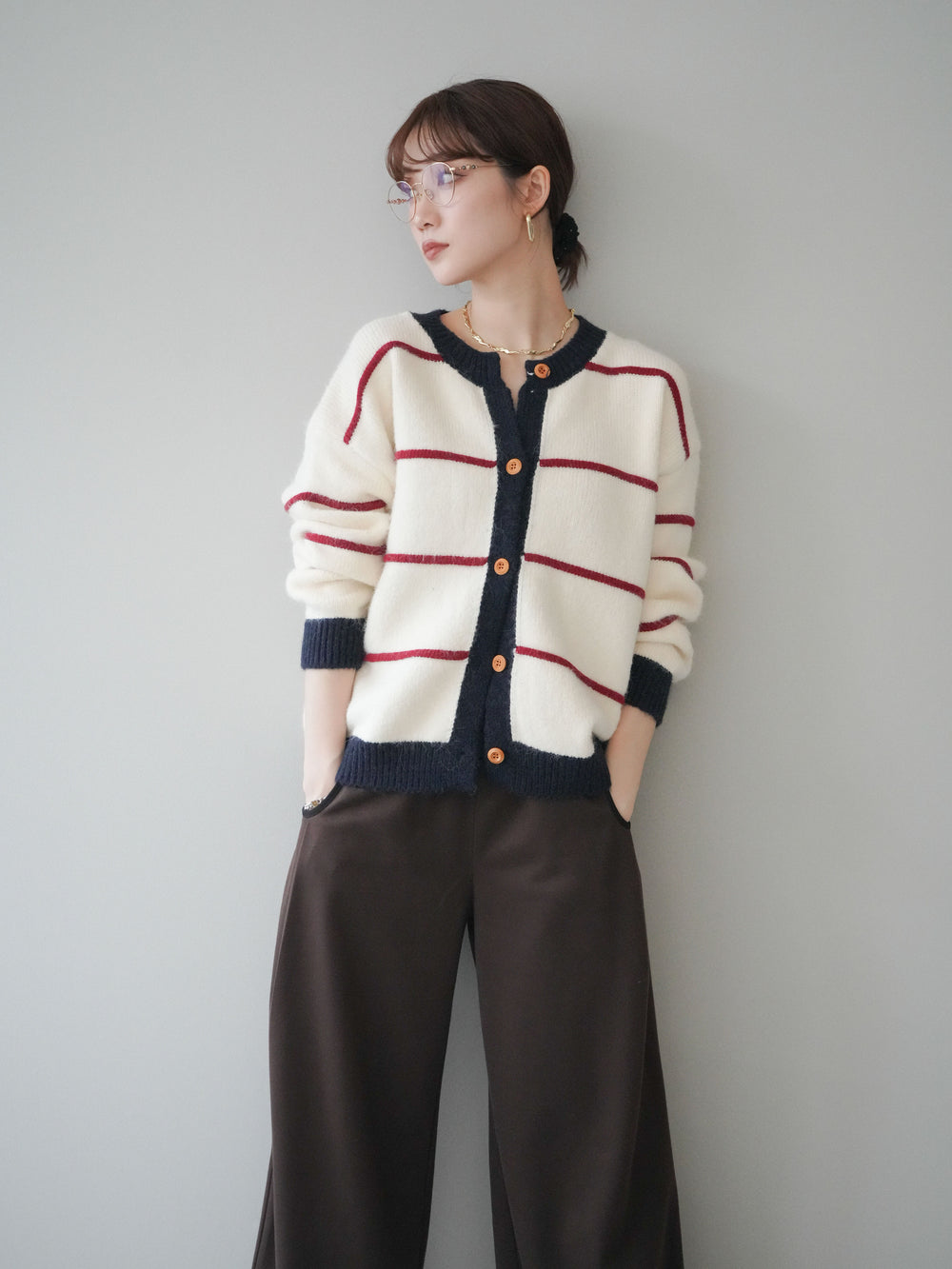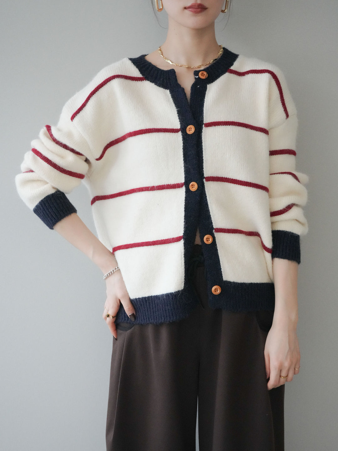 [予約]配色ボーダーニットカーディガン/red