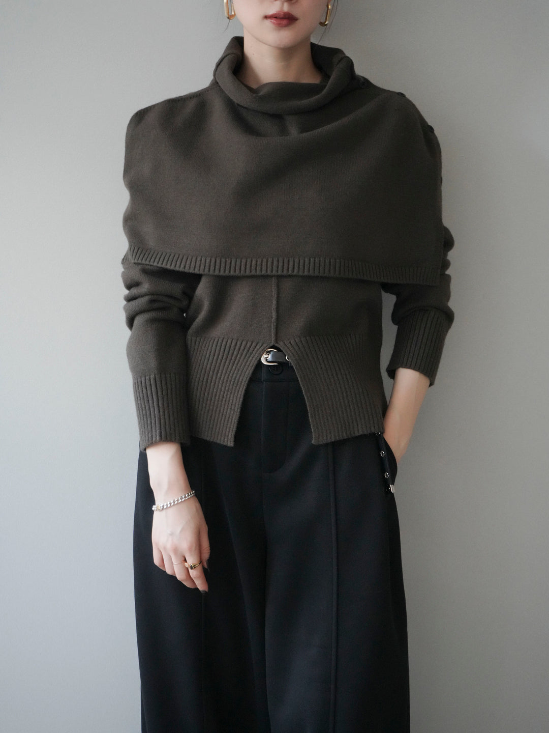 [予約]フロントスリットネックアンサンブルニット/khaki