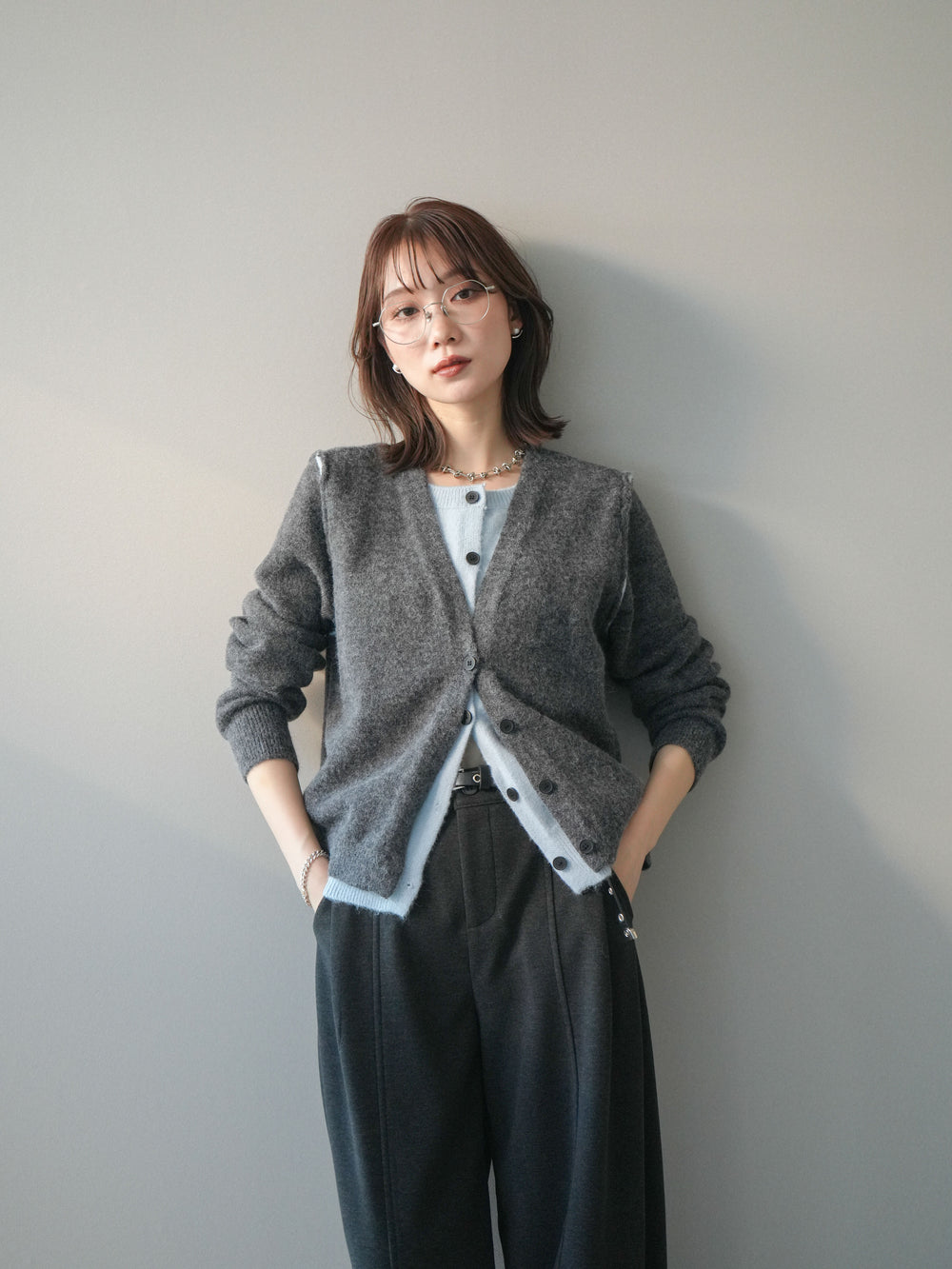 [予約]配色レイヤードニットカーディガン/gray