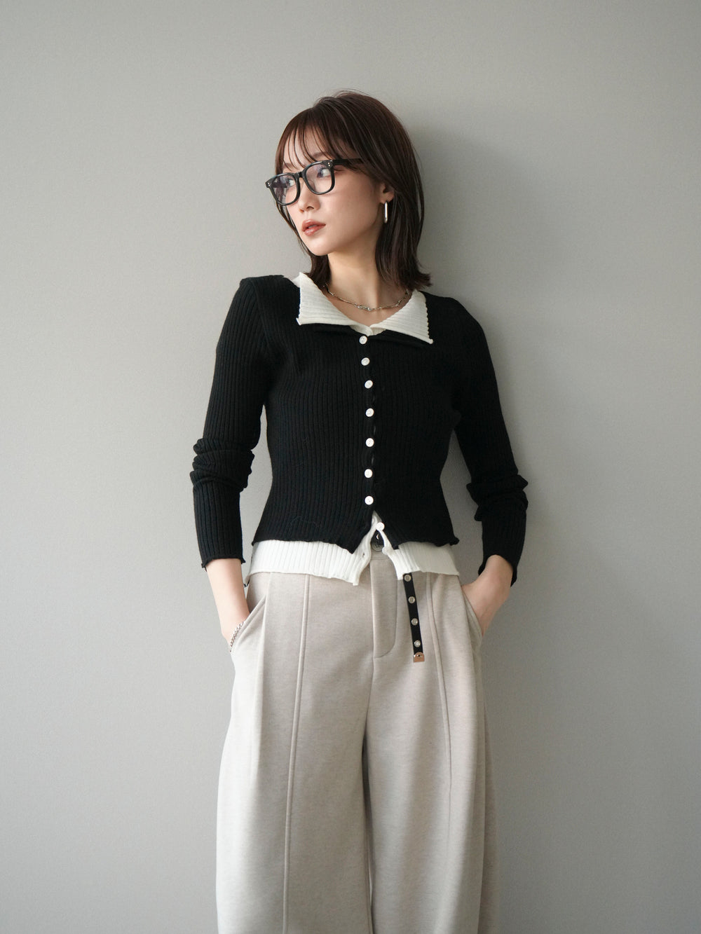 [予約]配色レイヤードリブニットカーディガン/black