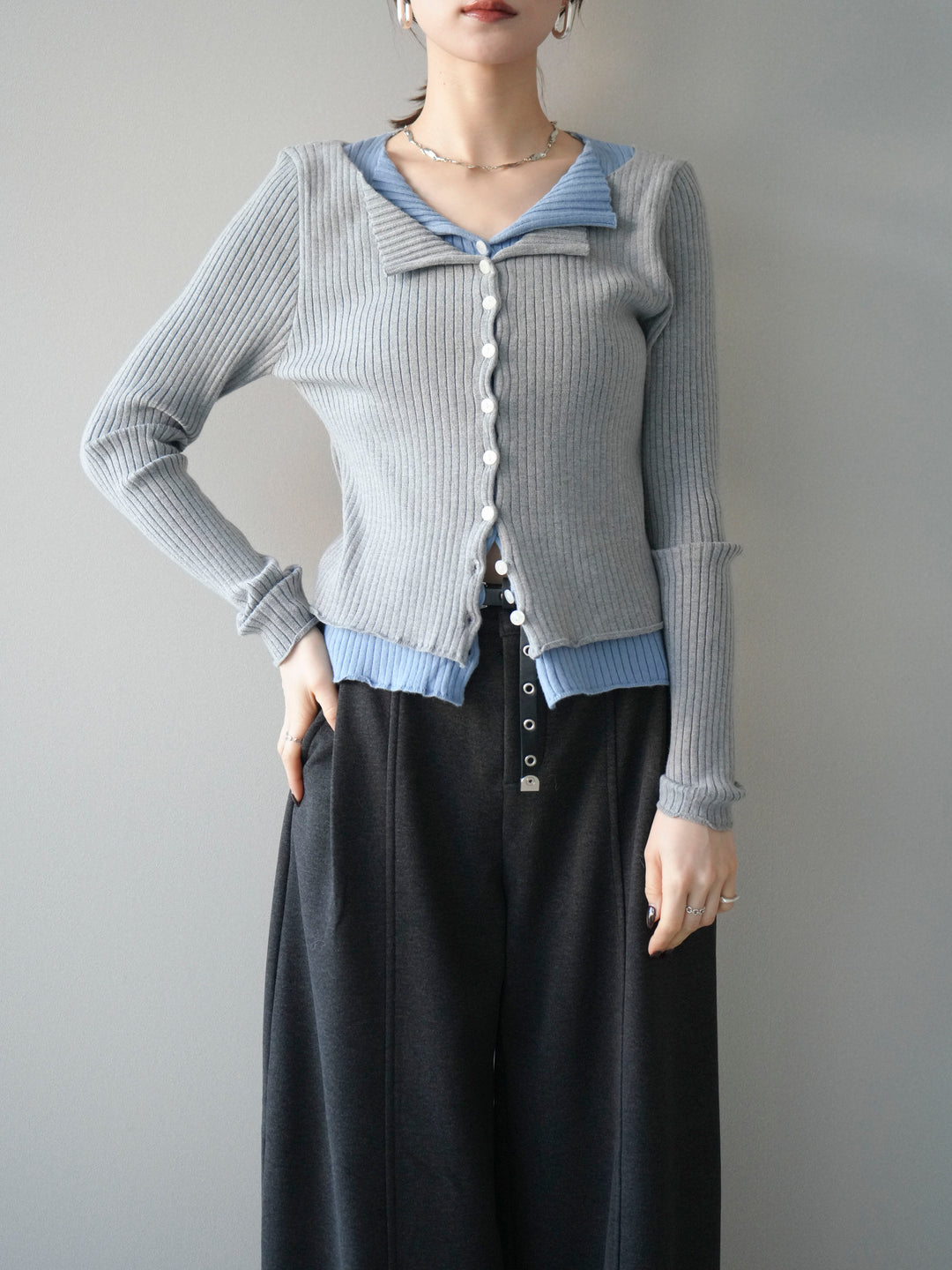 [予約]配色レイヤードリブニットカーディガン/gray