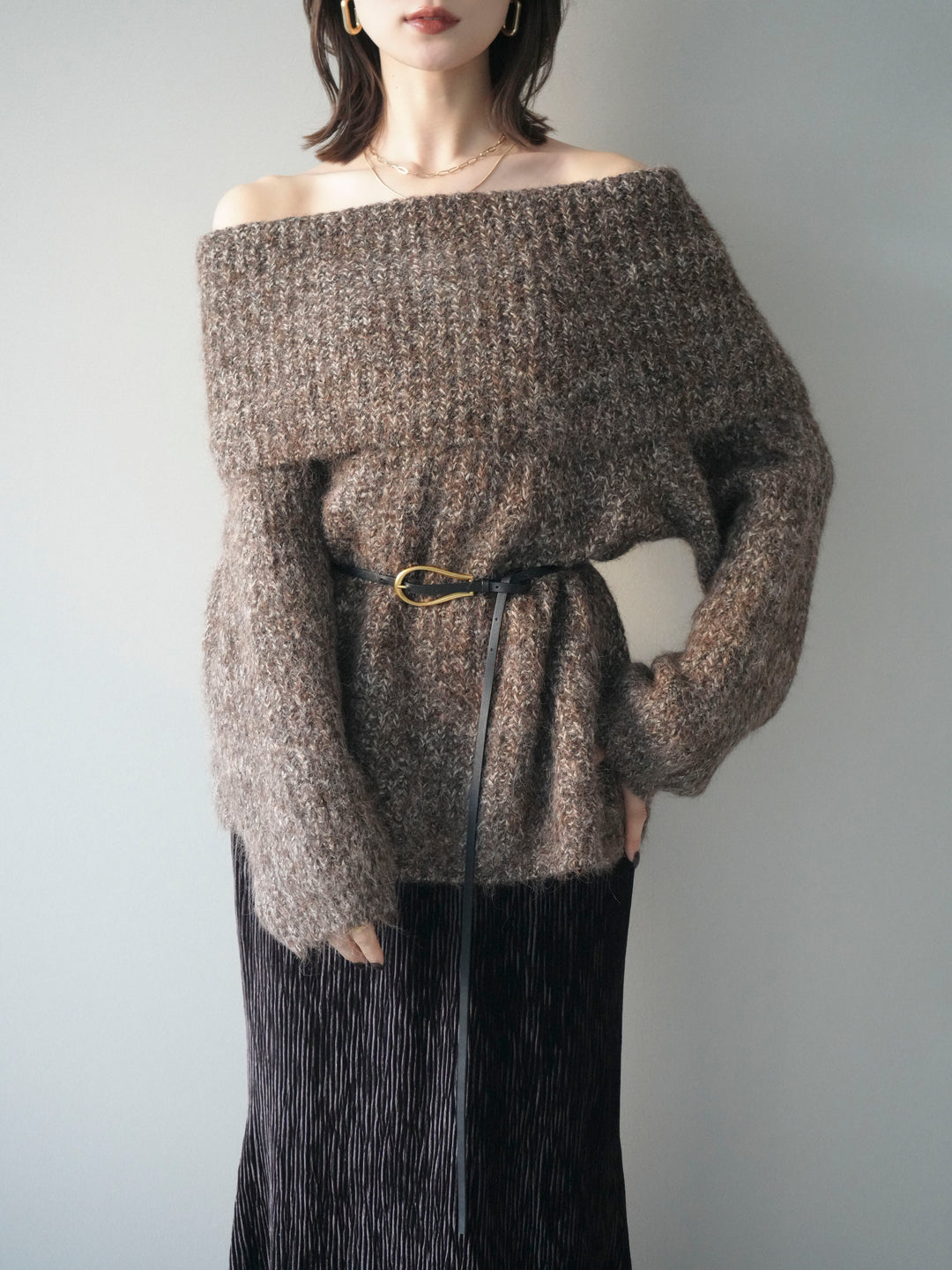 [予約]オフショルミックスニットプルオーバー/brown