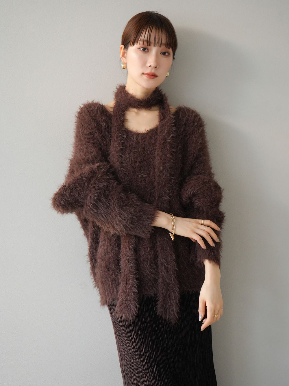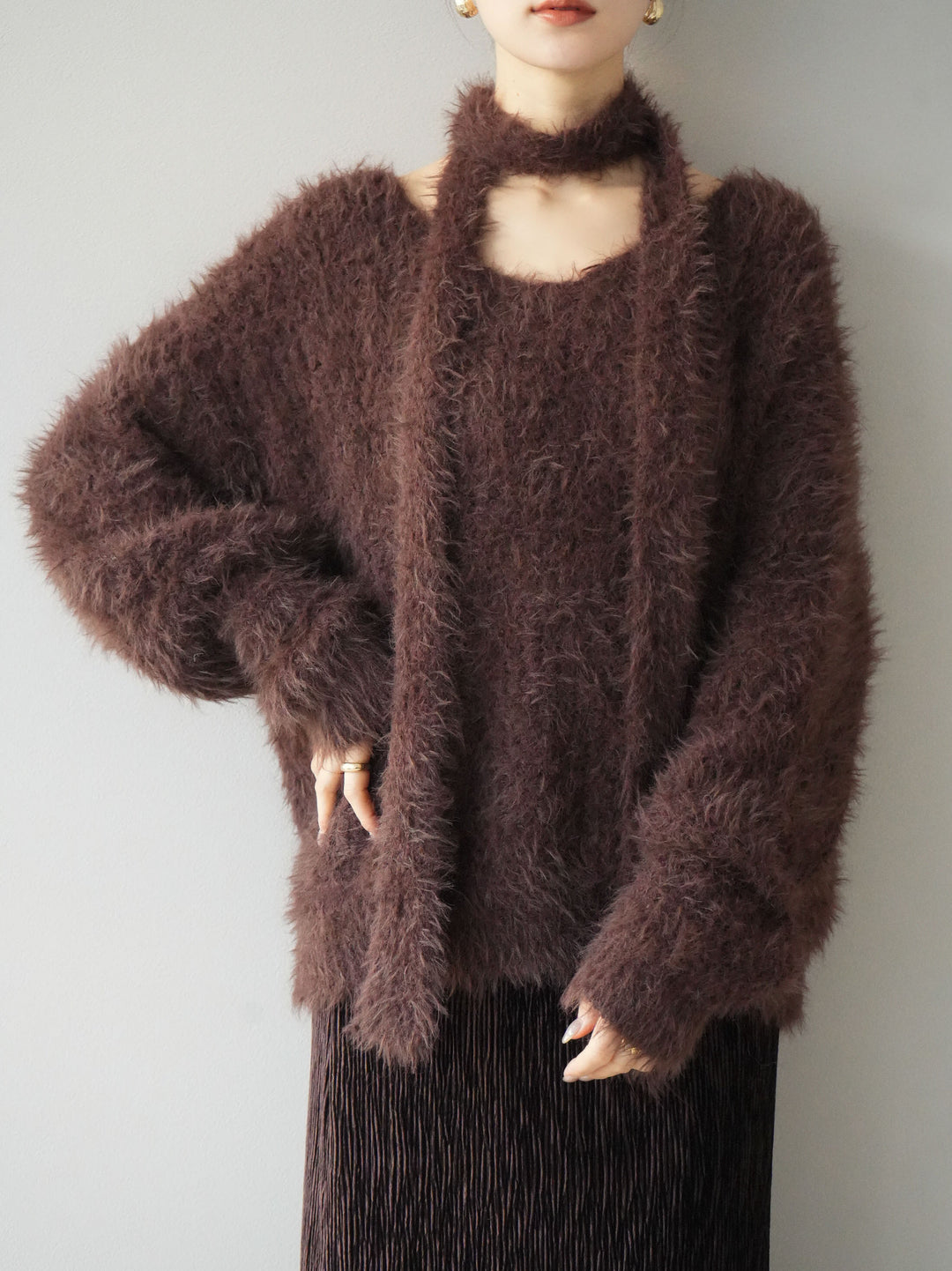 [予約]ストール付ミックスヤーンシャギーニット/ブラウン