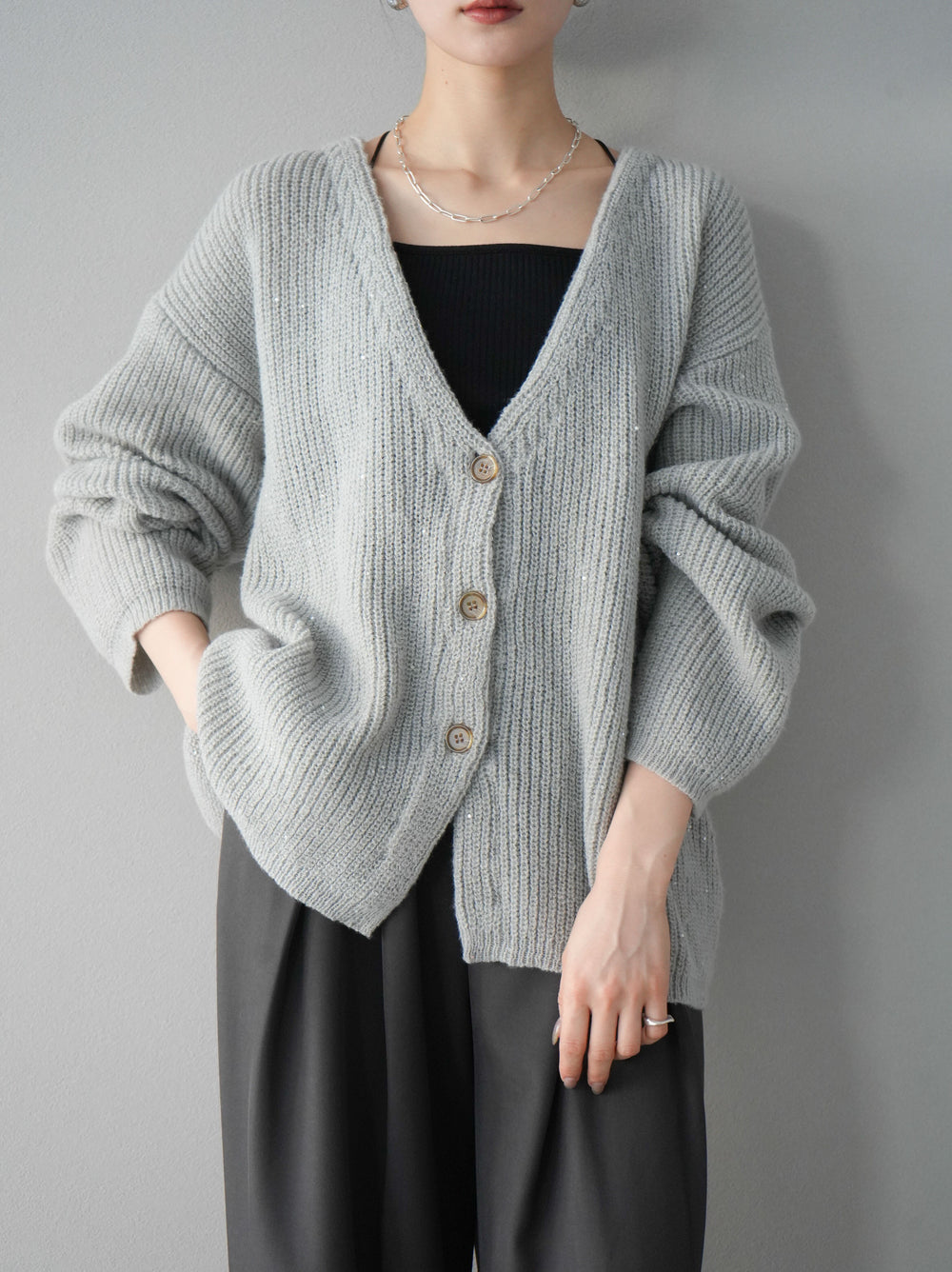 [予約]あぜ編みラメニットカーディガン/ライトグレー