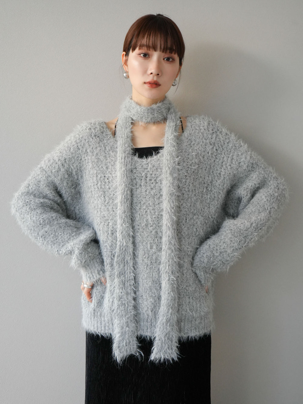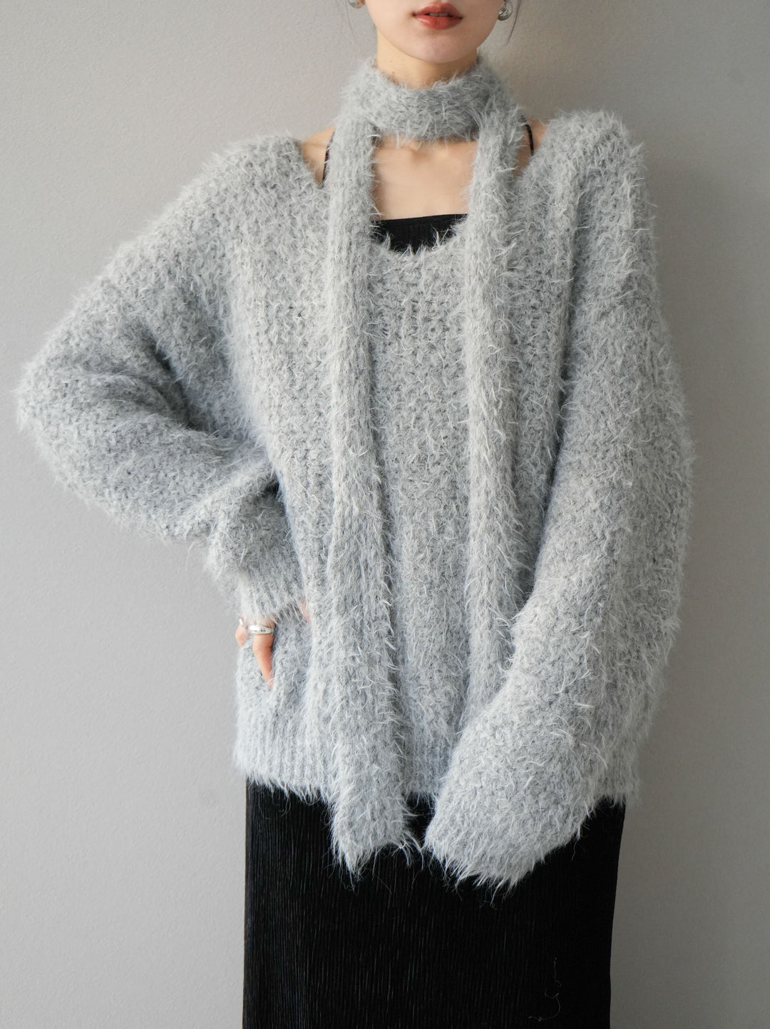 [予約]ストール付ミックスヤーンシャギーニット/グレー