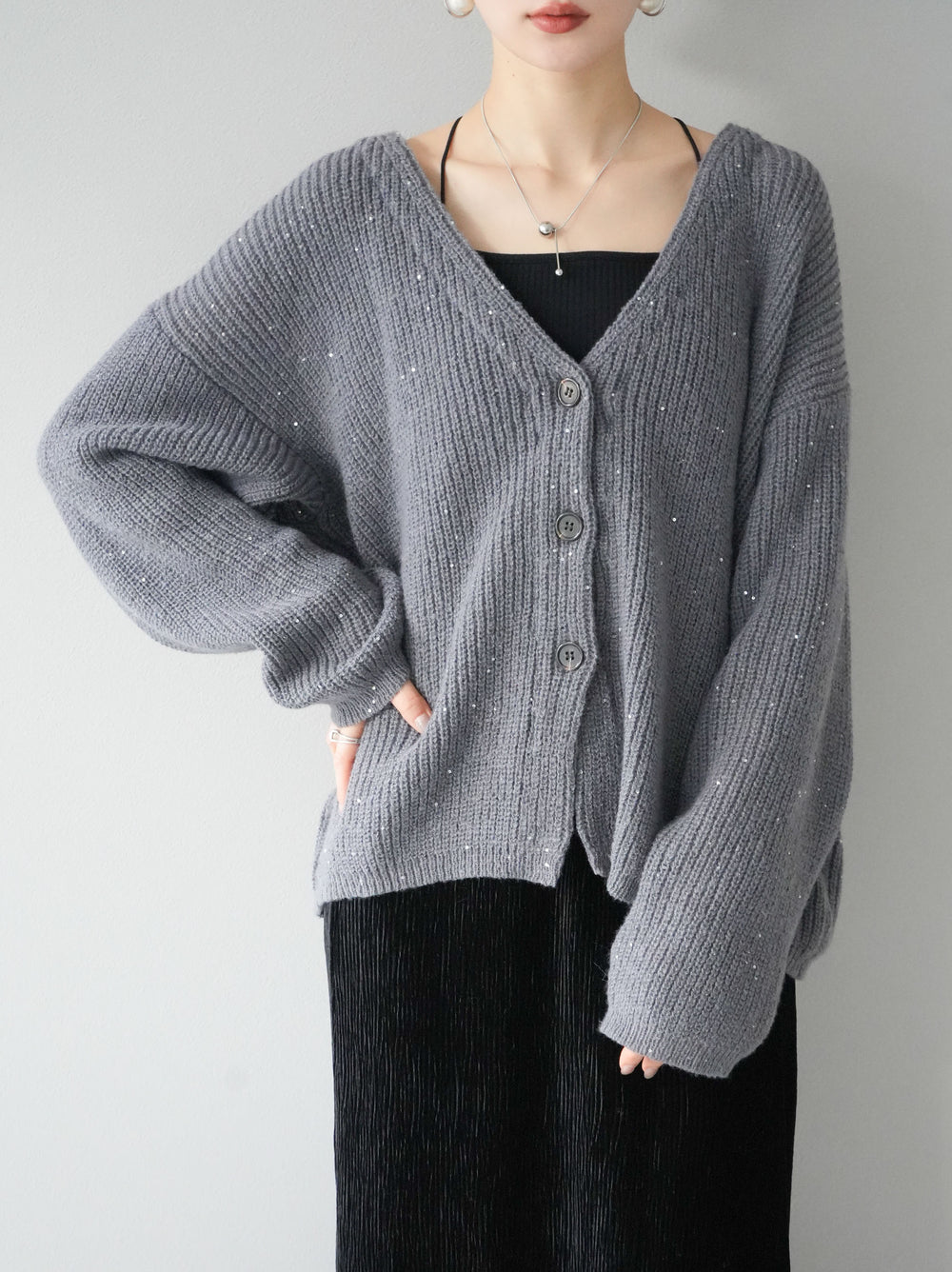 [予約]あぜ編みラメニットカーディガン/ダークグレー