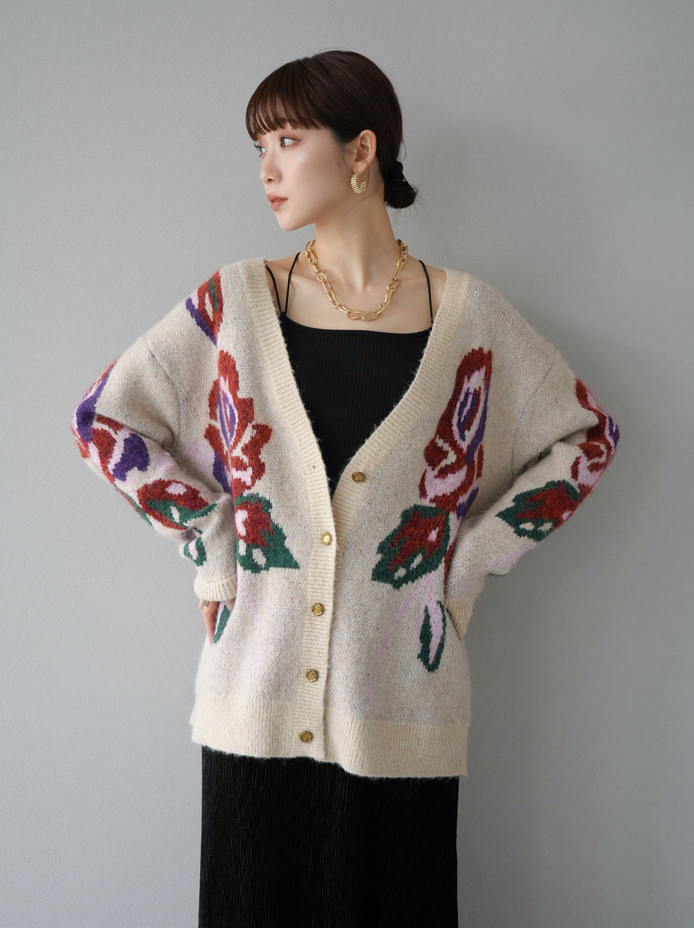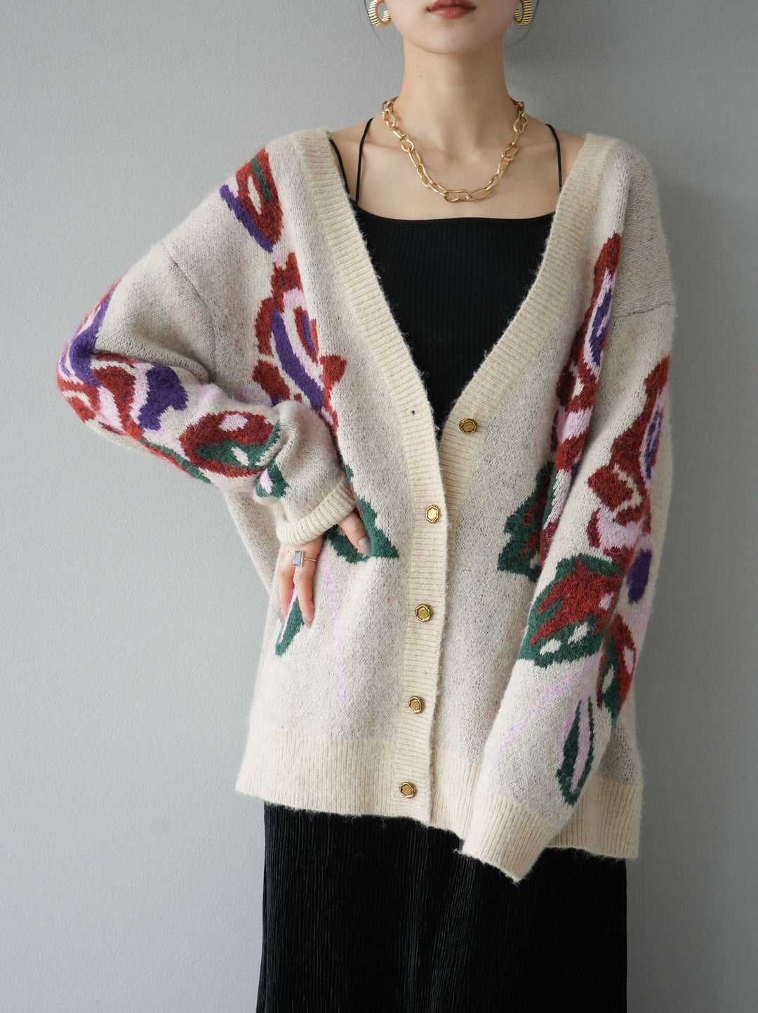 [予約]フラワー柄ゴールドボタンVネックニットカーディガン/アイボリー