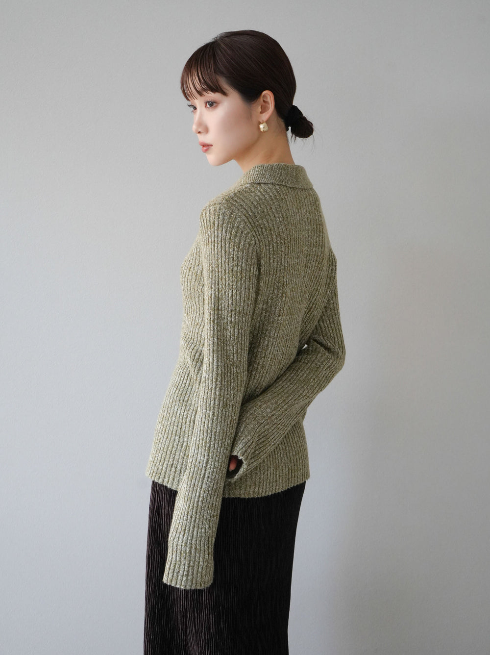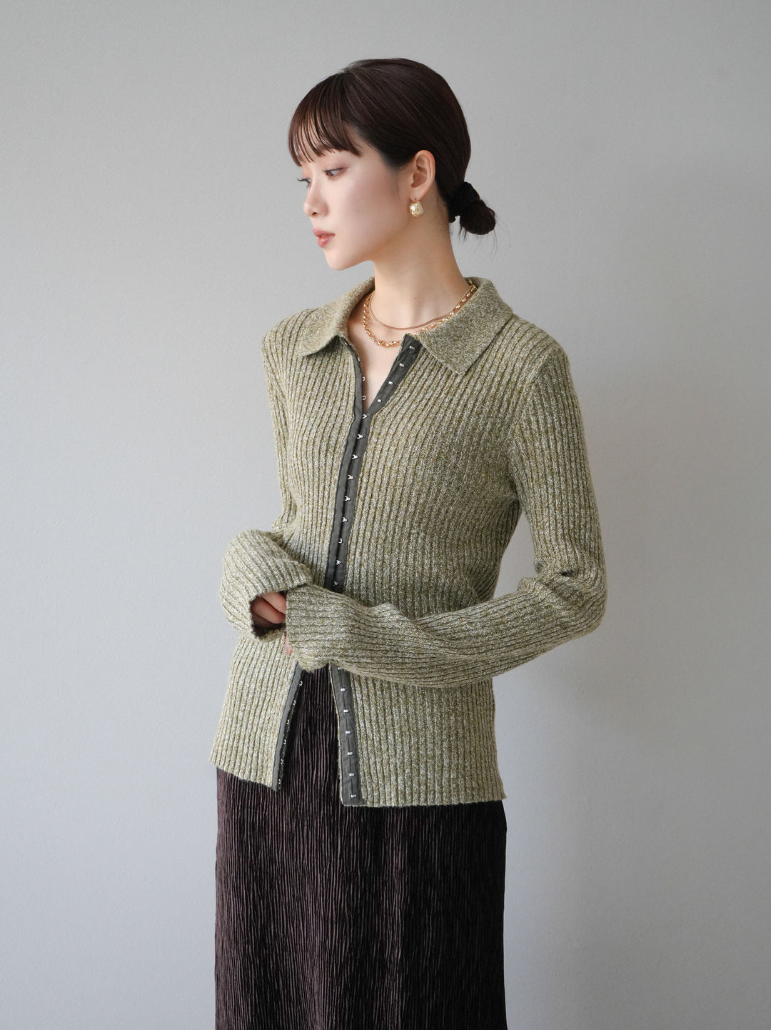 [予約]ホックディティール襟付きニットカーディガン/グリーン