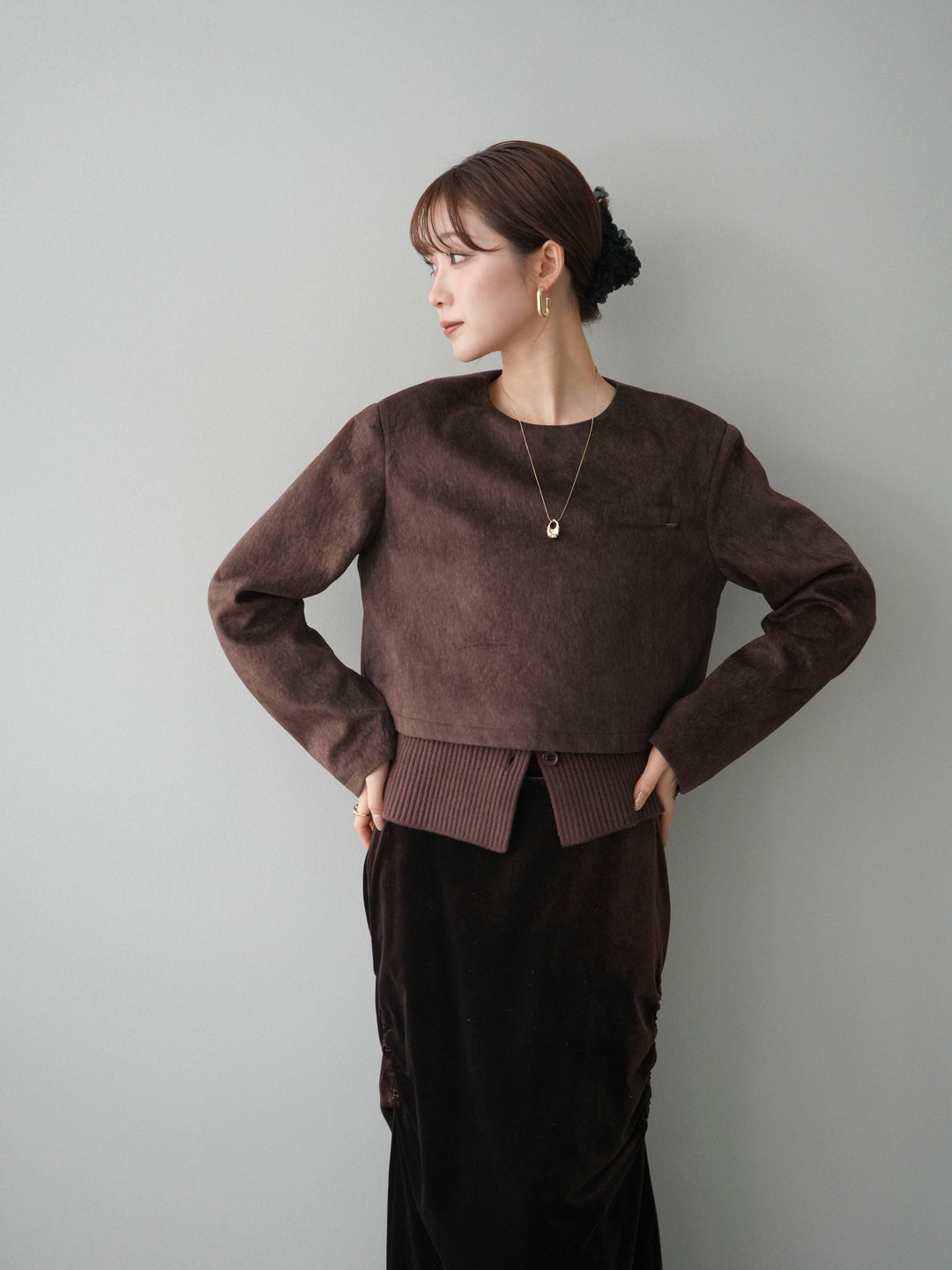 [予約]リブニットレイヤードスエードプルオーバー/brown