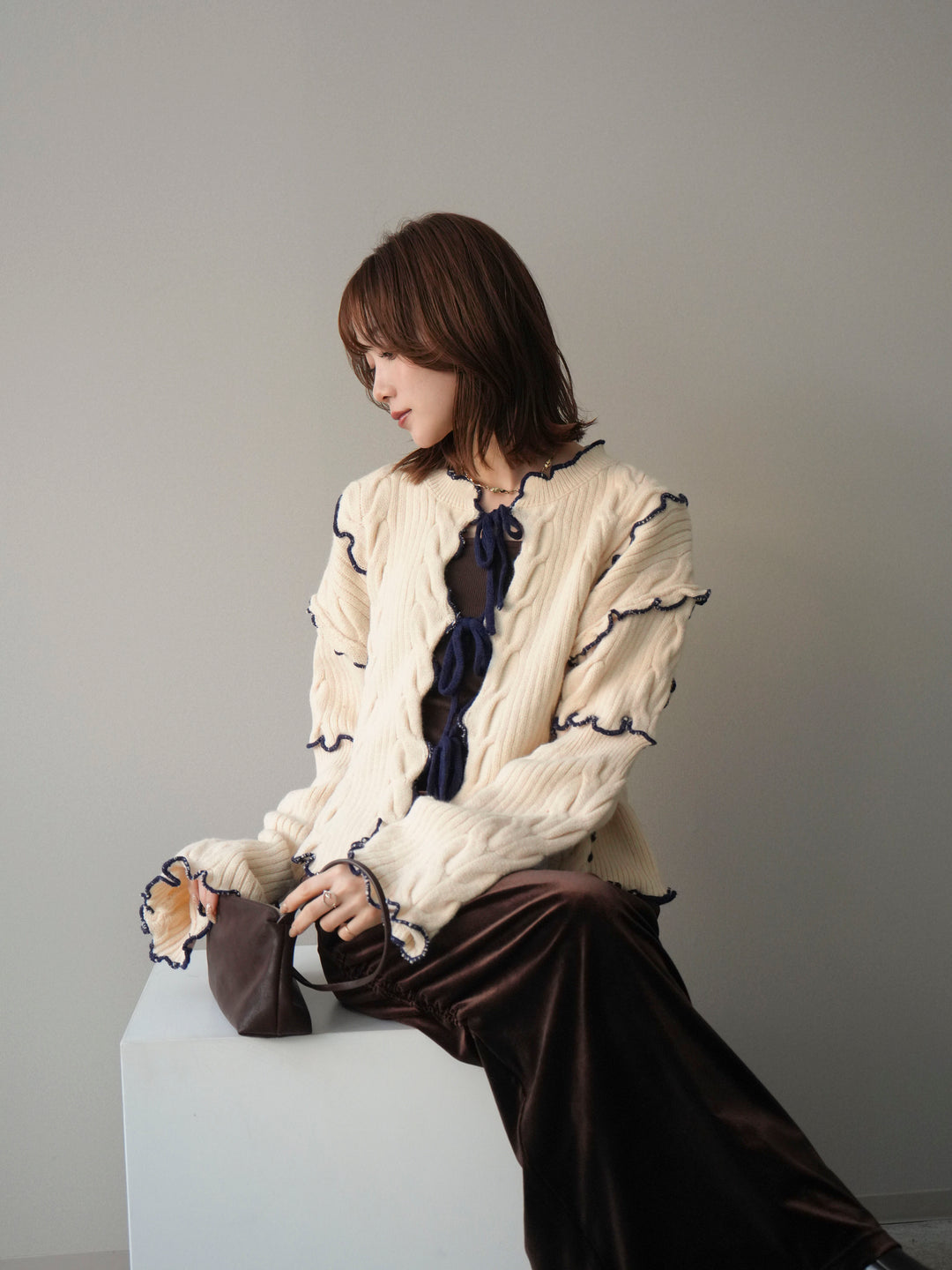 [予約]フロントリボン配色メローニットカーディガン/ivory