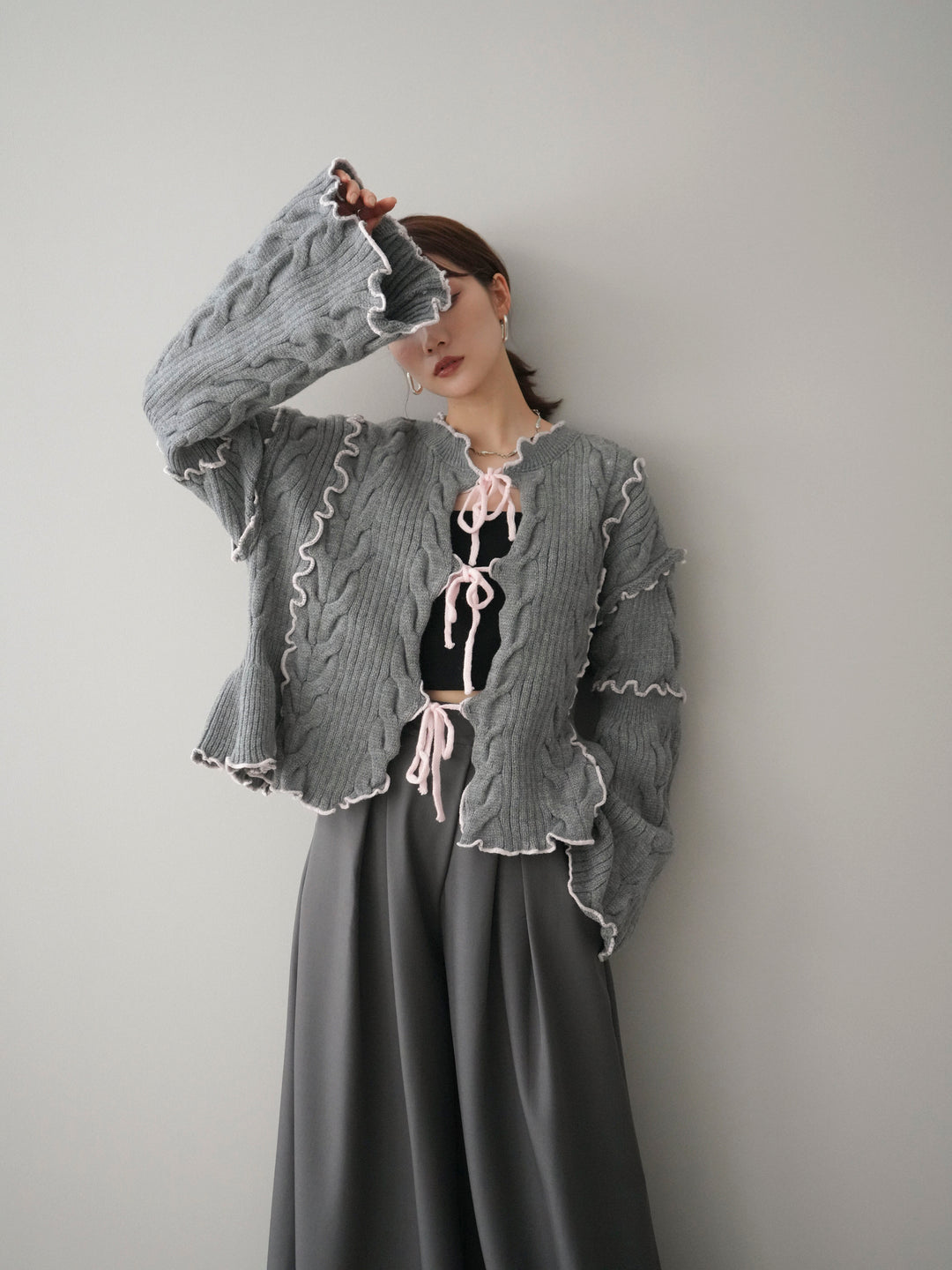 [予約]フロントリボン配色メローニットカーディガン/gray
