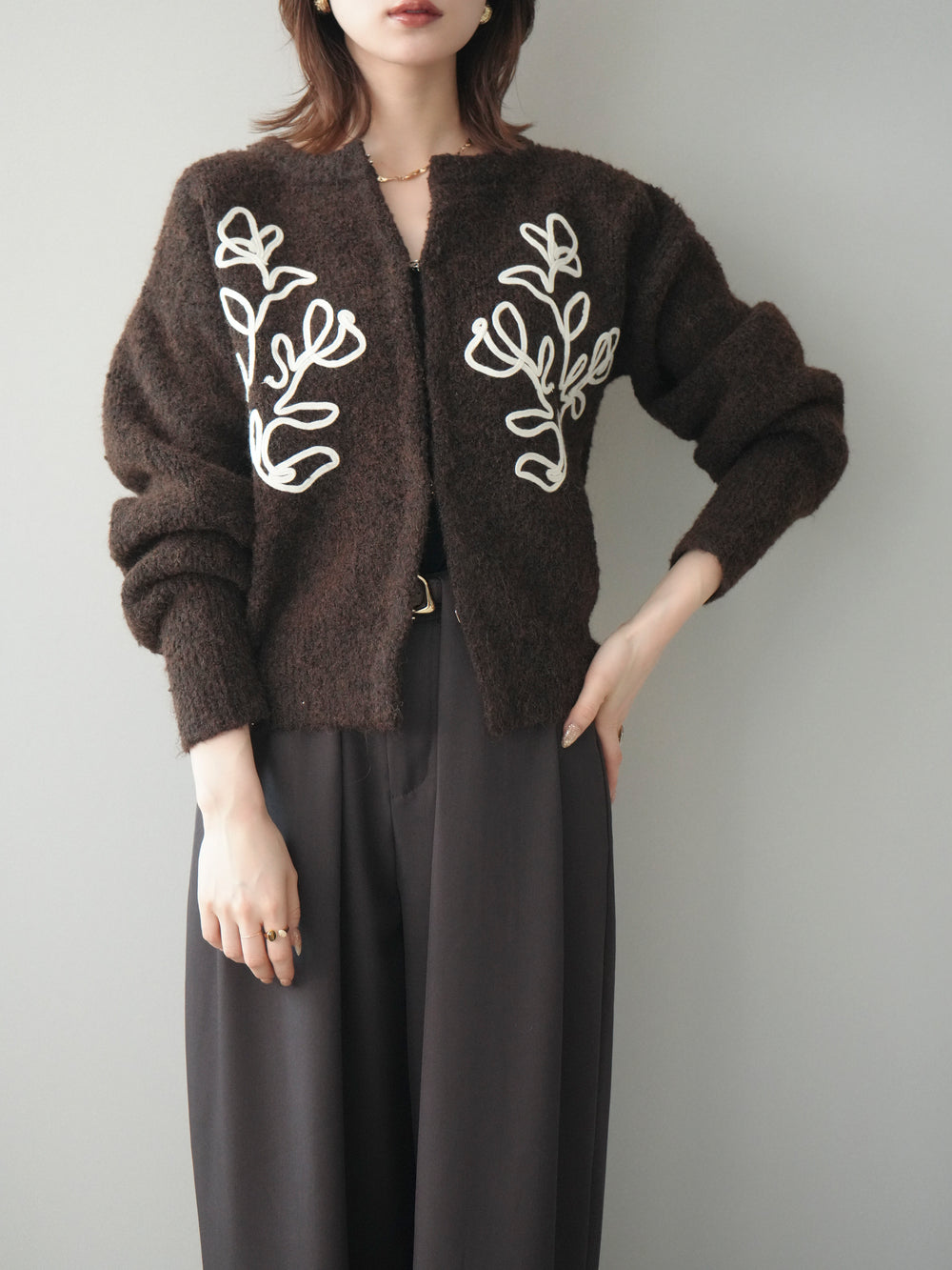 [予約]テープ刺繍ホック開きブークレニットカーディガン/darkbrown
