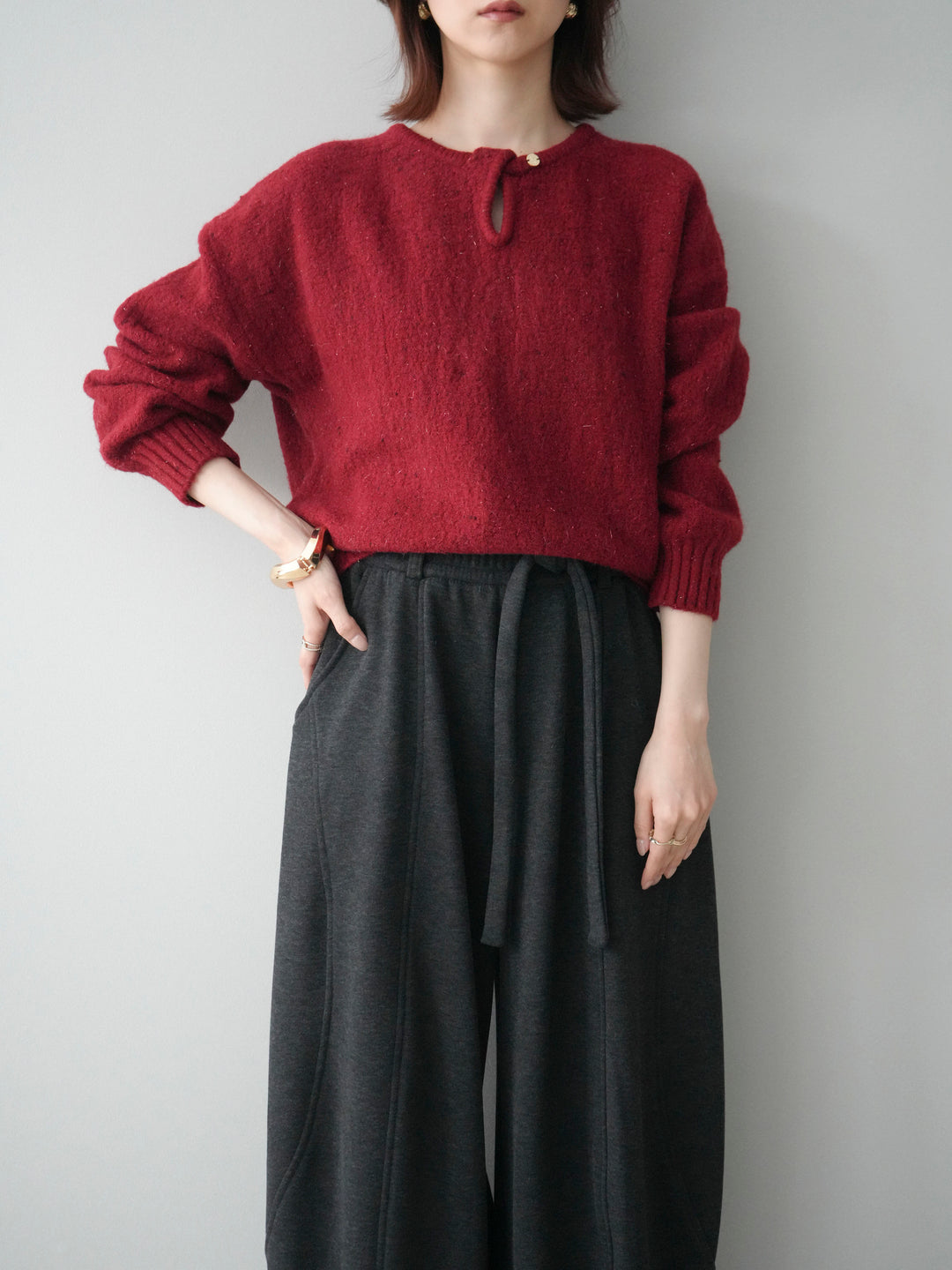[予約]ツイストネックラメネップヤーンニットプルオーバー/red