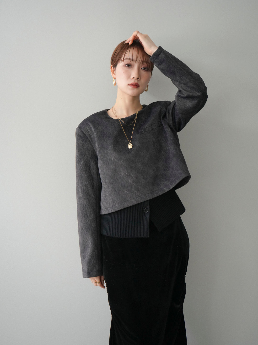 [予約]リブニットレイヤードスエードプルオーバー/charcoal