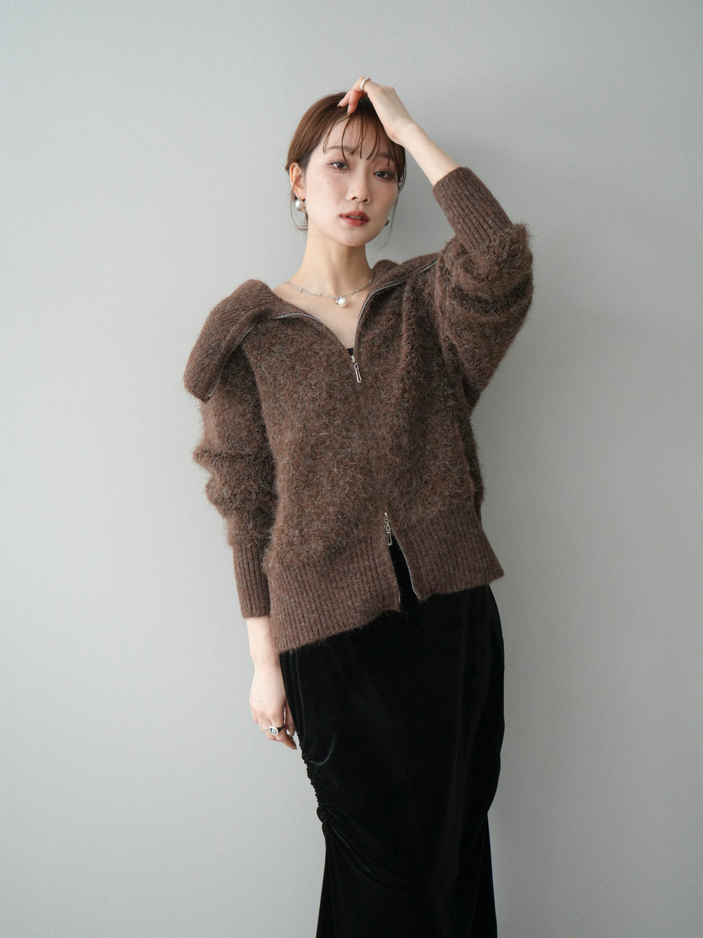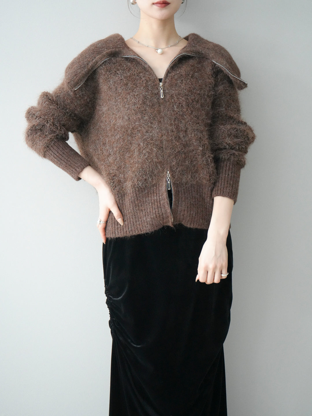 [予約]リブ襟ブークレZIPニットカーディガン/brown