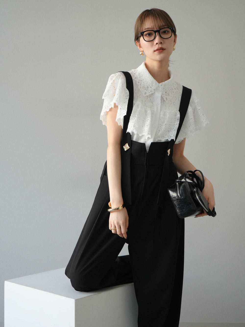 [SET]ラッフルレースノースリーブブラウス+ゴールドボタンサスペンダーワイドパンツ(2set)