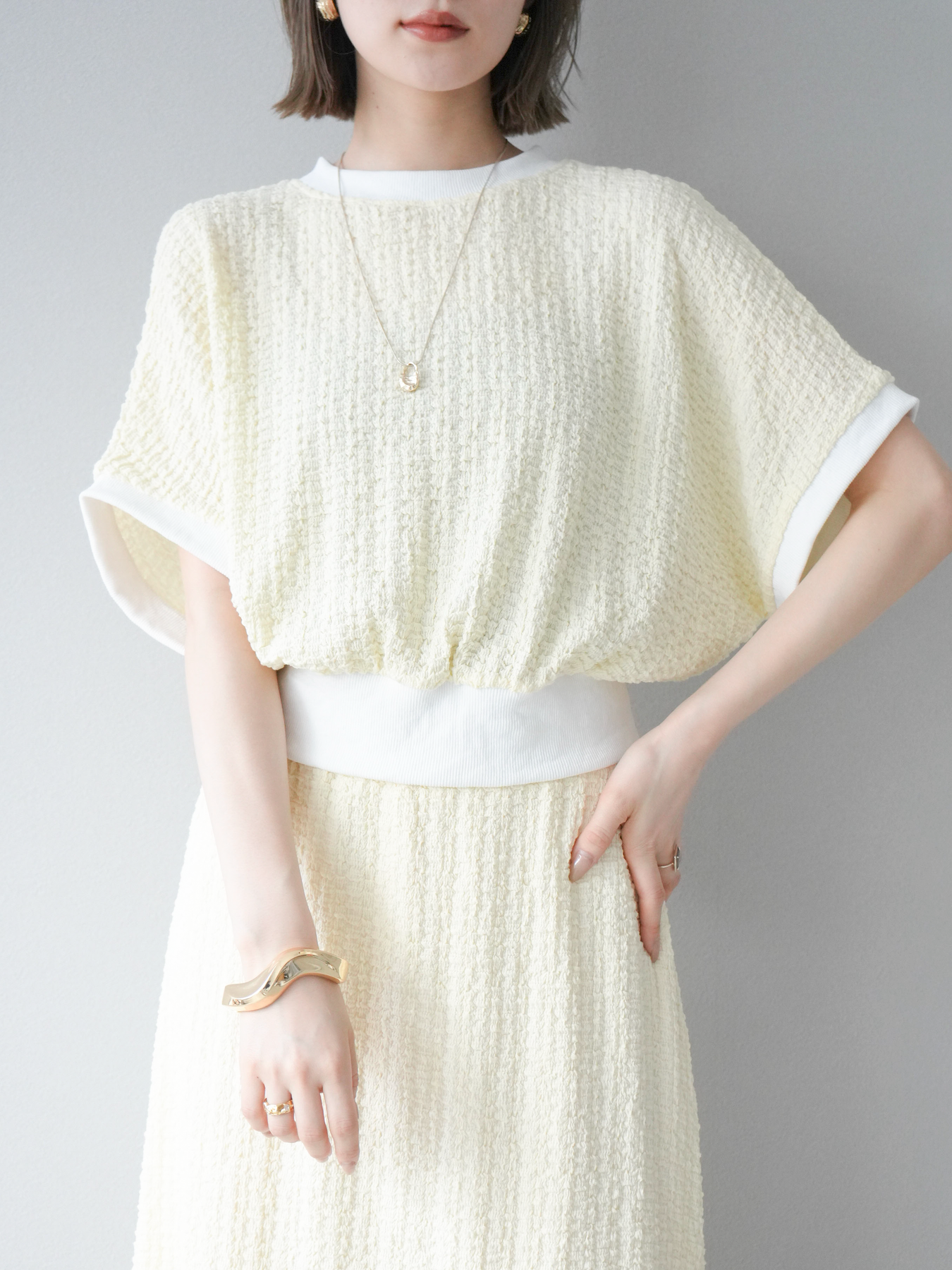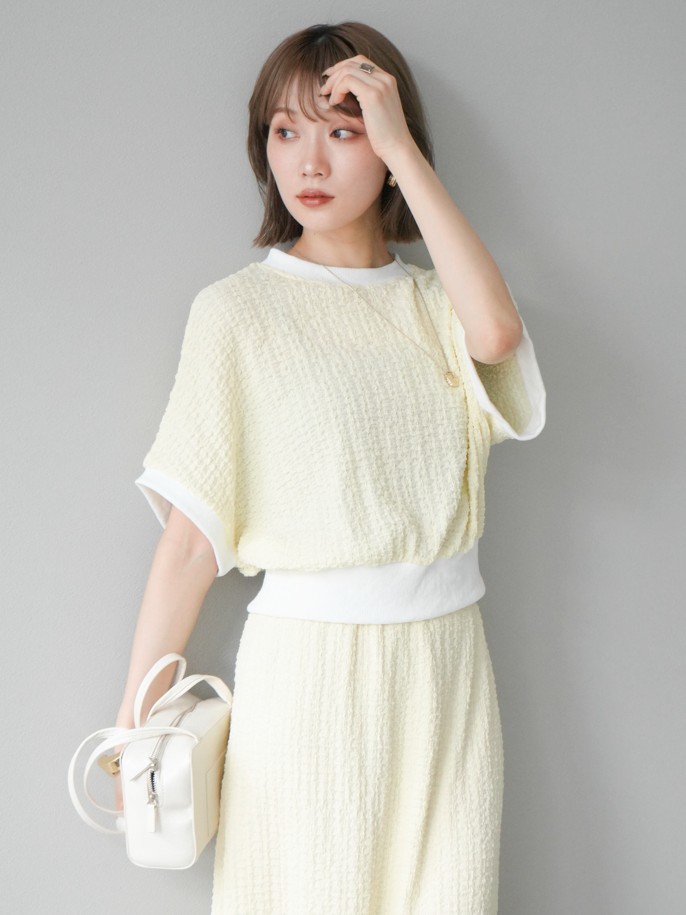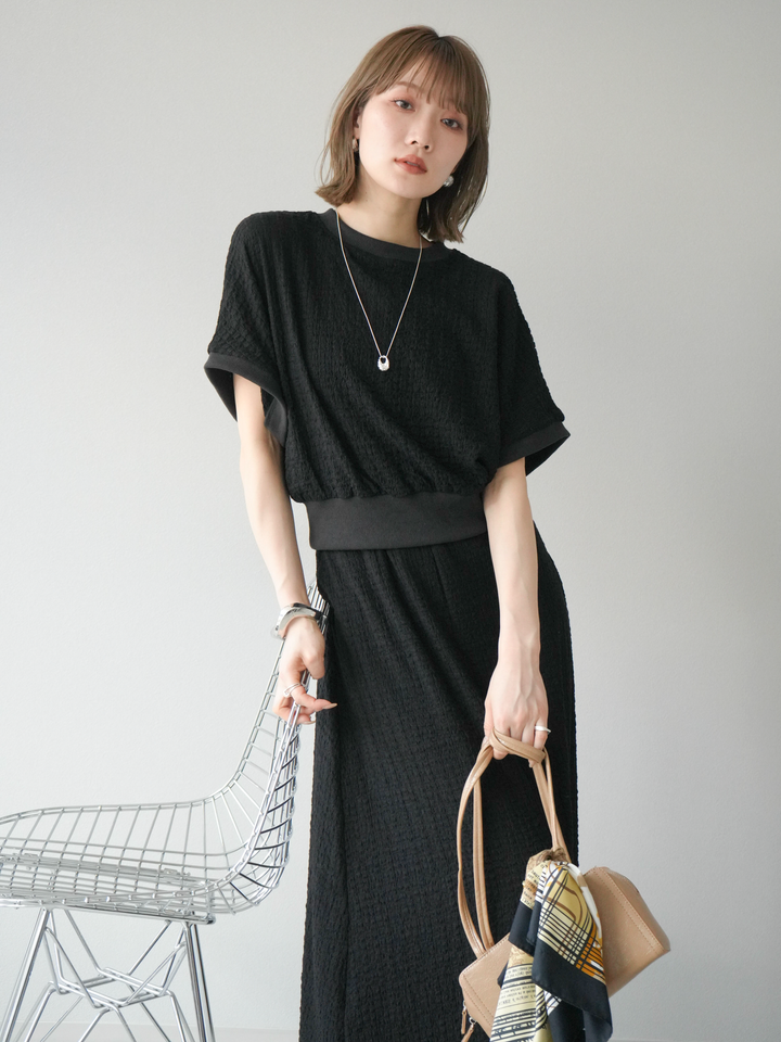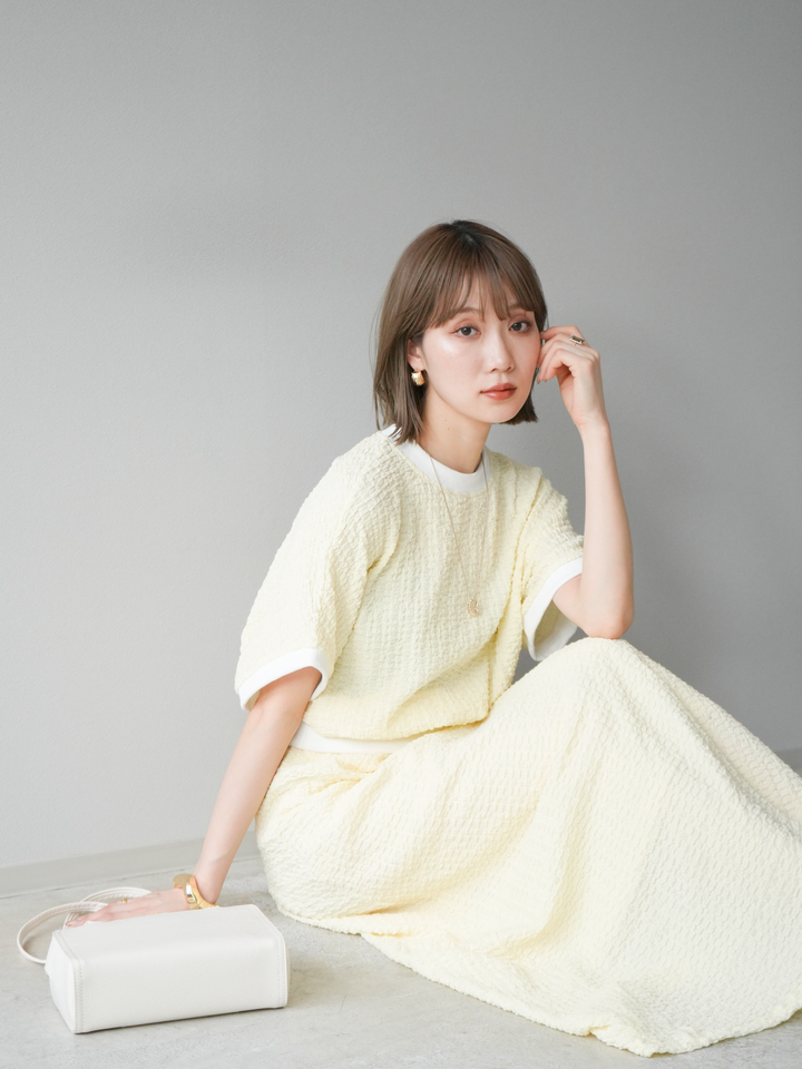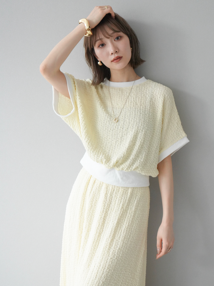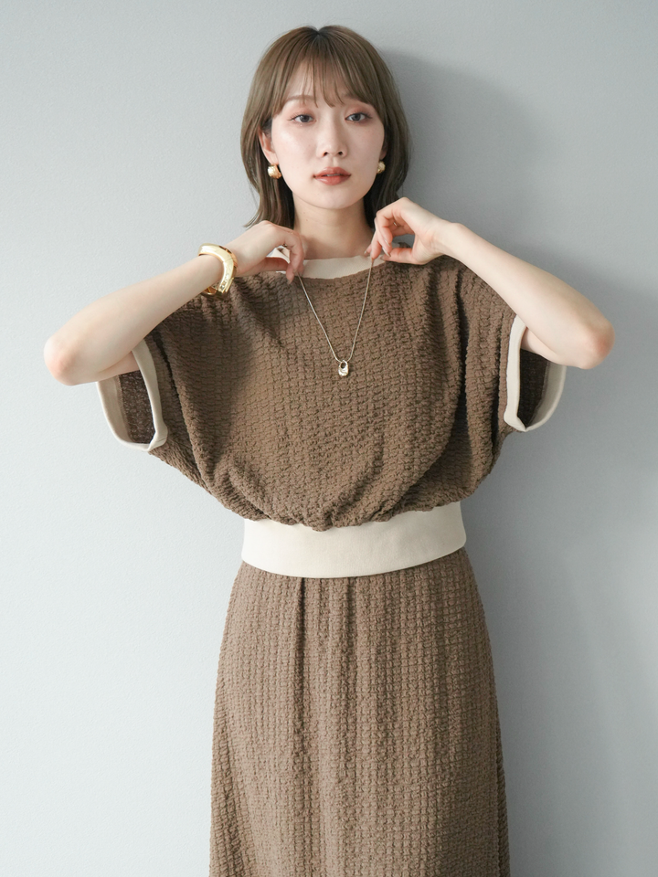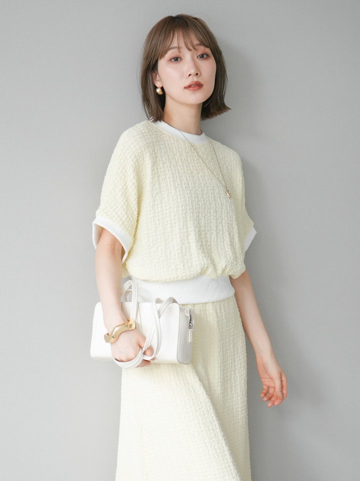 立体感のある膨れジャガード素材を使用したバイカラーデザインのプルオーバー。シンプルながらも表情のある素材感と、袖口・裾の切り替えがアクセントに。ゆとりのあるシルエットでラフに着られ、カジュアルながらも洗練された印象に仕上がります。ワイドパンツやデニムとの相性も◎。トレンドを意識したデイリースタイルにおすすめの一着です。 ※ボトムス、キャミソール(インナー)以外の商品は一律でインナーは付属していません
