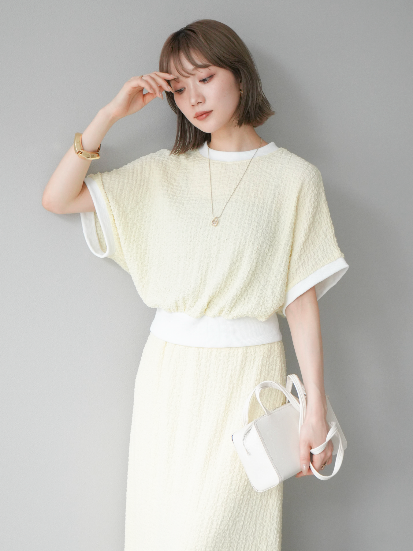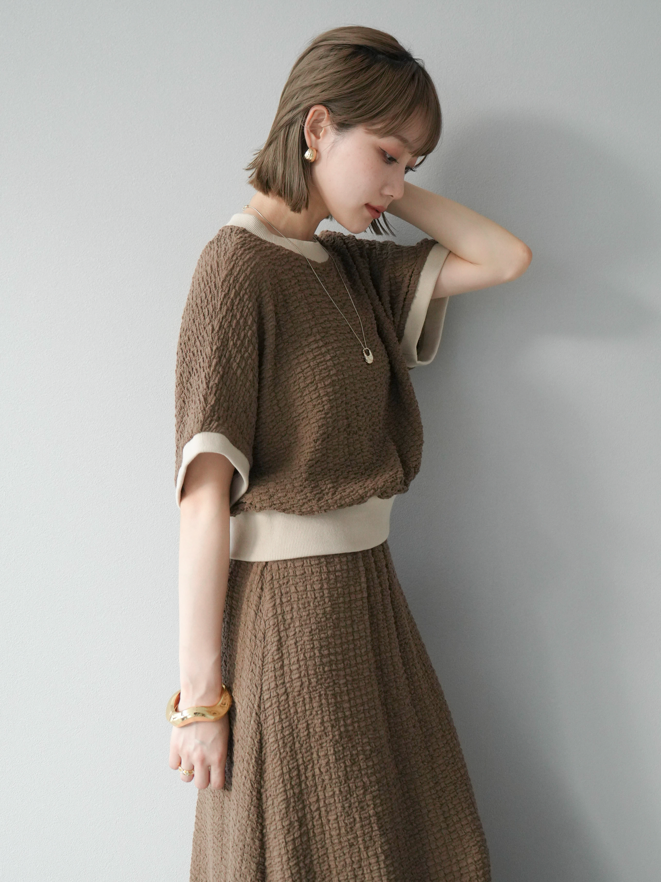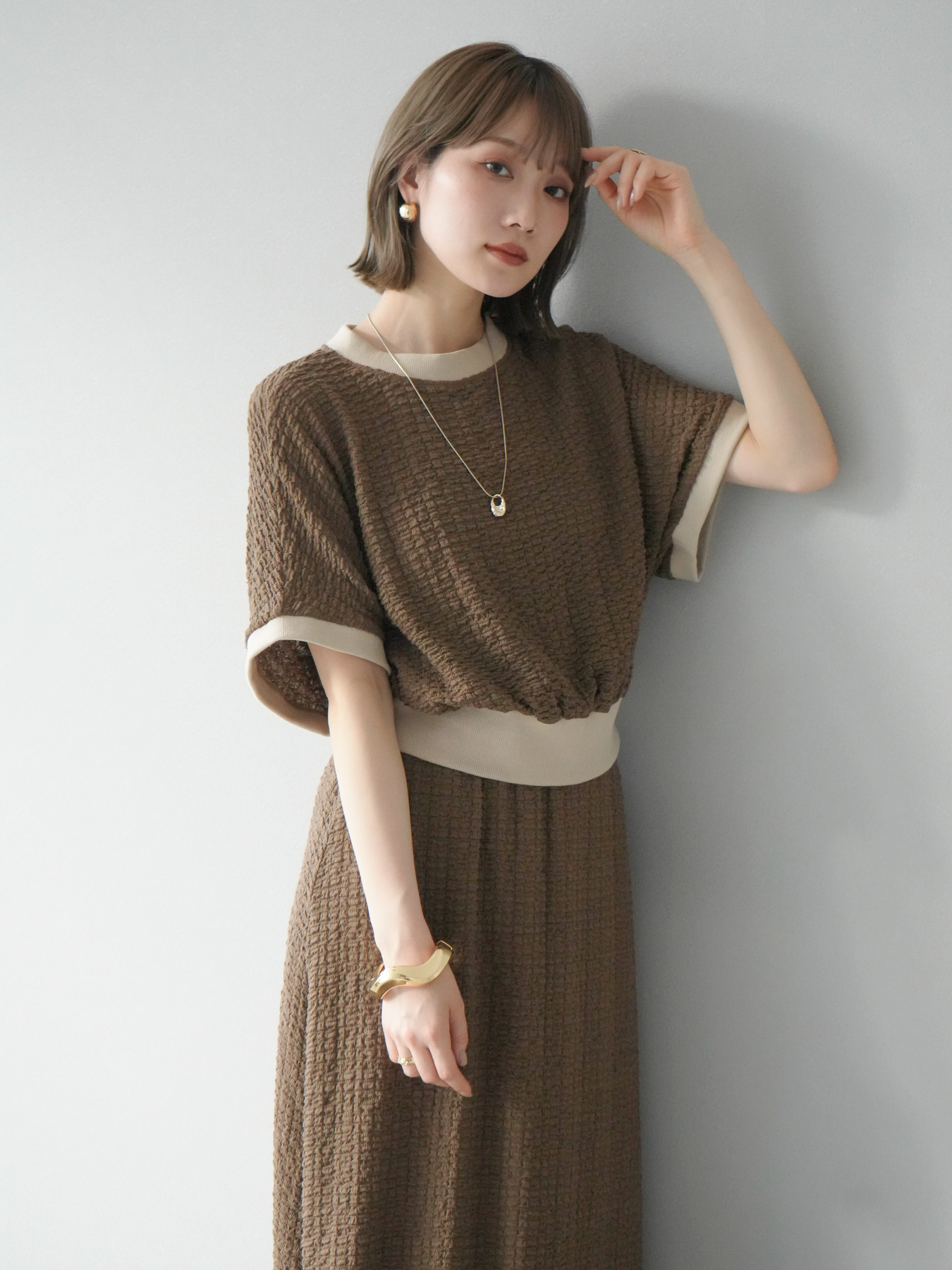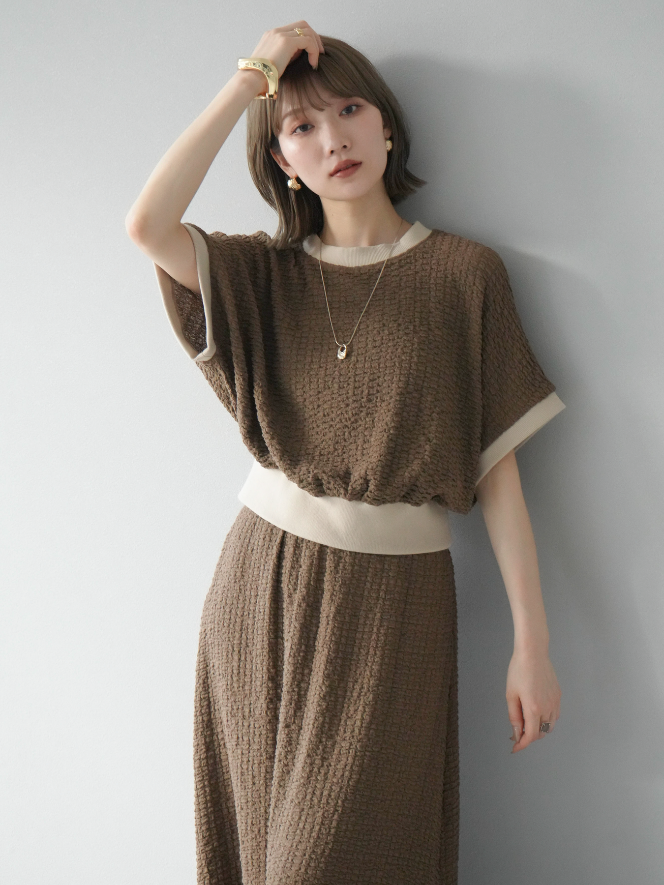 立体感のある膨れジャガード素材を使用したバイカラーデザインのプルオーバー。シンプルながらも表情のある素材感と、袖口・裾の切り替えがアクセントに。ゆとりのあるシルエットでラフに着られ、カジュアルながらも洗練された印象に仕上がります。ワイドパンツやデニムとの相性も◎。トレンドを意識したデイリースタイルにおすすめの一着です。 ※ボトムス、キャミソール(インナー)以外の商品は一律でインナーは付属していません