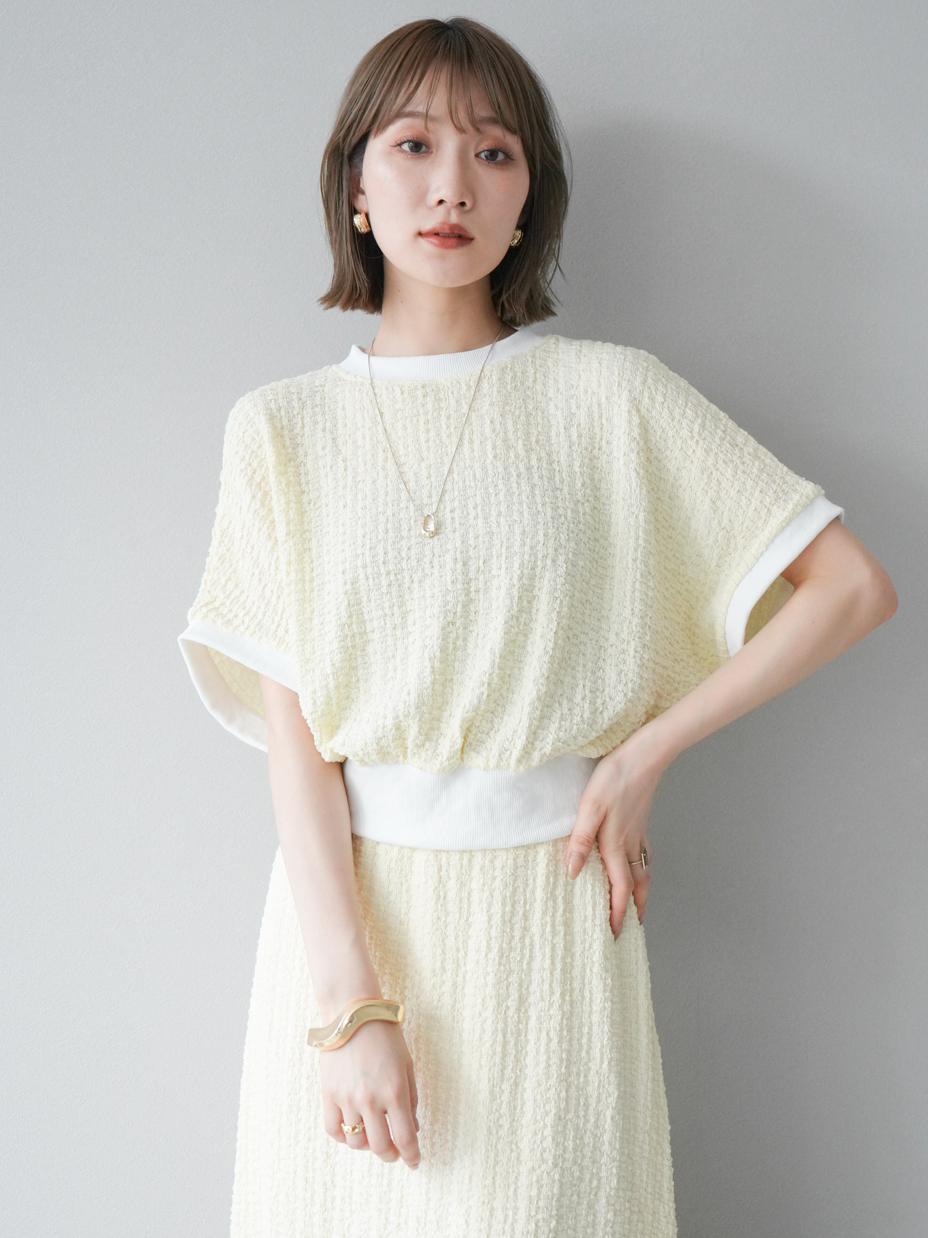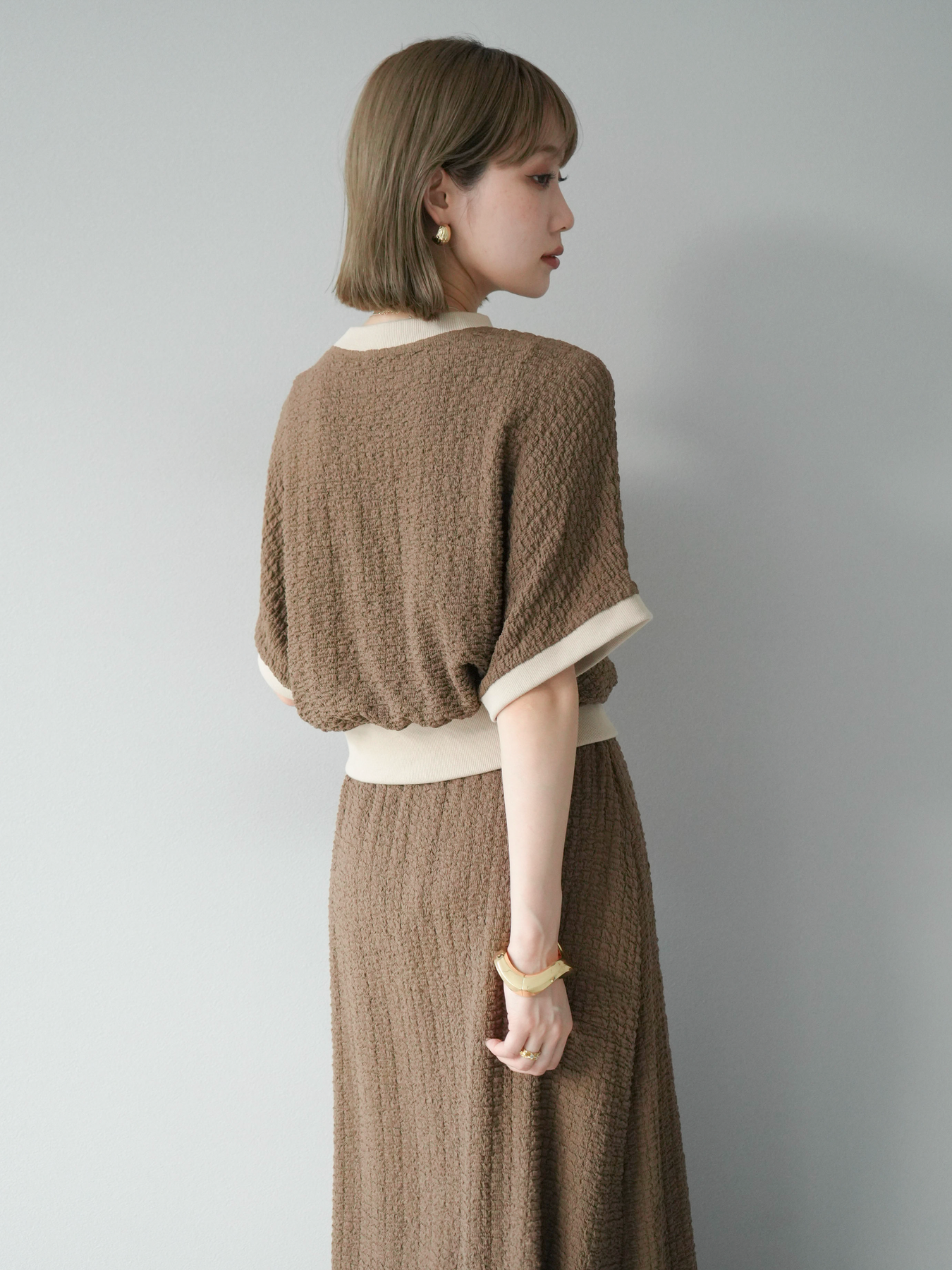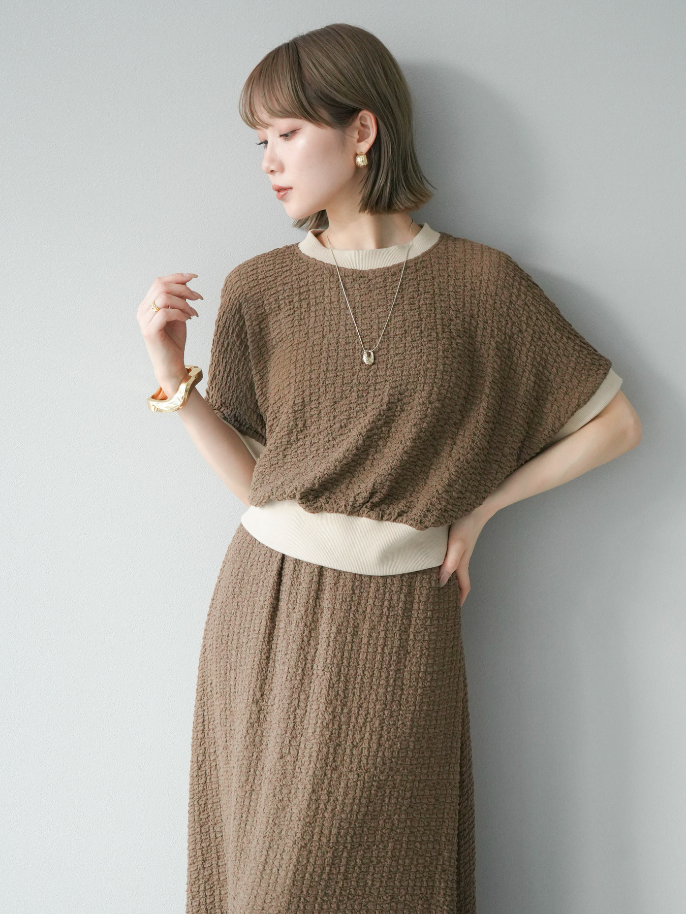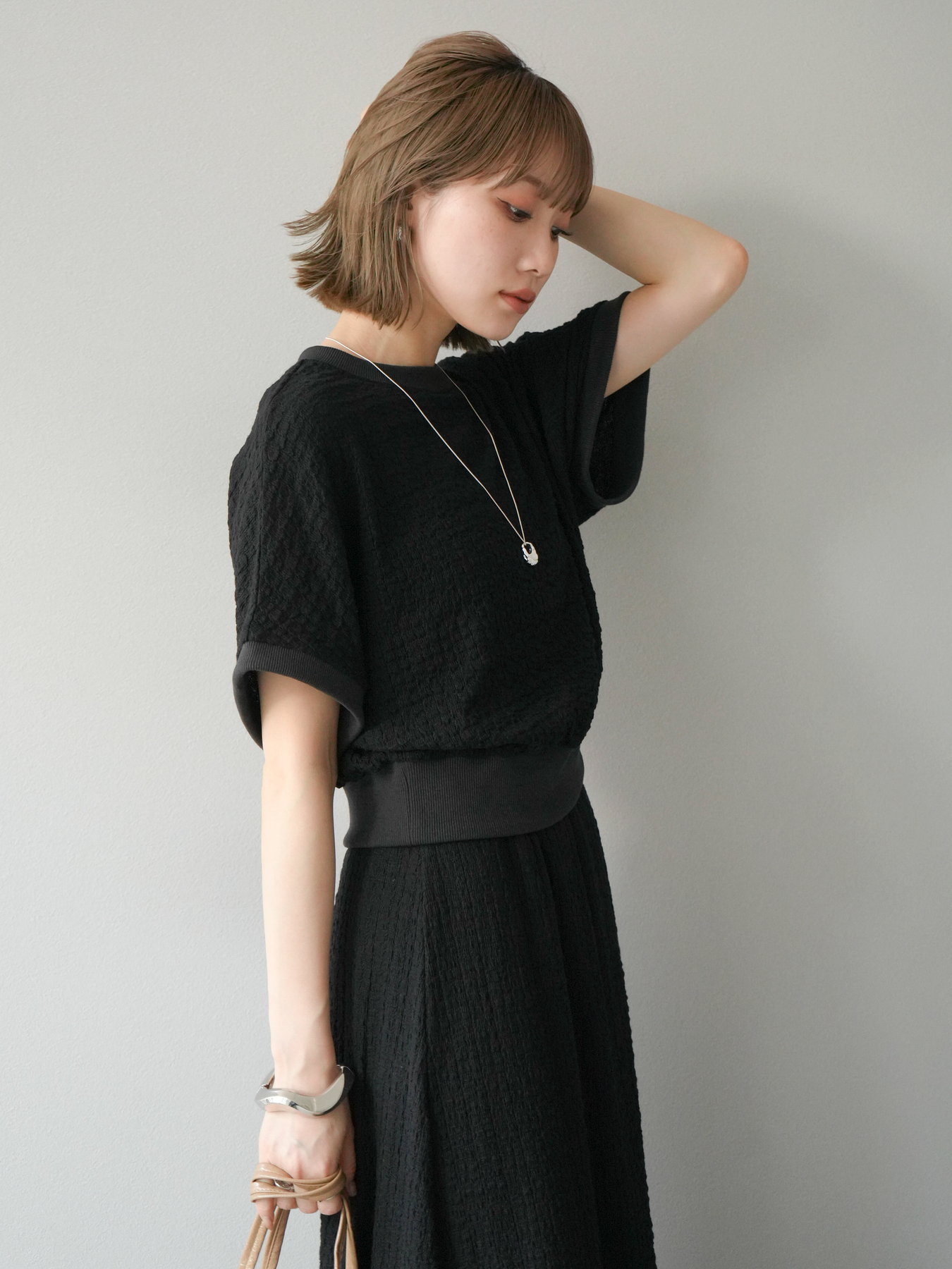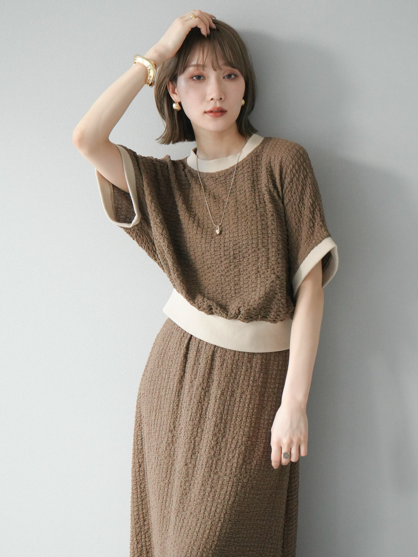 立体感のある膨れジャガード素材を使用したバイカラーデザインのプルオーバー。シンプルながらも表情のある素材感と、袖口・裾の切り替えがアクセントに。ゆとりのあるシルエットでラフに着られ、カジュアルながらも洗練された印象に仕上がります。ワイドパンツやデニムとの相性も◎。トレンドを意識したデイリースタイルにおすすめの一着です。 ※ボトムス、キャミソール(インナー)以外の商品は一律でインナーは付属していません