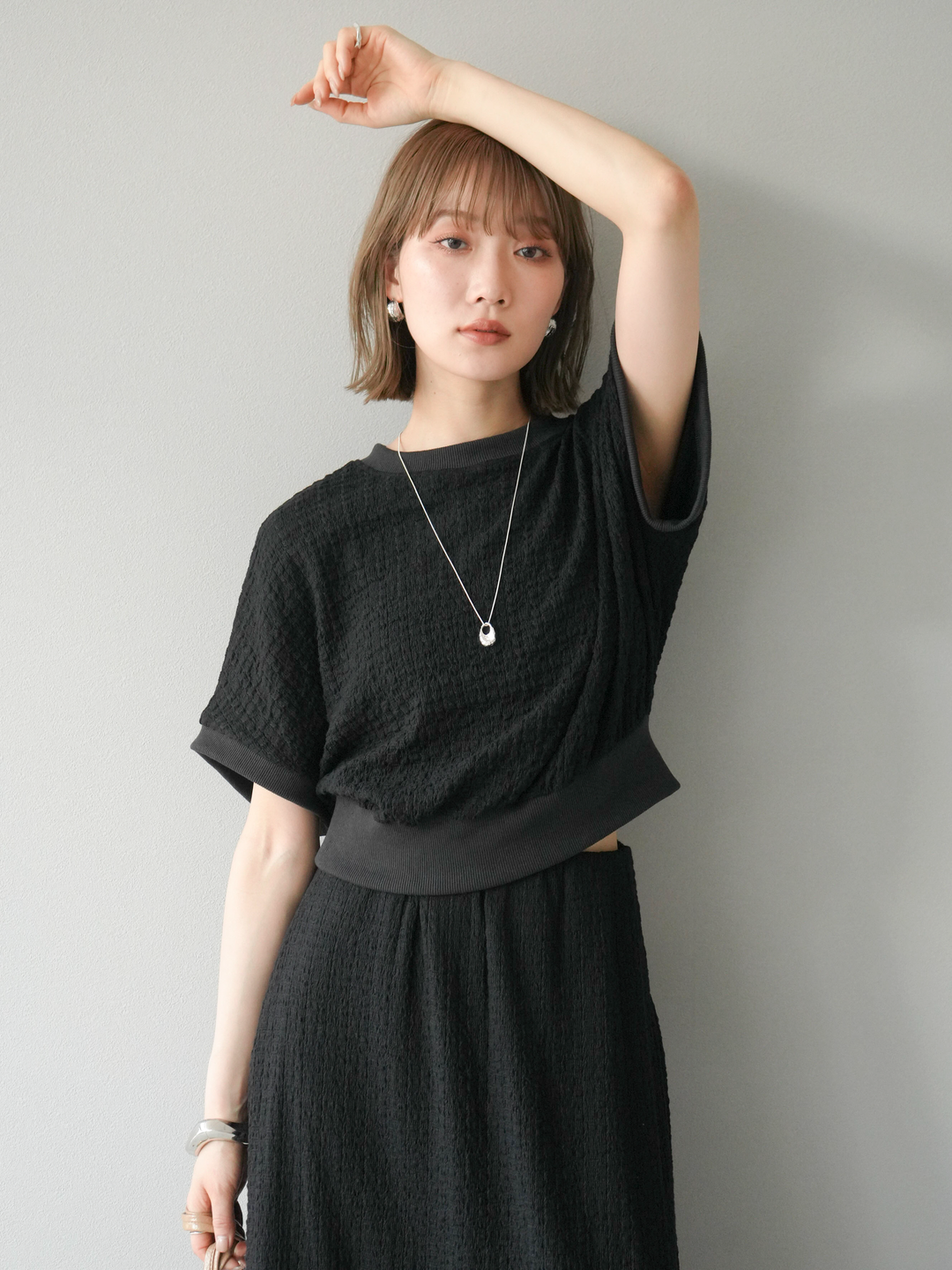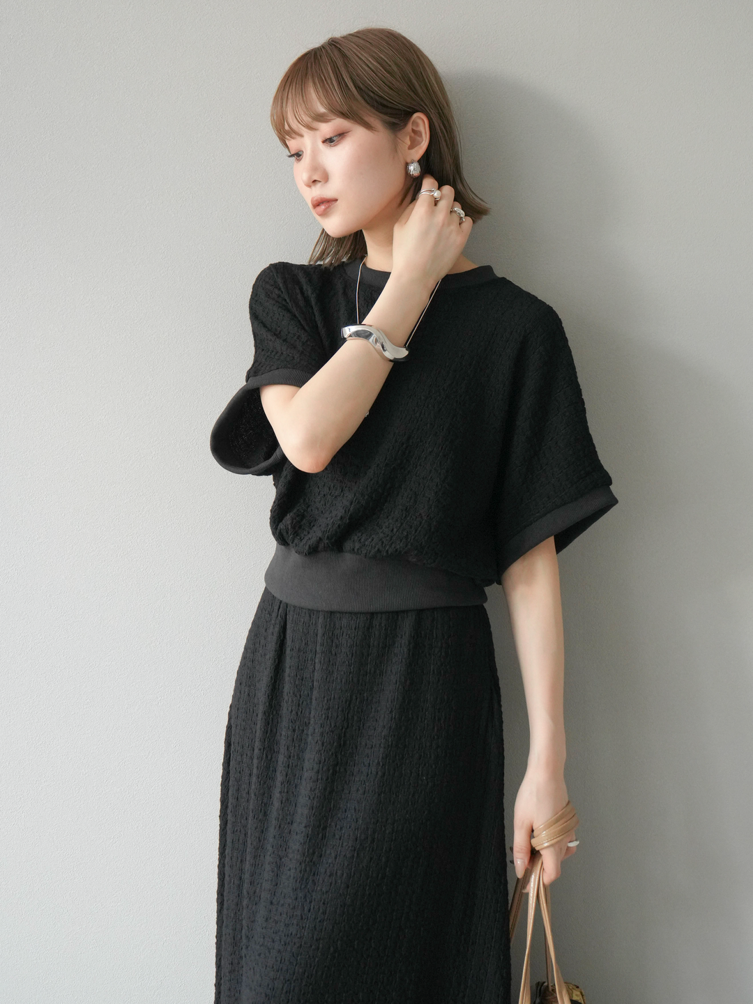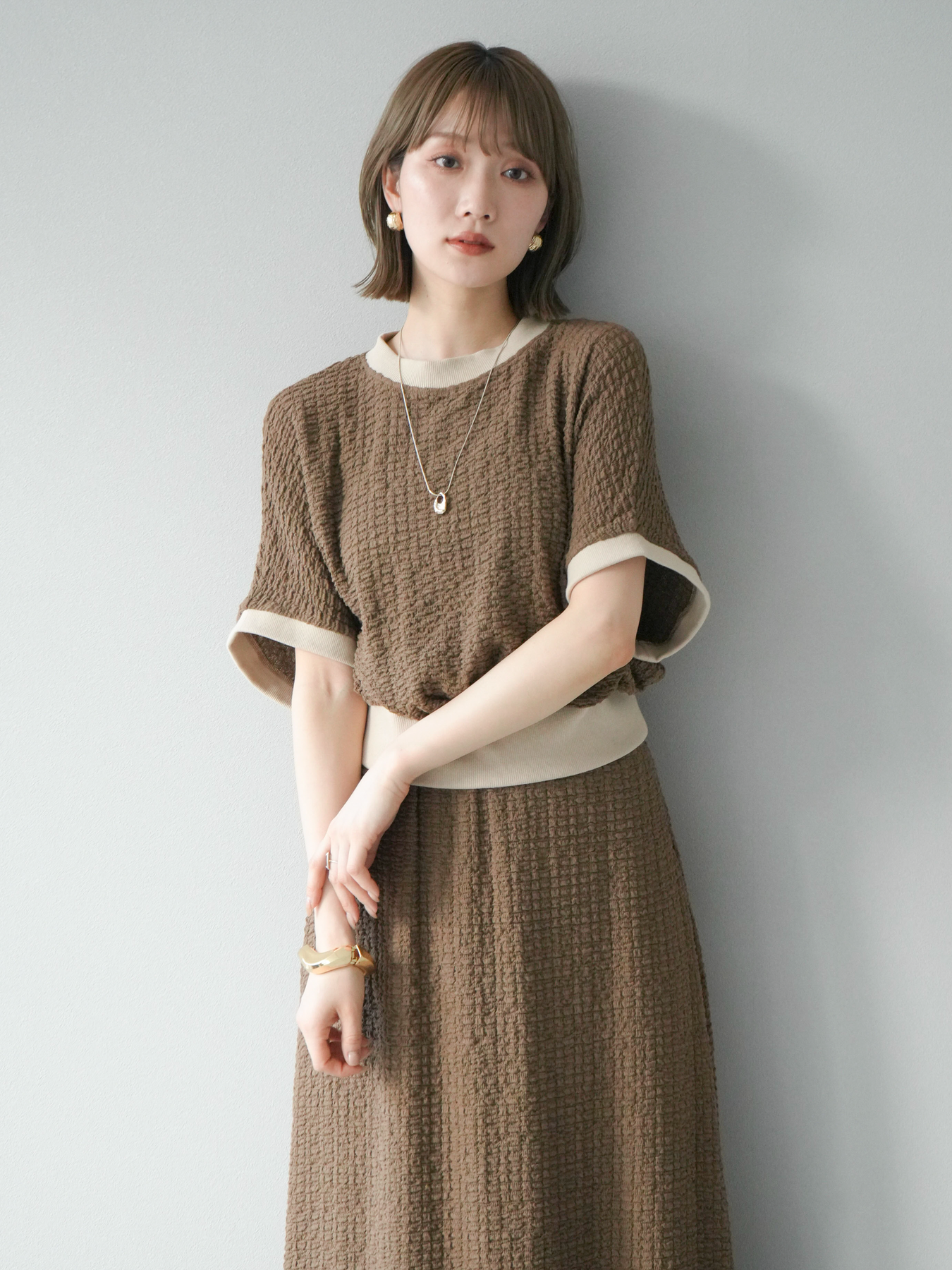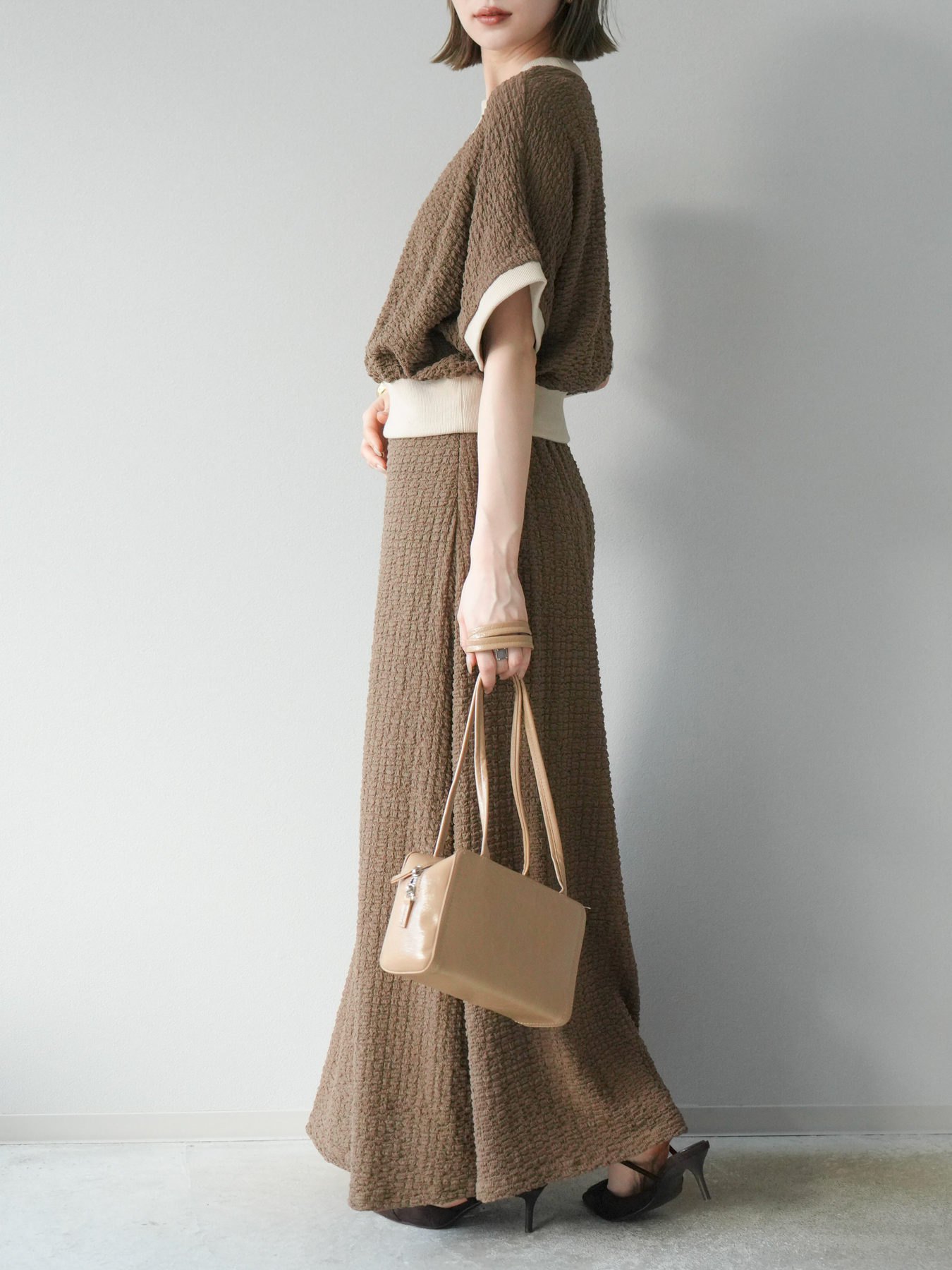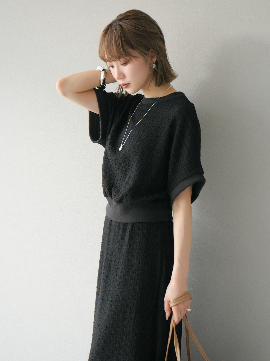 立体感のある膨れジャガード素材を使用したバイカラーデザインのプルオーバー。シンプルながらも表情のある素材感と、袖口・裾の切り替えがアクセントに。ゆとりのあるシルエットでラフに着られ、カジュアルながらも洗練された印象に仕上がります。ワイドパンツやデニムとの相性も◎。トレンドを意識したデイリースタイルにおすすめの一着です。 ※ボトムス、キャミソール(インナー)以外の商品は一律でインナーは付属していません