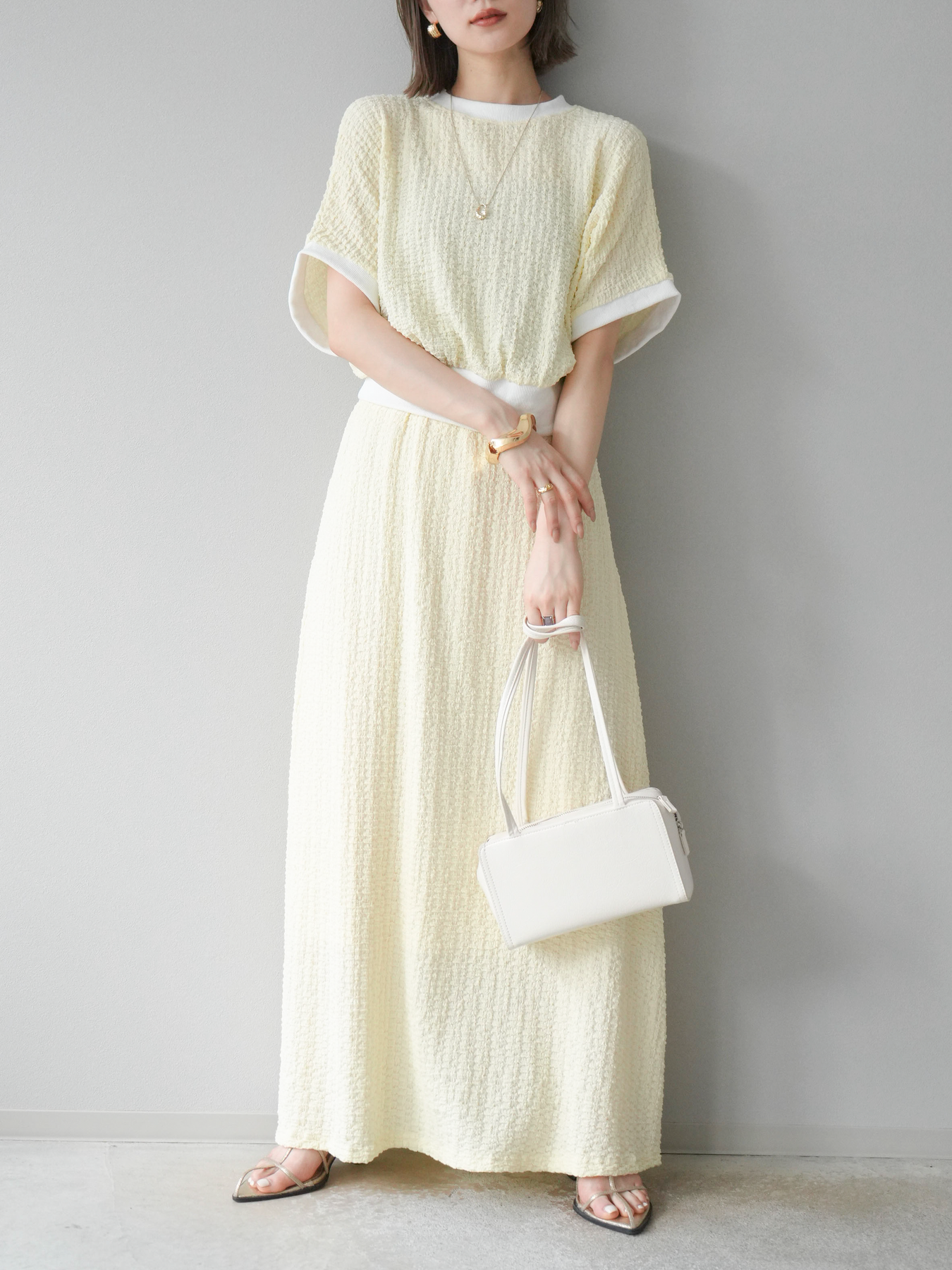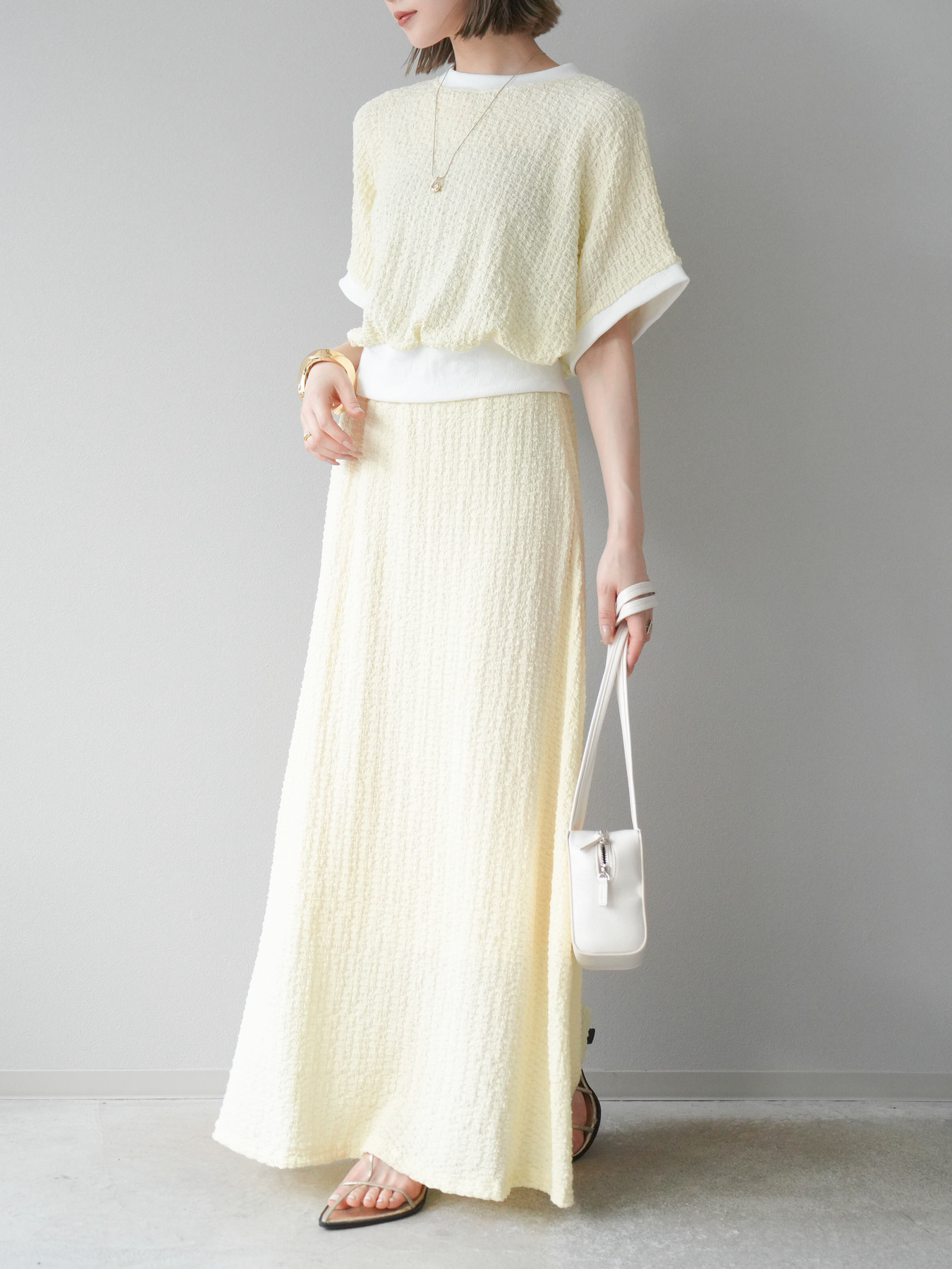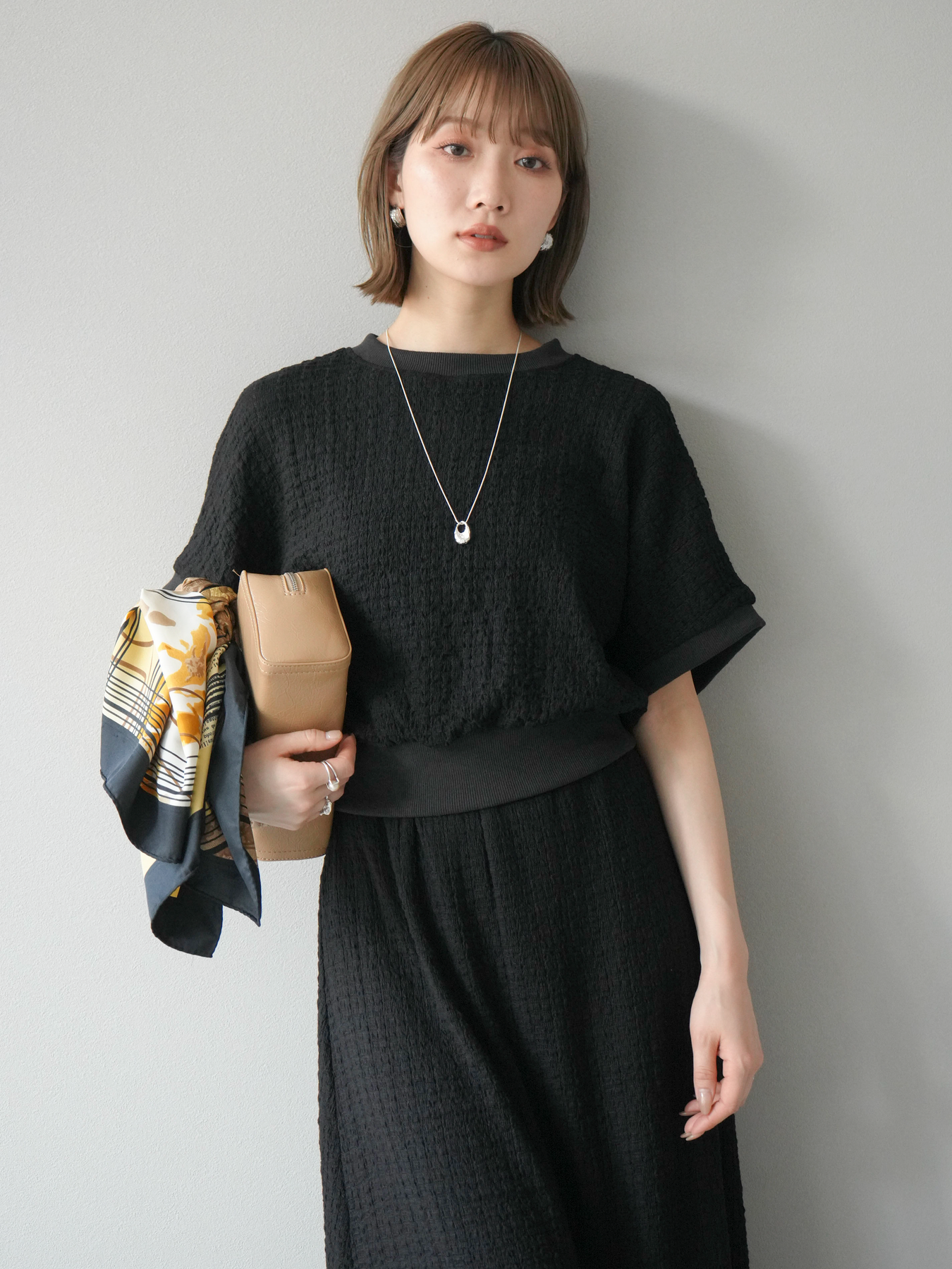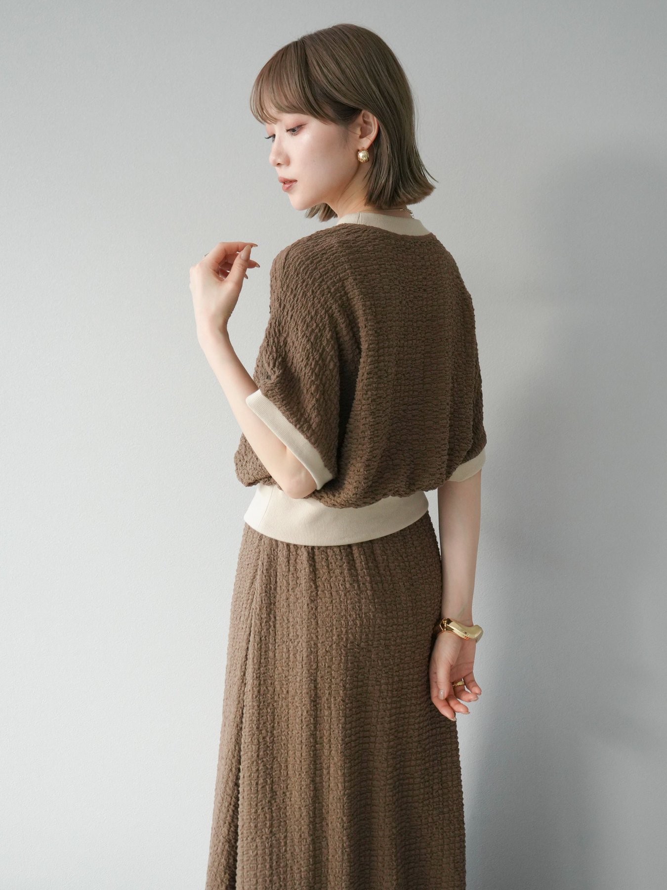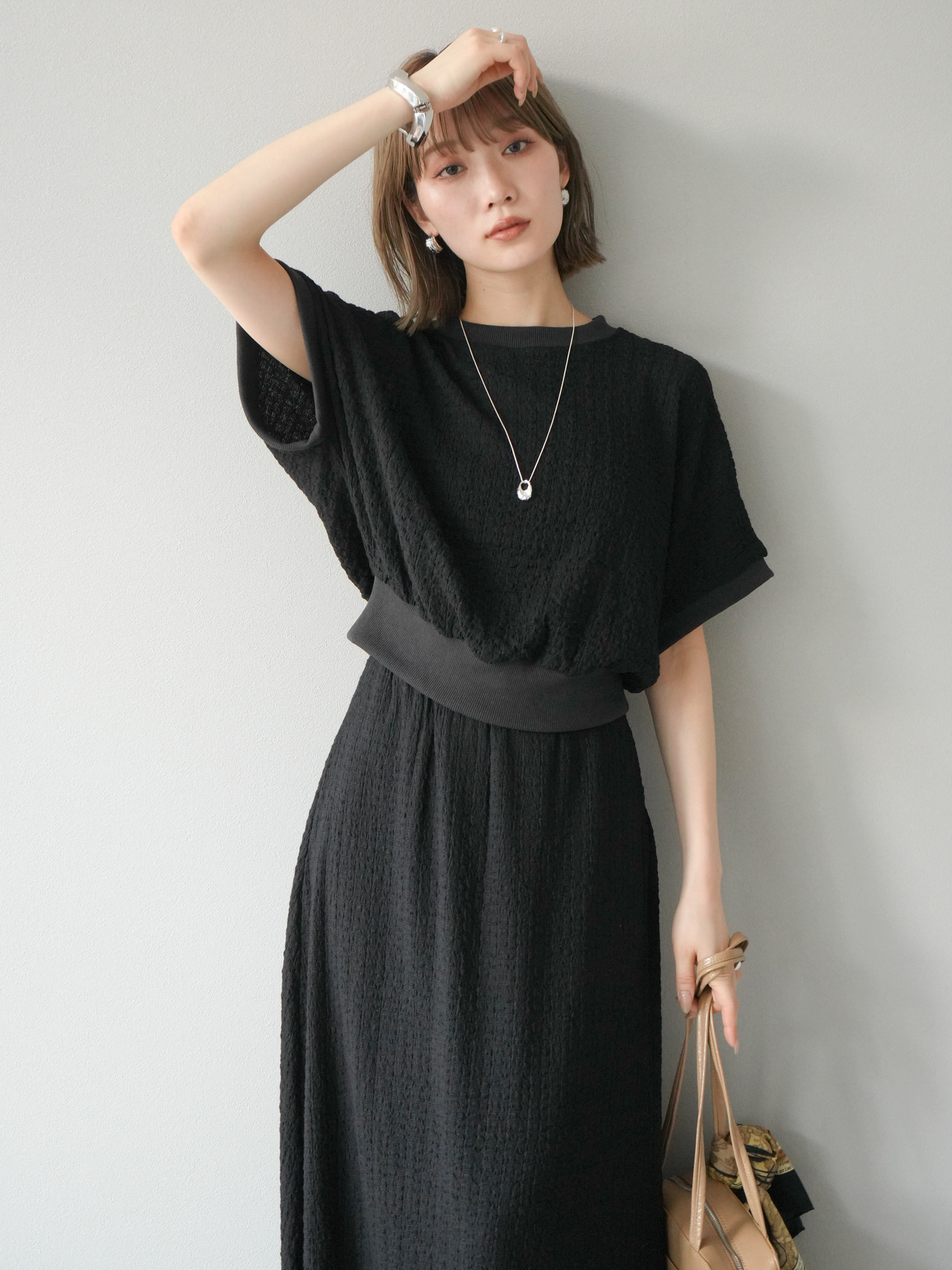 立体感のある膨れジャガード素材を使用したバイカラーデザインのプルオーバー。シンプルながらも表情のある素材感と、袖口・裾の切り替えがアクセントに。ゆとりのあるシルエットでラフに着られ、カジュアルながらも洗練された印象に仕上がります。ワイドパンツやデニムとの相性も◎。トレンドを意識したデイリースタイルにおすすめの一着です。 ※ボトムス、キャミソール(インナー)以外の商品は一律でインナーは付属していません