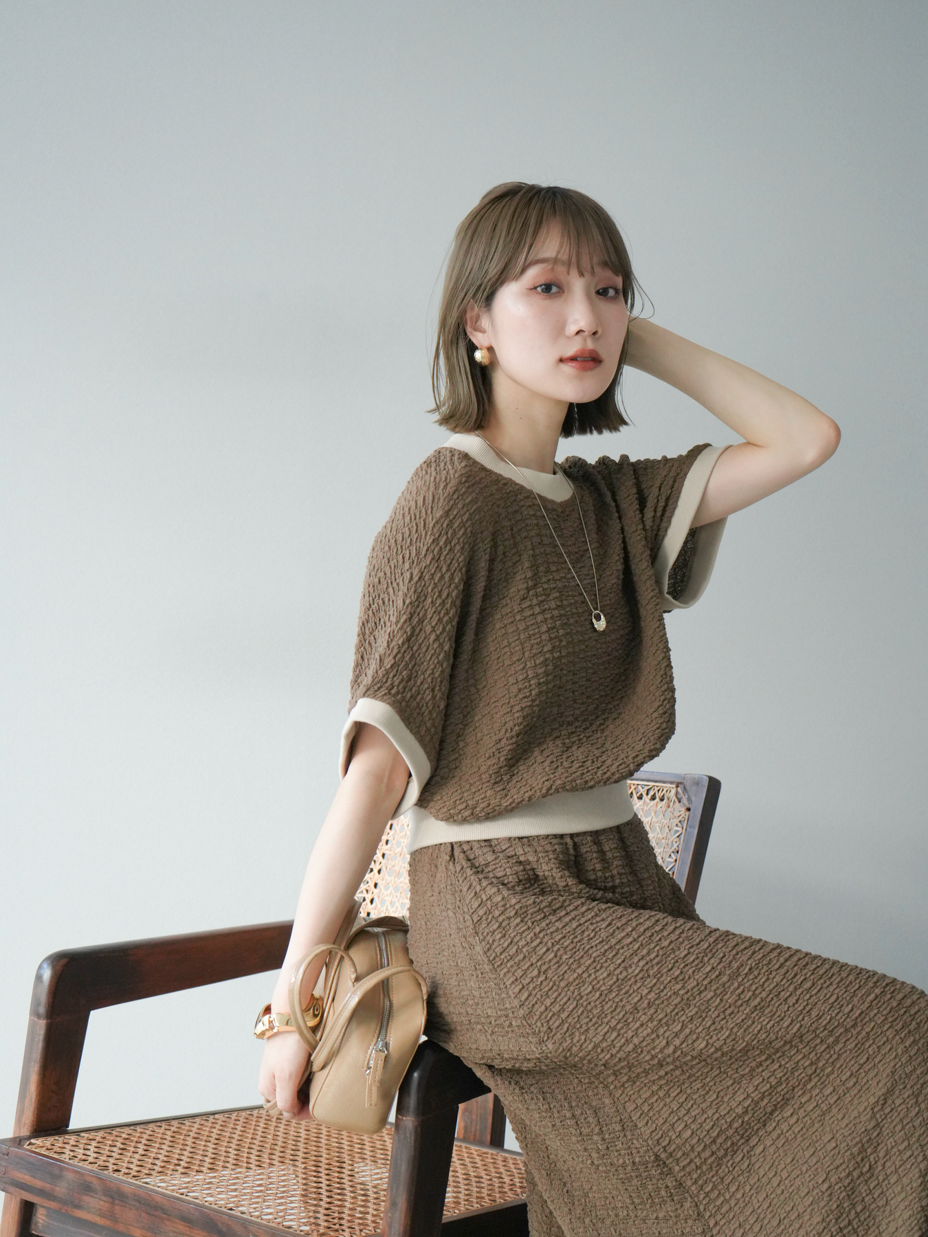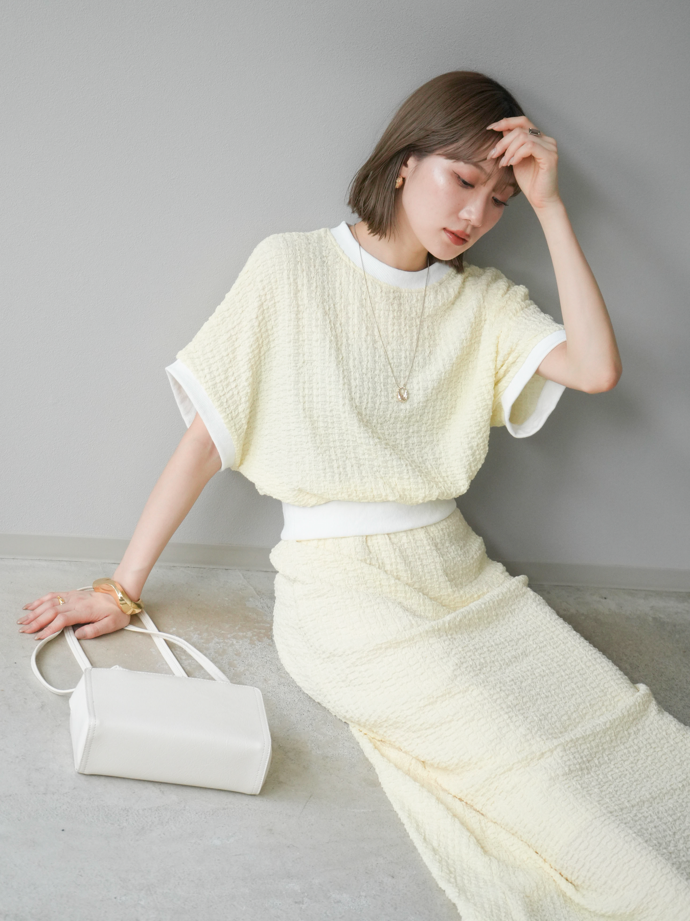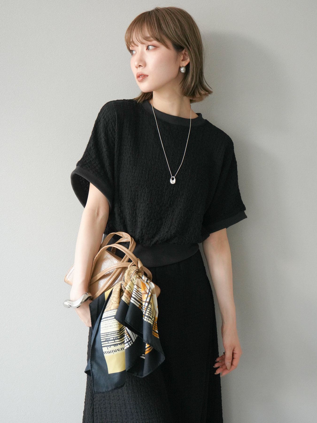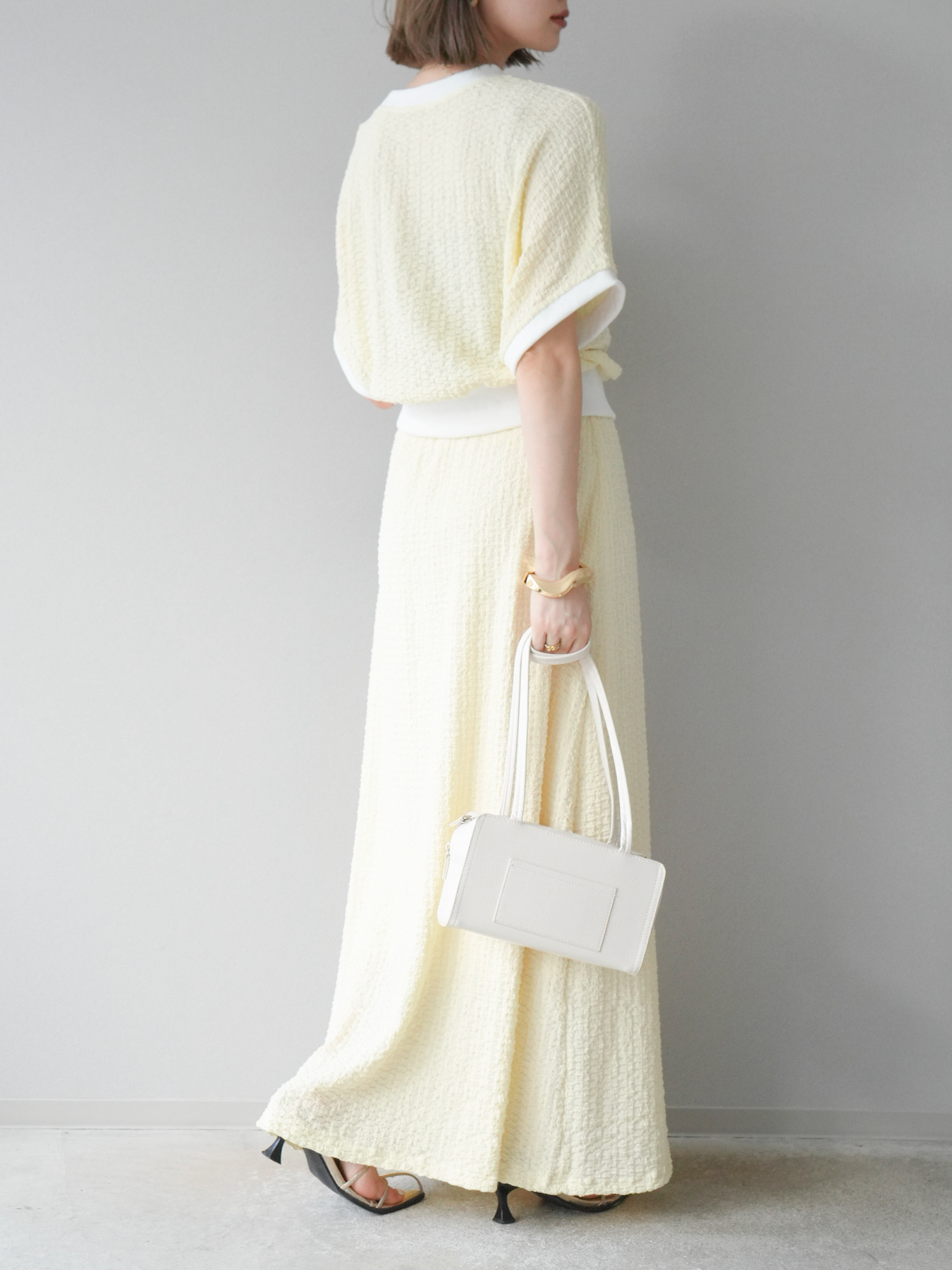 立体感のある膨れジャガード素材を使用したバイカラーデザインのプルオーバー。シンプルながらも表情のある素材感と、袖口・裾の切り替えがアクセントに。ゆとりのあるシルエットでラフに着られ、カジュアルながらも洗練された印象に仕上がります。ワイドパンツやデニムとの相性も◎。トレンドを意識したデイリースタイルにおすすめの一着です。 ※ボトムス、キャミソール(インナー)以外の商品は一律でインナーは付属していません