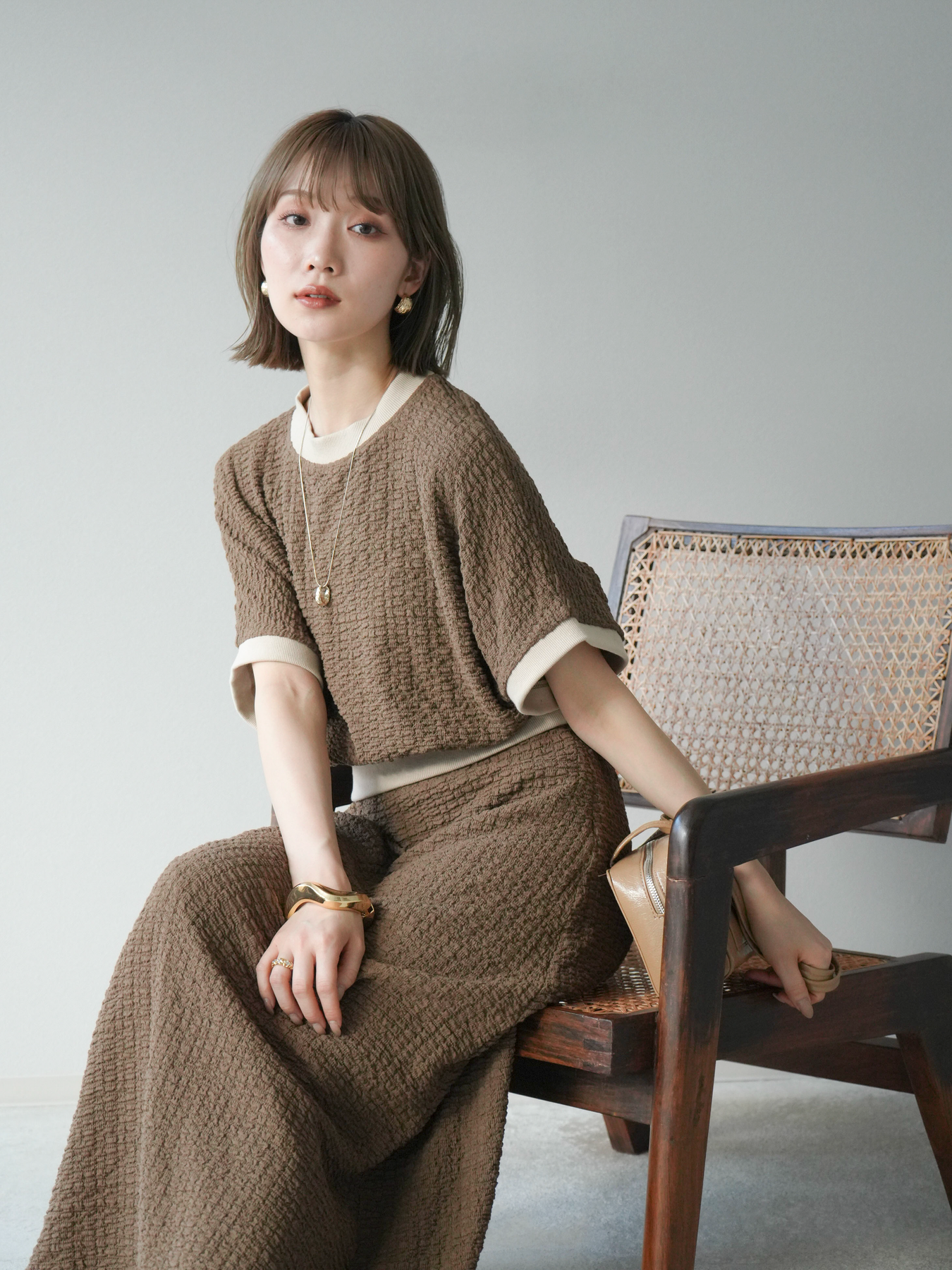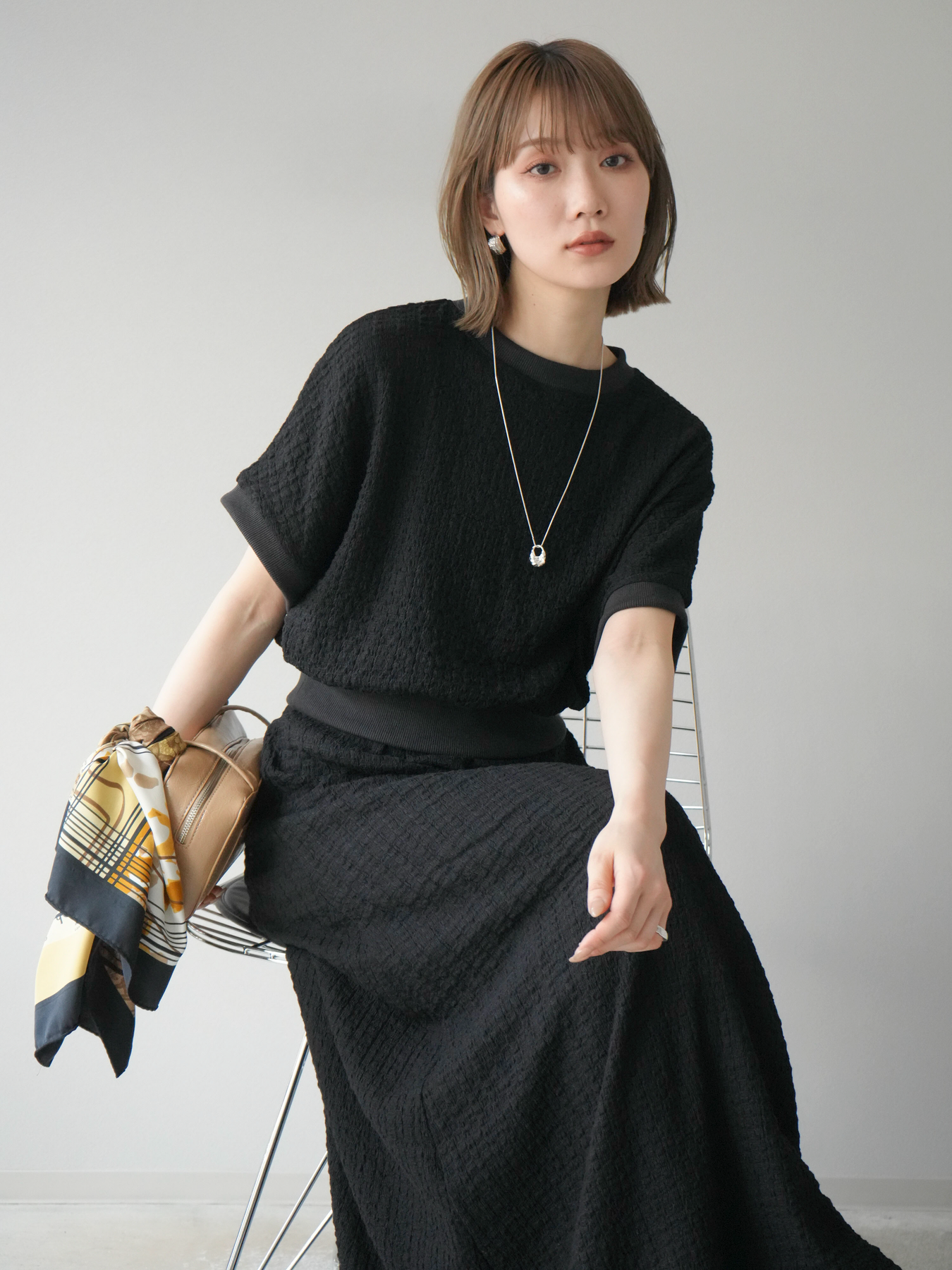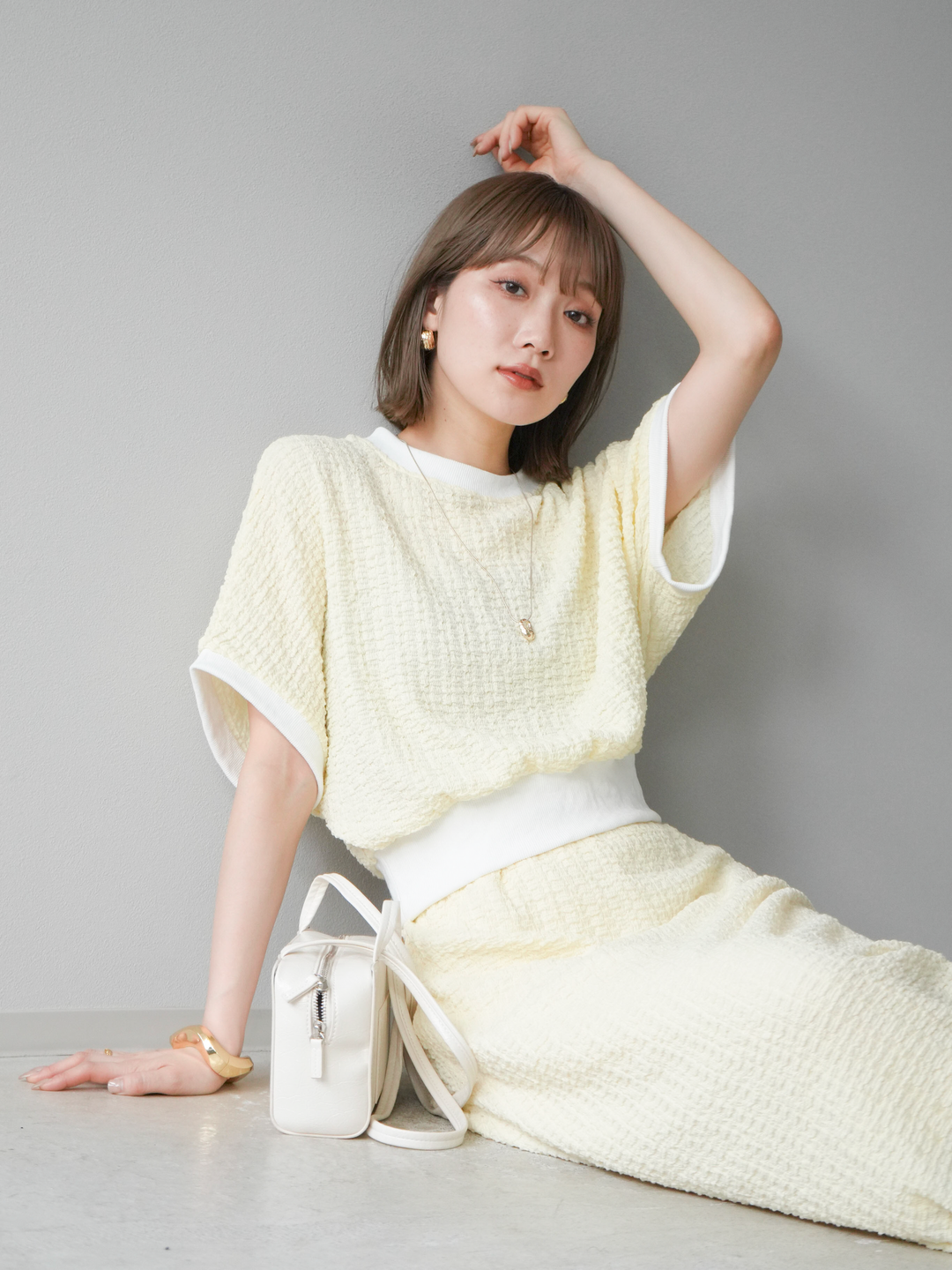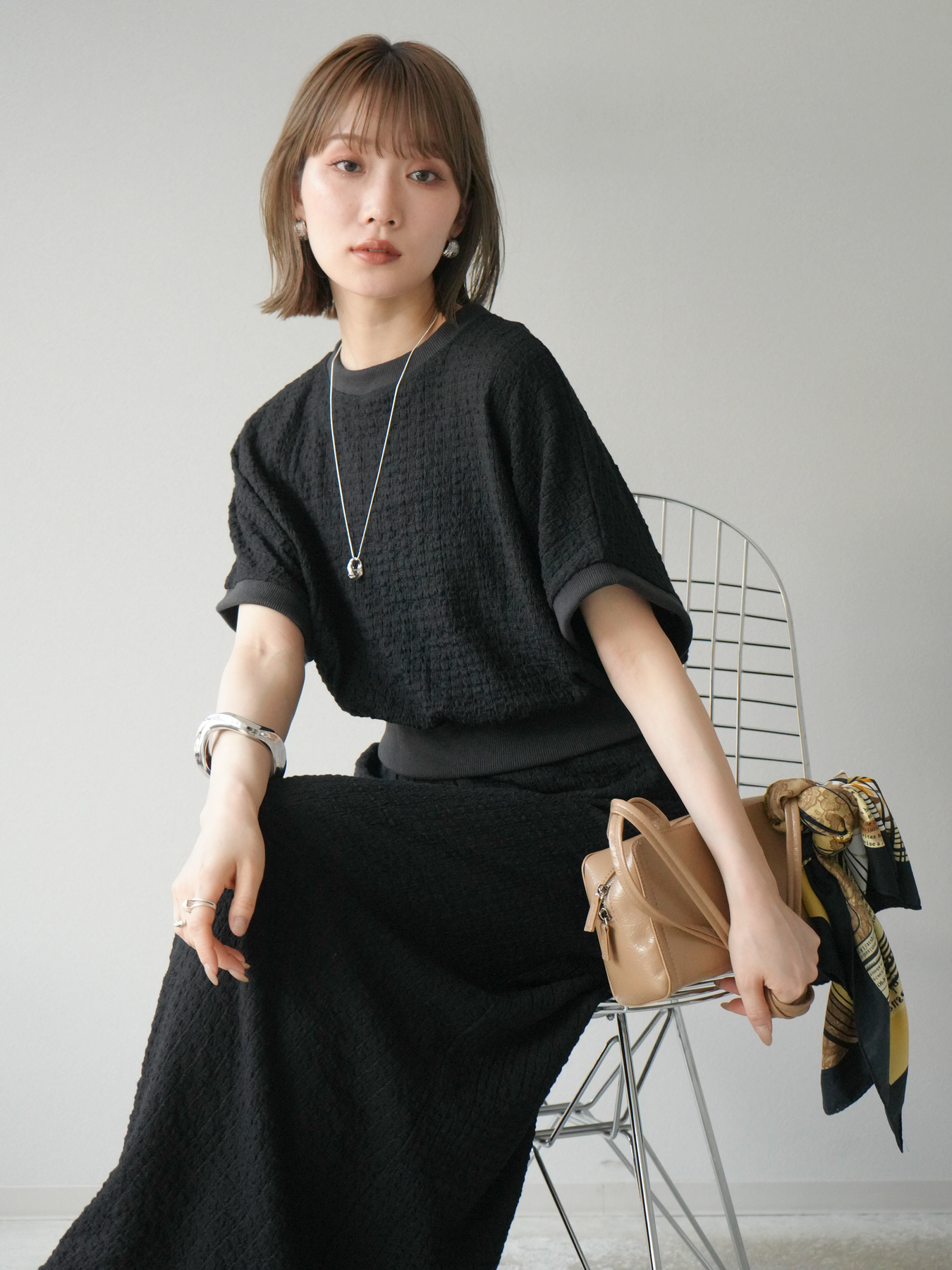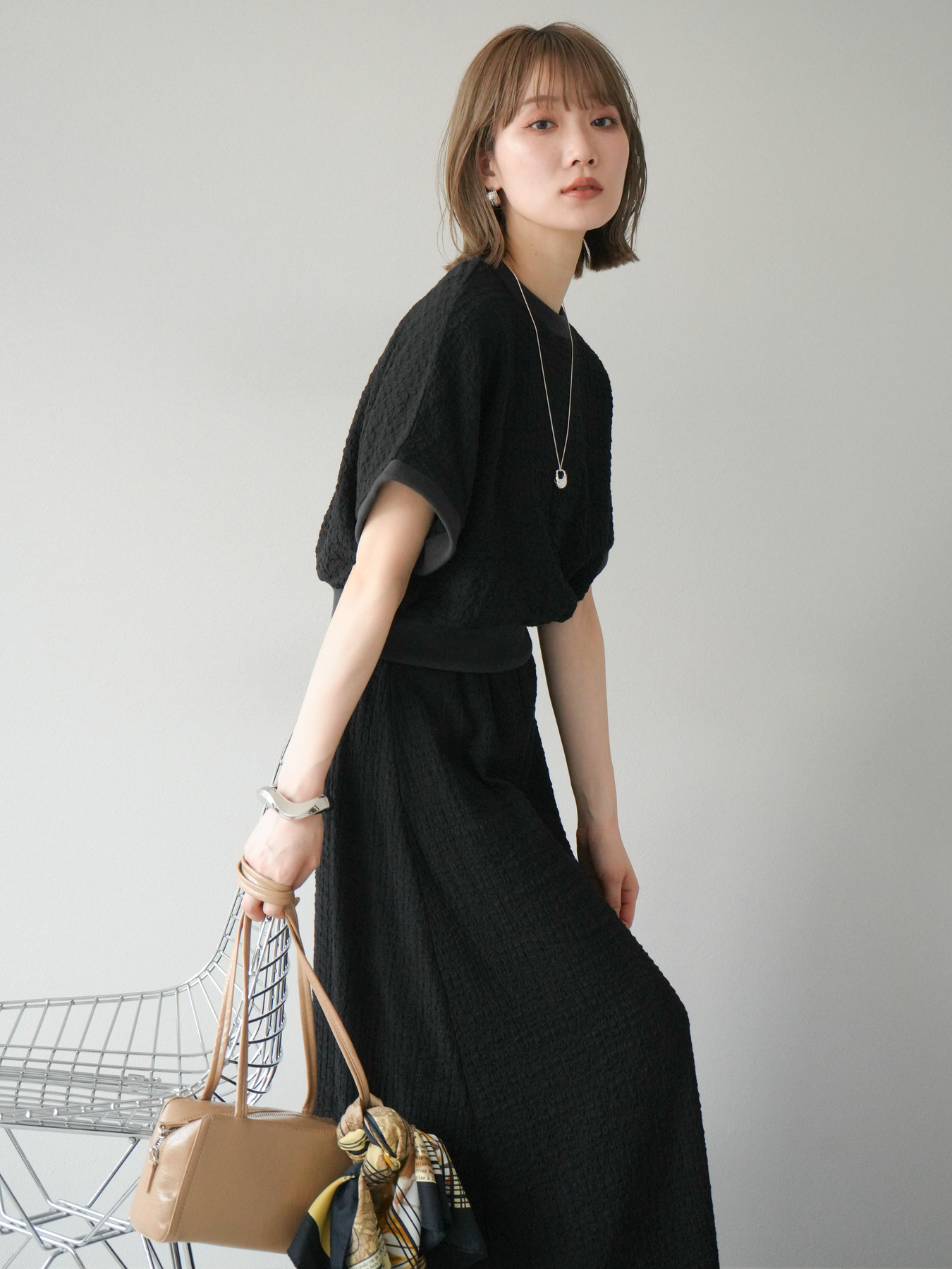 立体感のある膨れジャガード素材を使用したバイカラーデザインのプルオーバー。シンプルながらも表情のある素材感と、袖口・裾の切り替えがアクセントに。ゆとりのあるシルエットでラフに着られ、カジュアルながらも洗練された印象に仕上がります。ワイドパンツやデニムとの相性も◎。トレンドを意識したデイリースタイルにおすすめの一着です。 ※ボトムス、キャミソール(インナー)以外の商品は一律でインナーは付属していません