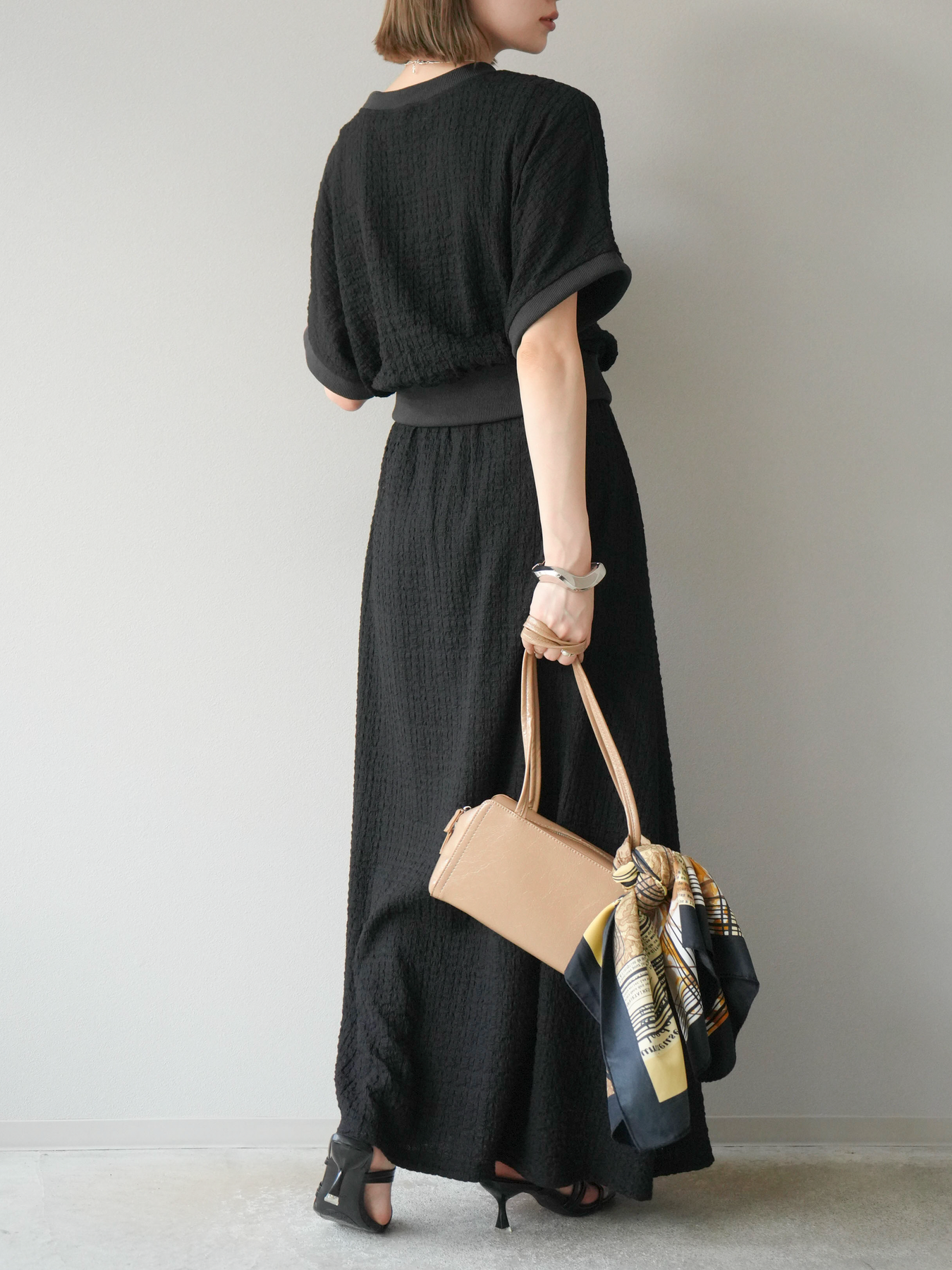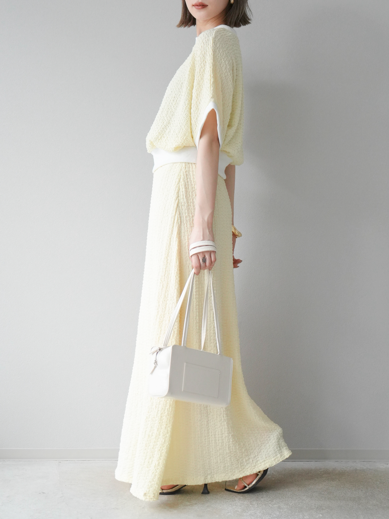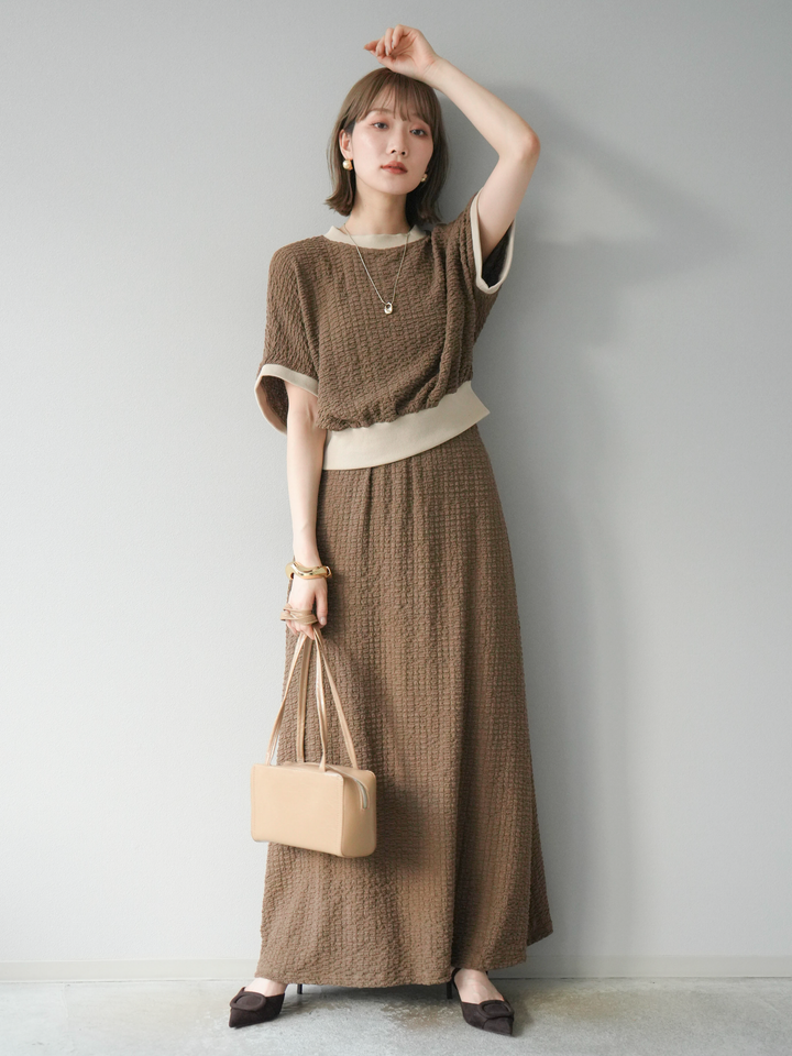 立体感のある膨れジャガード素材が特徴のフレアスカート。歩くたびに揺れる軽やかなシルエットが女性らしさを引き立てます。バイカラーのウエストデザインがさりげないアクセントに。ウエストはゴム仕様で快適な着心地。きれいめからカジュアルまで幅広くスタイリングでき、デイリーにも活躍する1枚です。 ※ボトムス、キャミソール(インナー)以外の商品は一律でインナーは付属していません