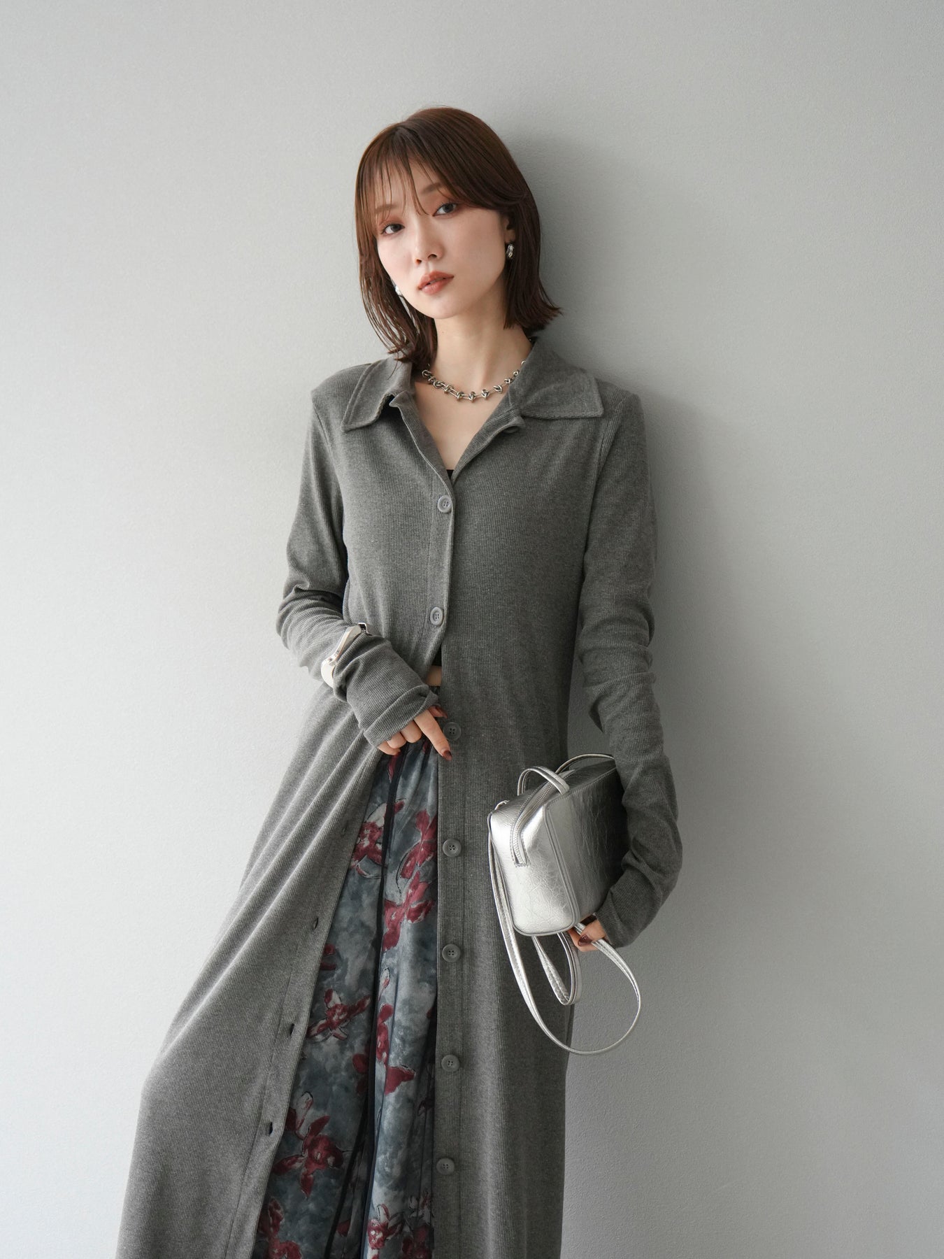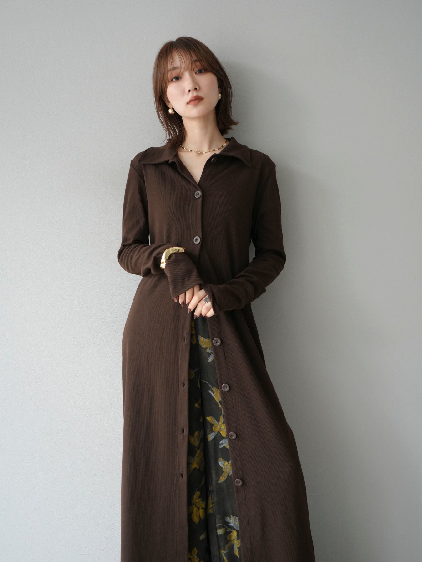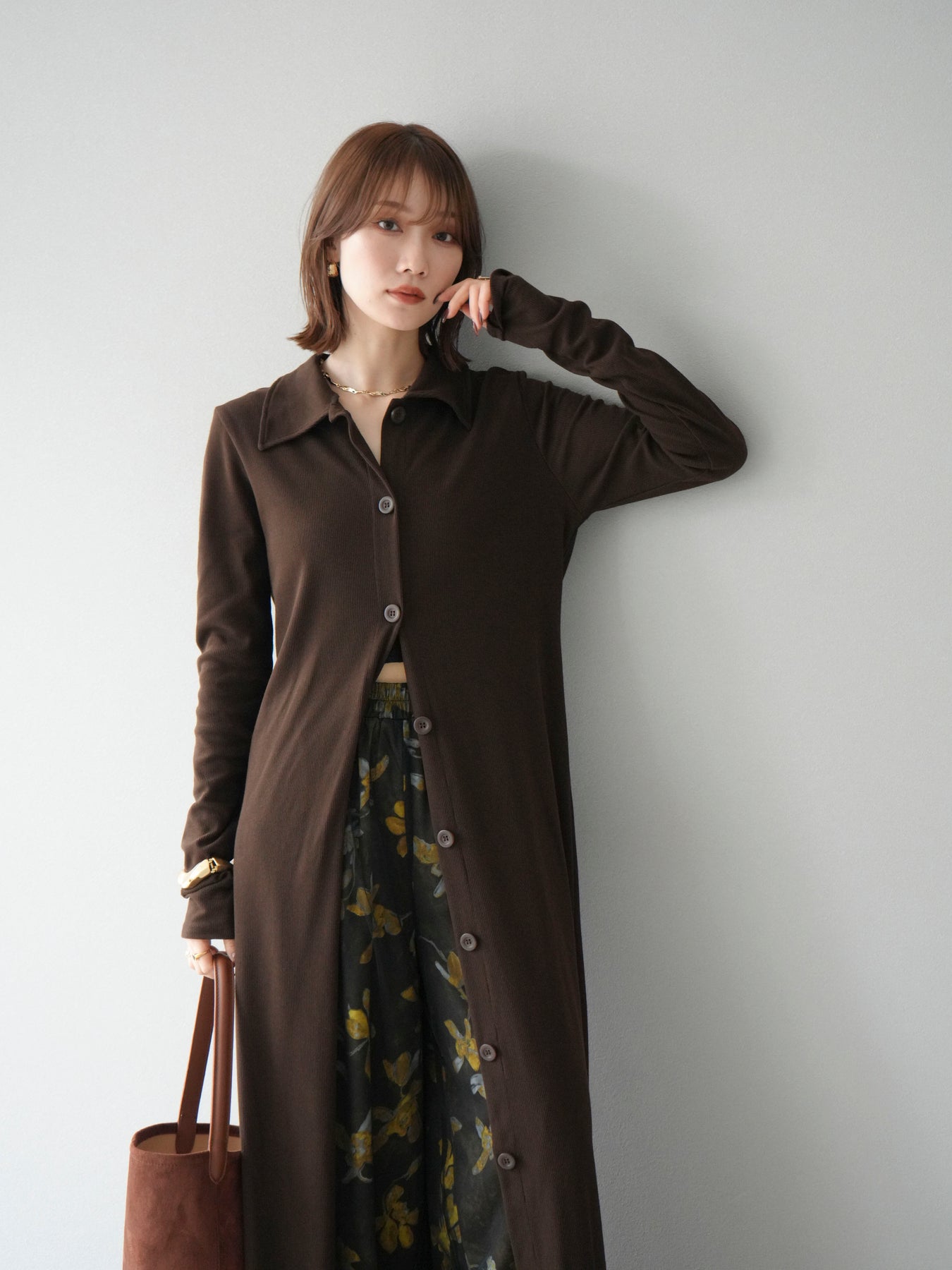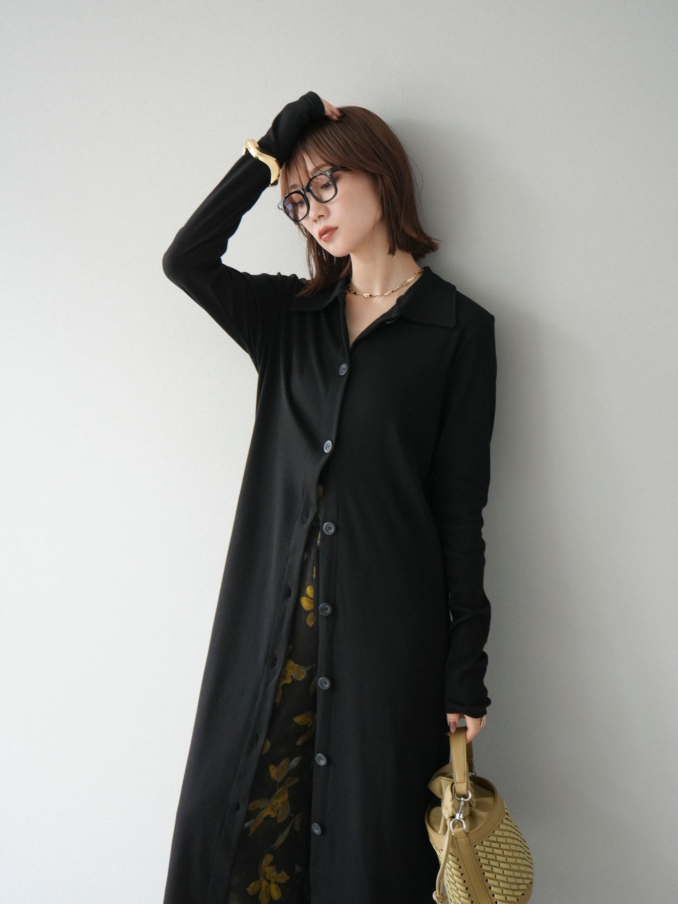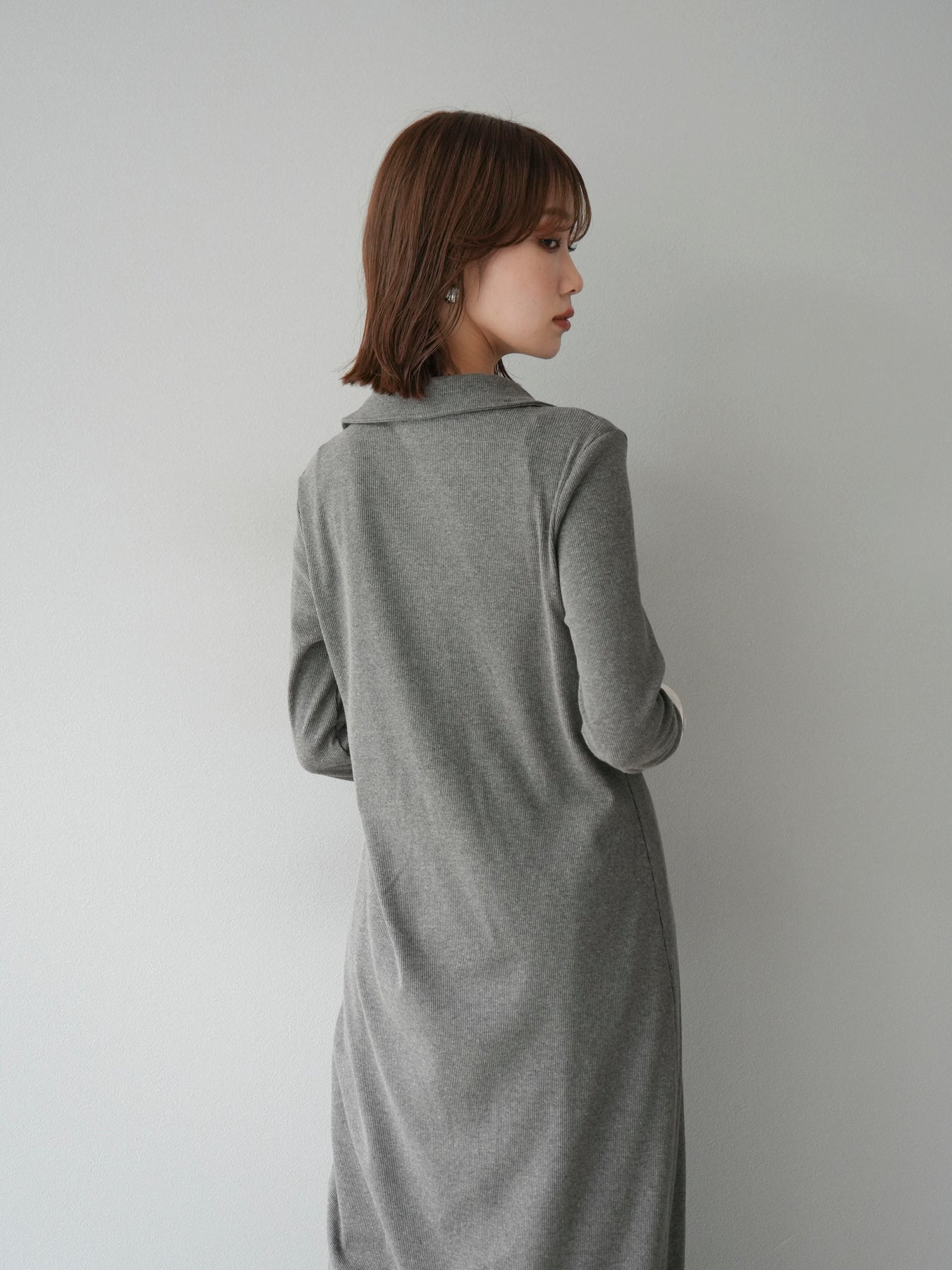 クラシカルな襟付きデザインにフロントボタンをあしらったカットリブ素材のワンピース。縦長シルエットと程よいフィット感で、女性らしいすっきりとした印象に。全ボタン開閉可能で羽織りとしても着回せる2WAY仕様。1枚での着用はもちろん、パンツとのレイヤードにも活躍。ロングシーズン使える汎用性の高い一着。