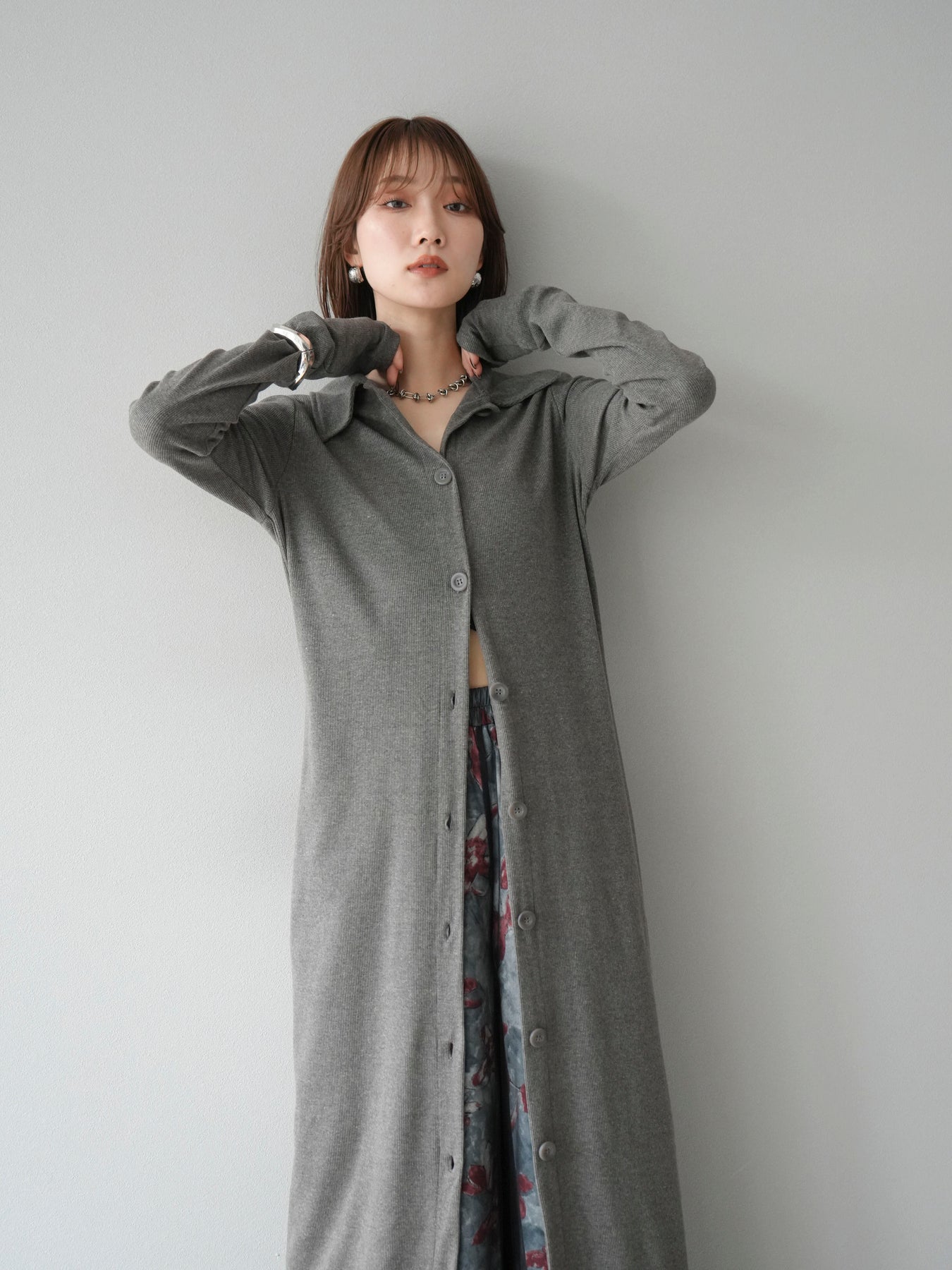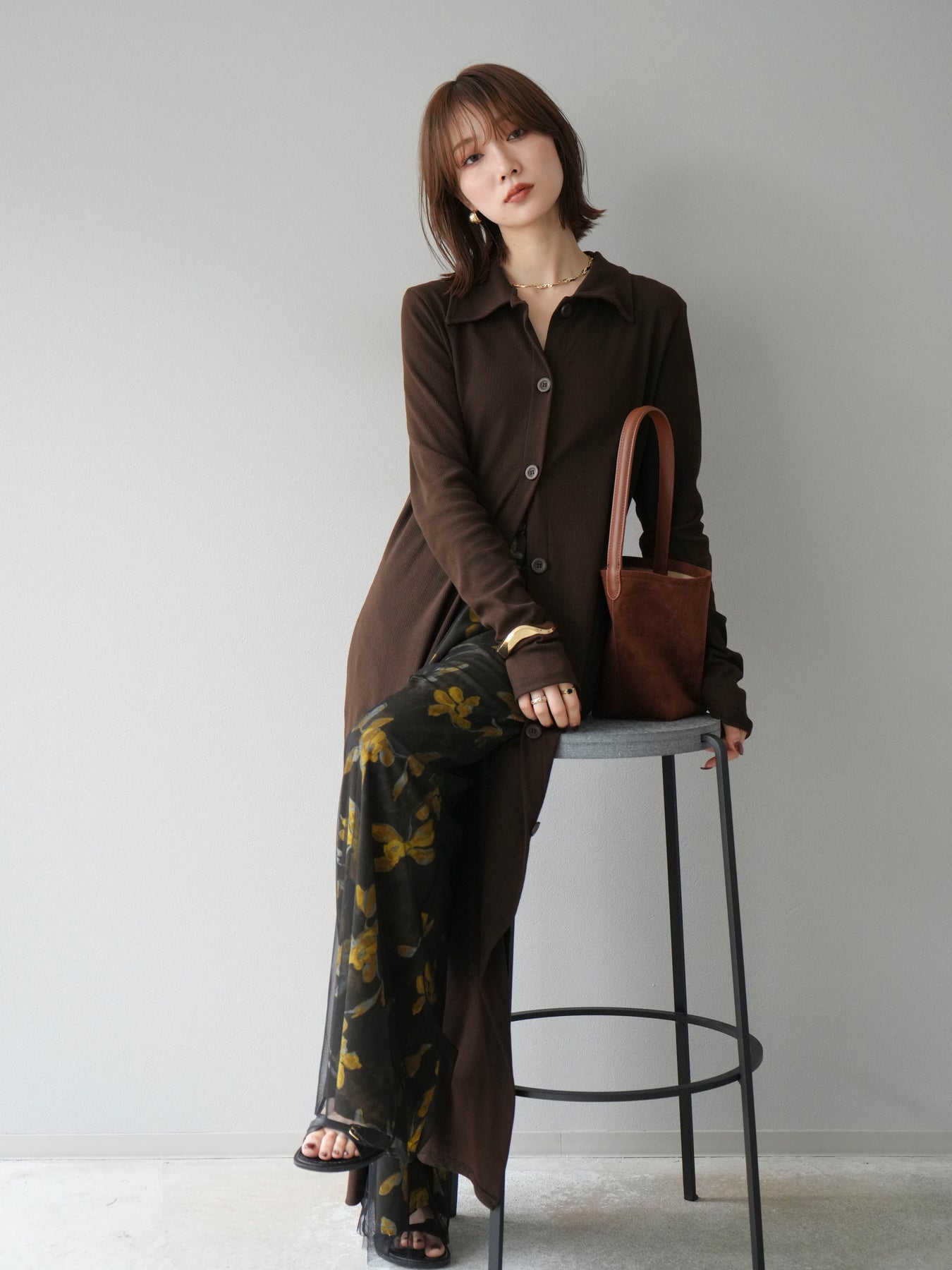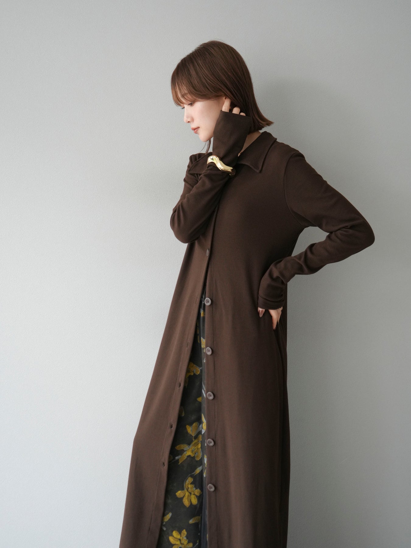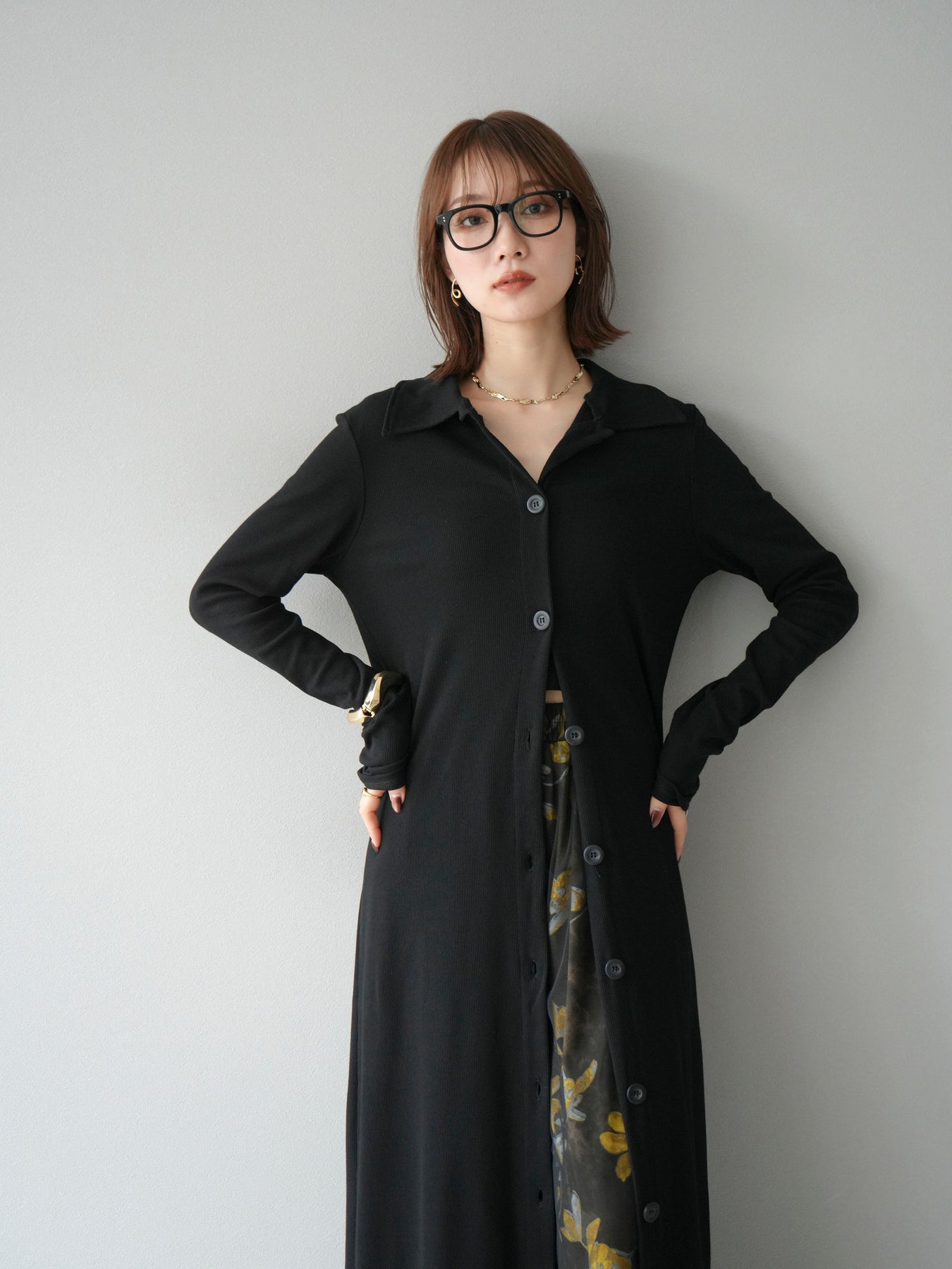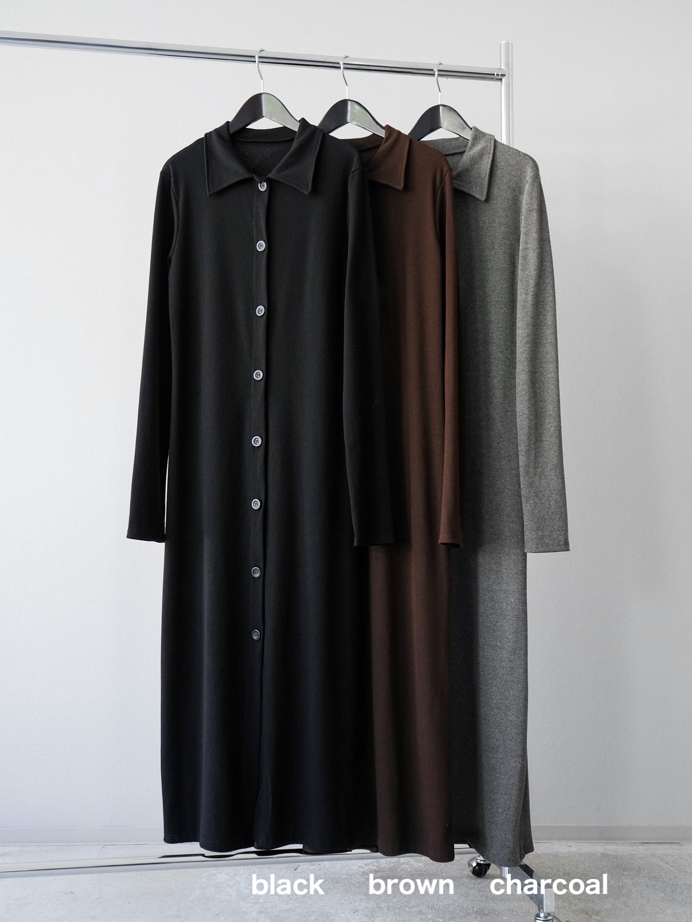 クラシカルな襟付きデザインにフロントボタンをあしらったカットリブ素材のワンピース。縦長シルエットと程よいフィット感で、女性らしいすっきりとした印象に。全ボタン開閉可能で羽織りとしても着回せる2WAY仕様。1枚での着用はもちろん、パンツとのレイヤードにも活躍。ロングシーズン使える汎用性の高い一着。