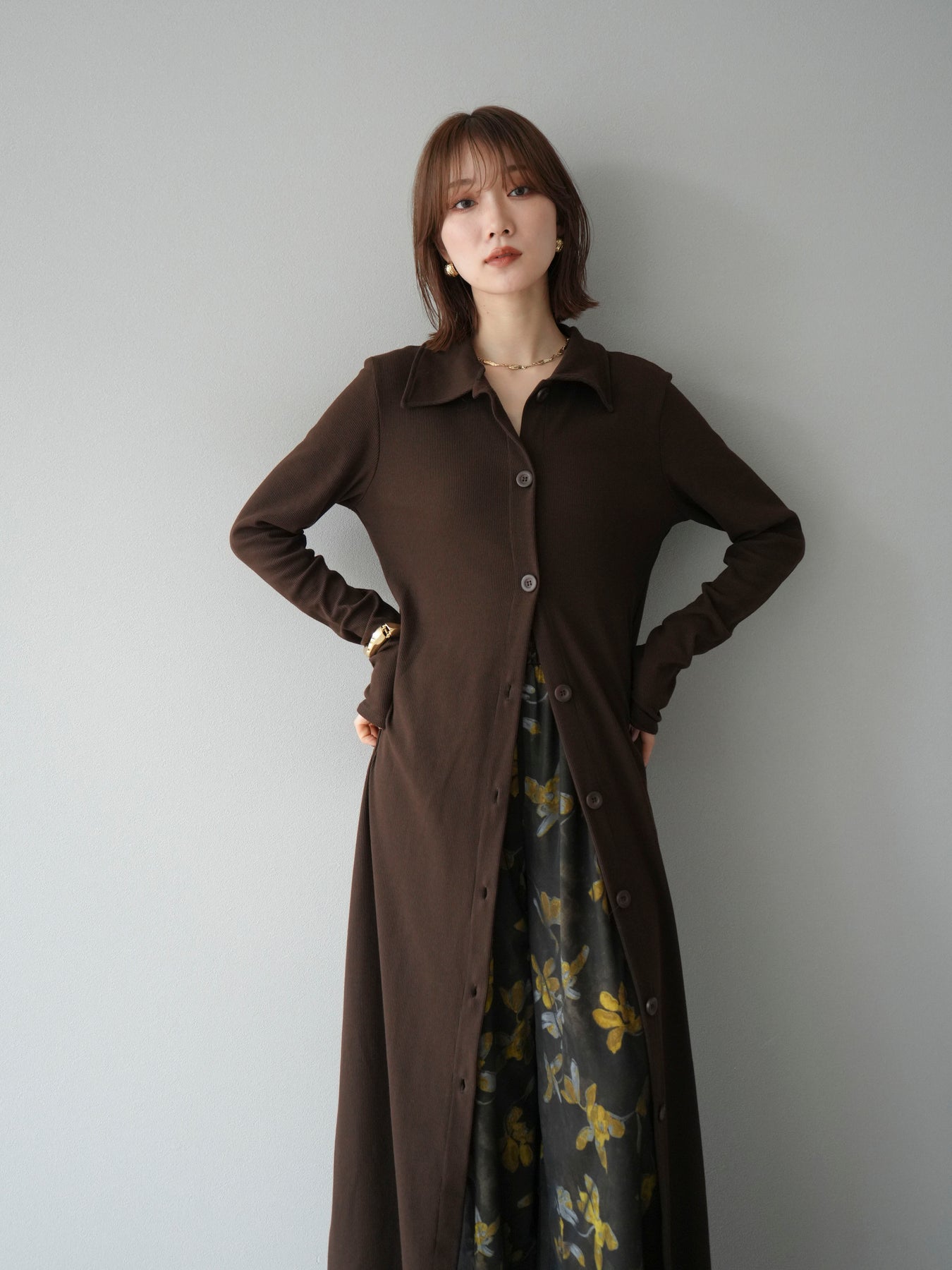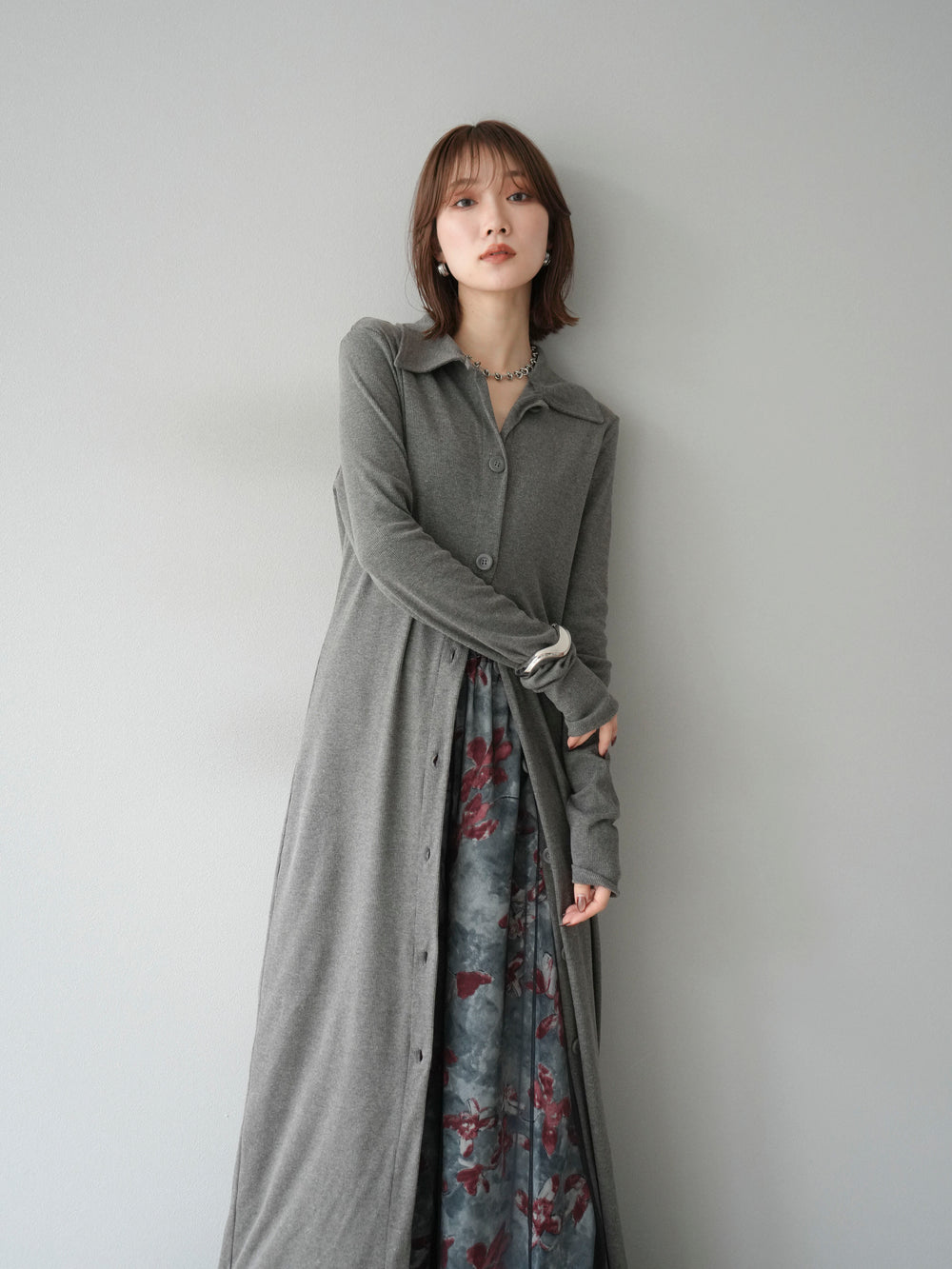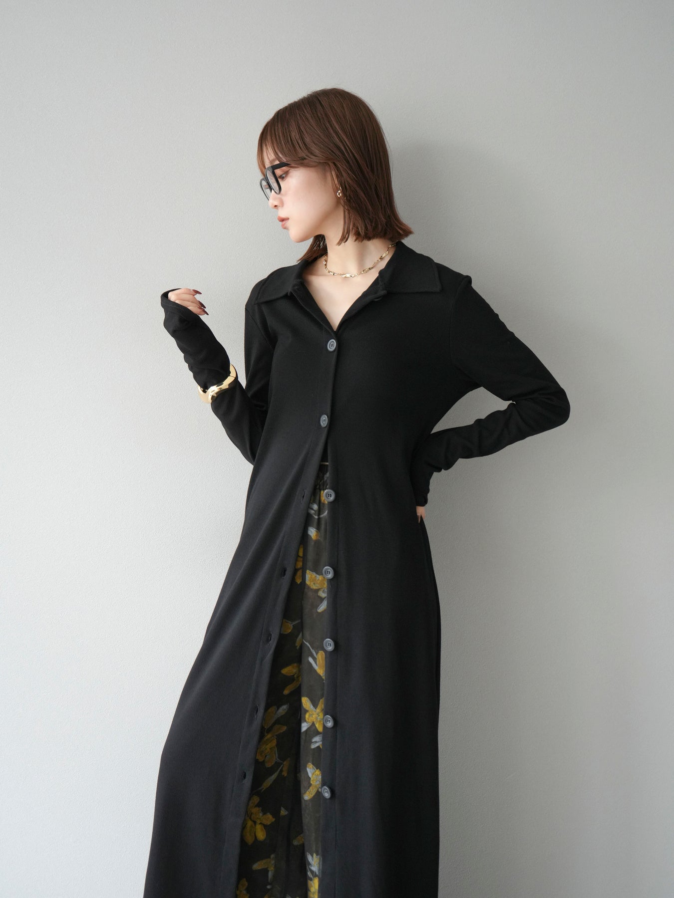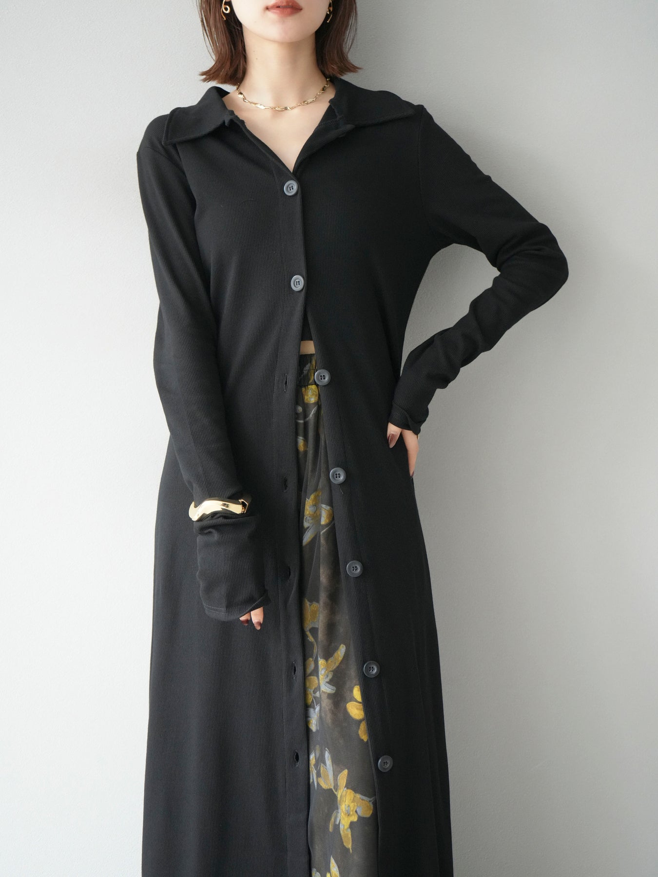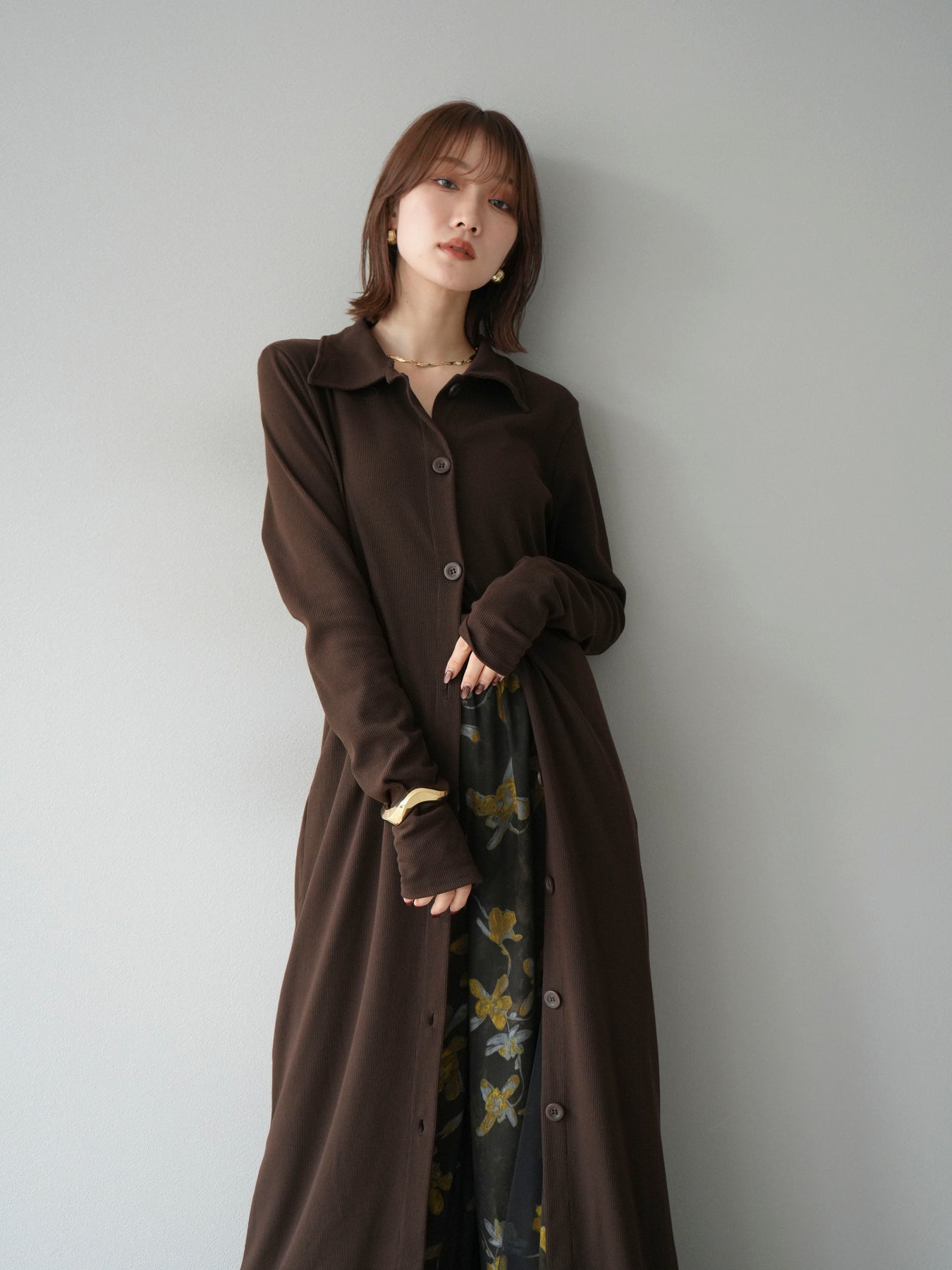クラシカルな襟付きデザインにフロントボタンをあしらったカットリブ素材のワンピース。縦長シルエットと程よいフィット感で、女性らしいすっきりとした印象に。全ボタン開閉可能で羽織りとしても着回せる2WAY仕様。1枚での着用はもちろん、パンツとのレイヤードにも活躍。ロングシーズン使える汎用性の高い一着。