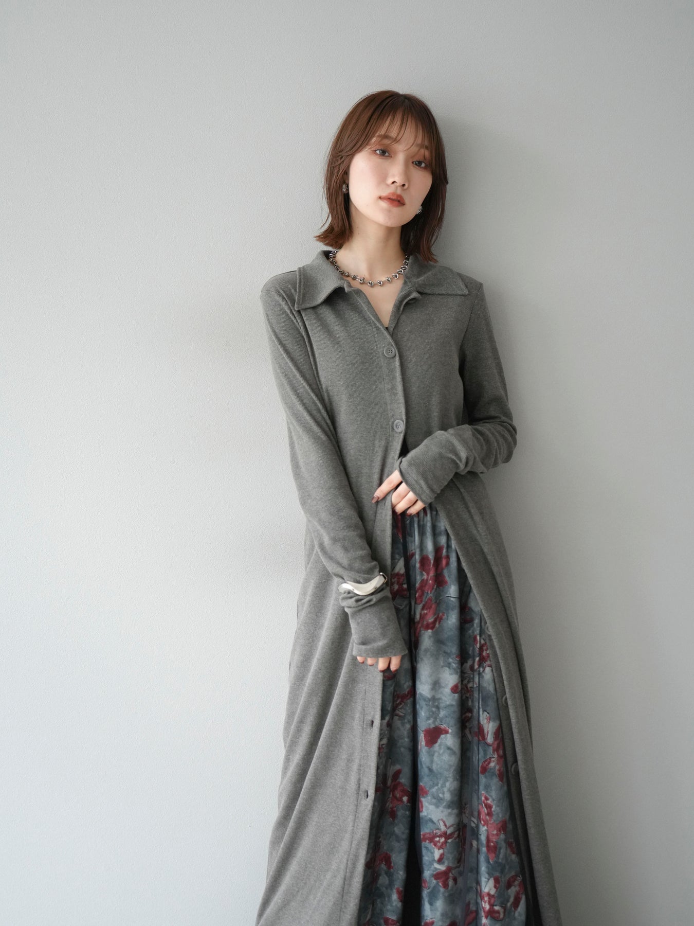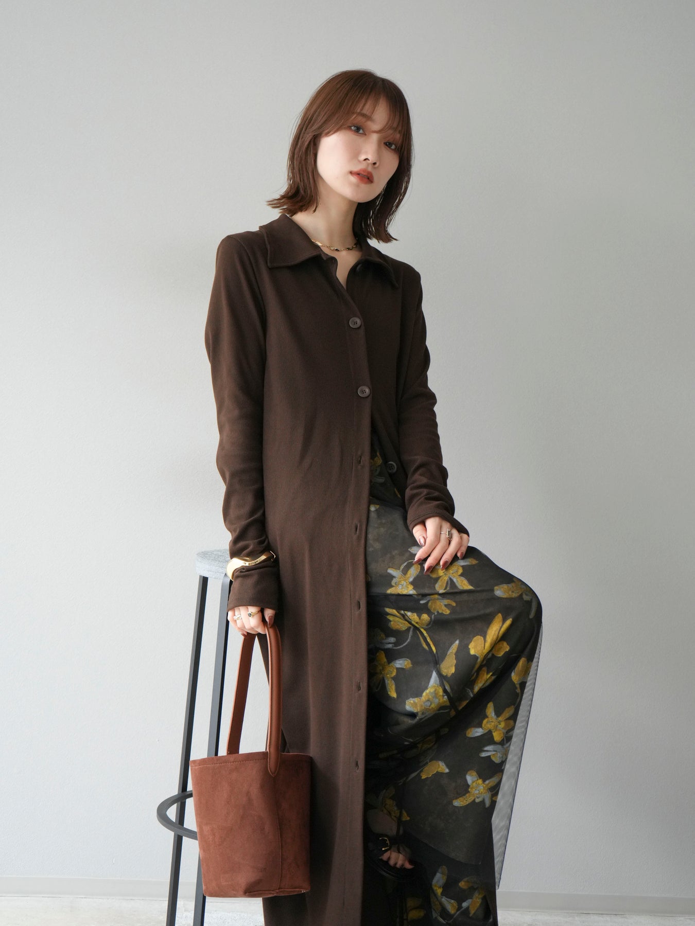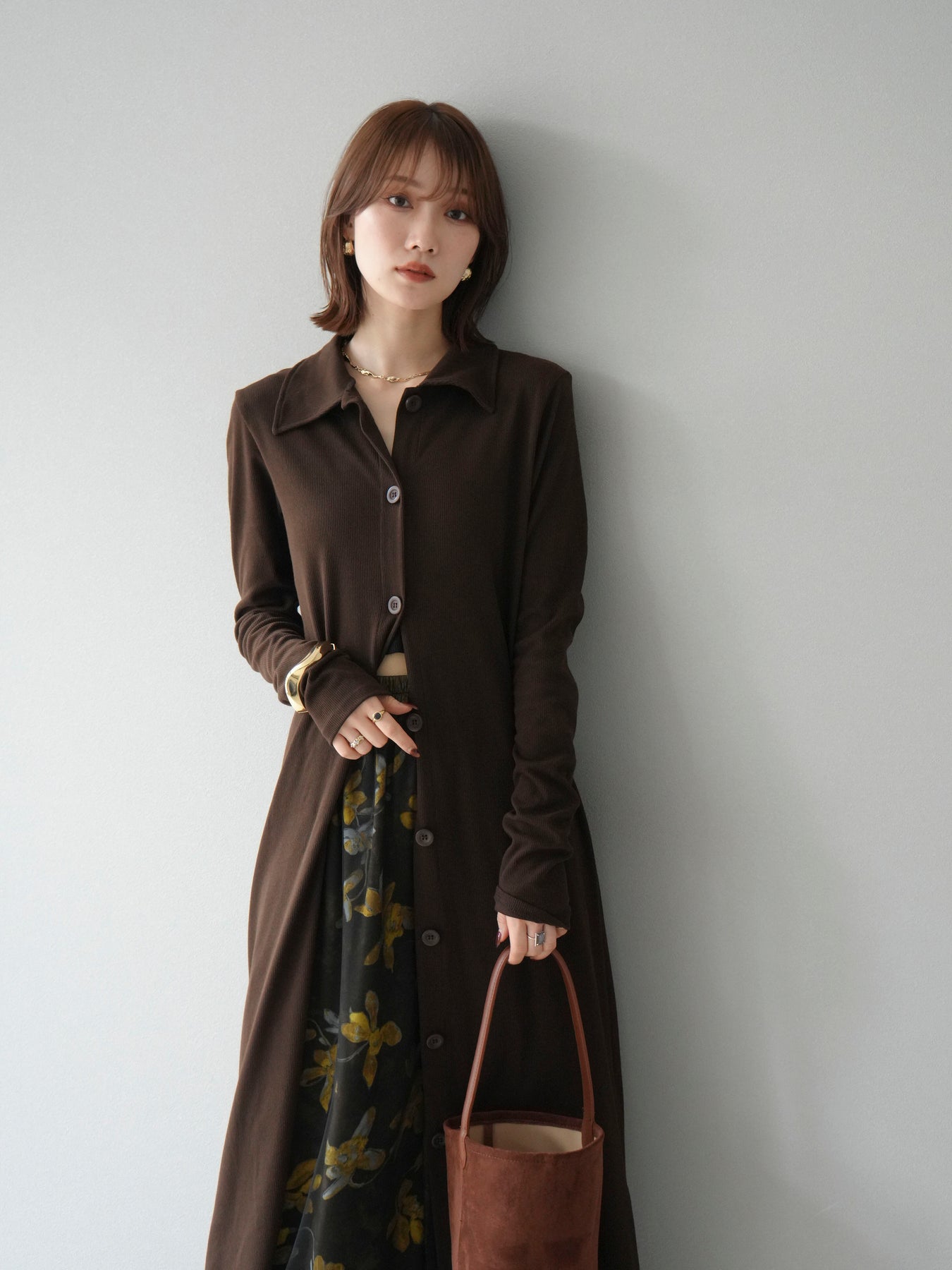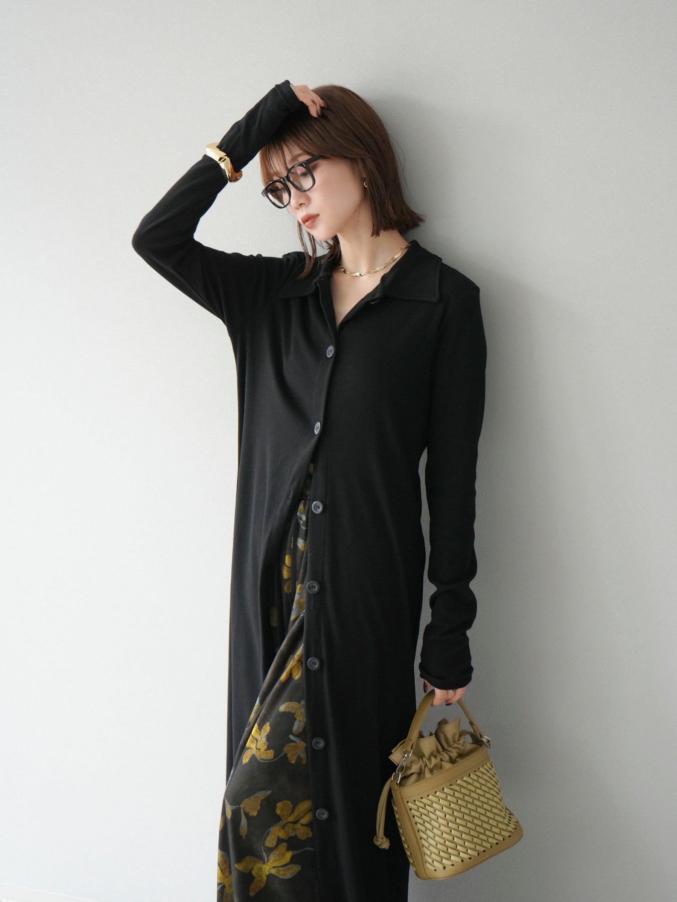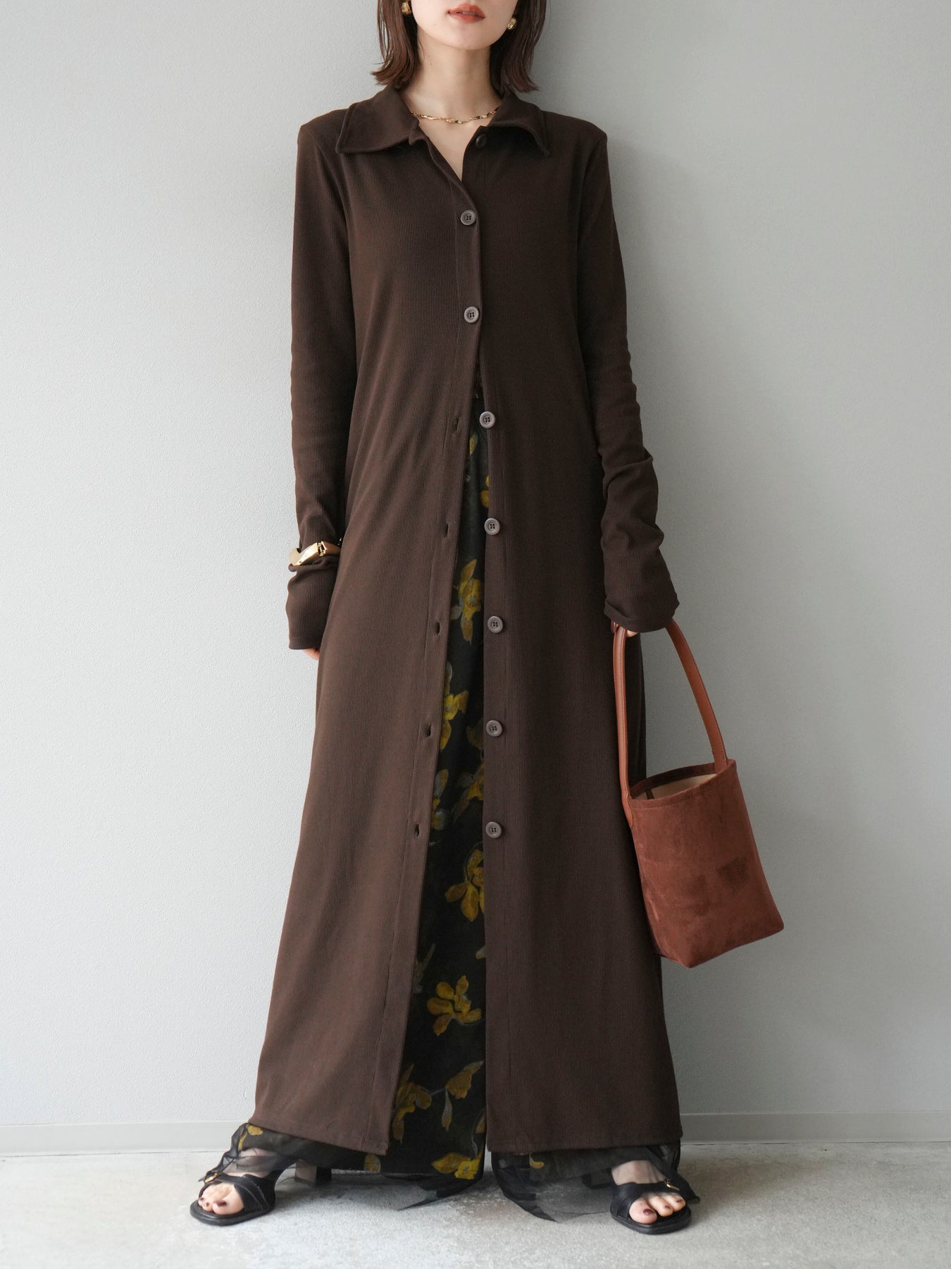 クラシカルな襟付きデザインにフロントボタンをあしらったカットリブ素材のワンピース。縦長シルエットと程よいフィット感で、女性らしいすっきりとした印象に。全ボタン開閉可能で羽織りとしても着回せる2WAY仕様。1枚での着用はもちろん、パンツとのレイヤードにも活躍。ロングシーズン使える汎用性の高い一着。