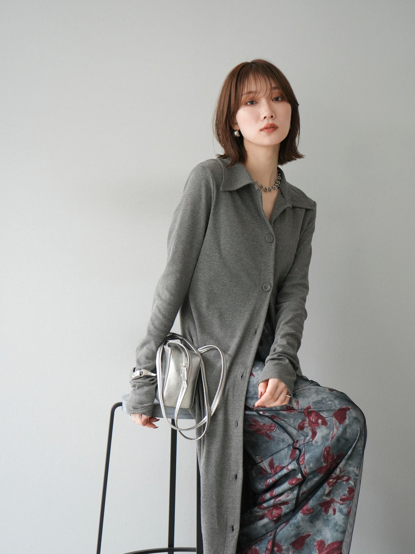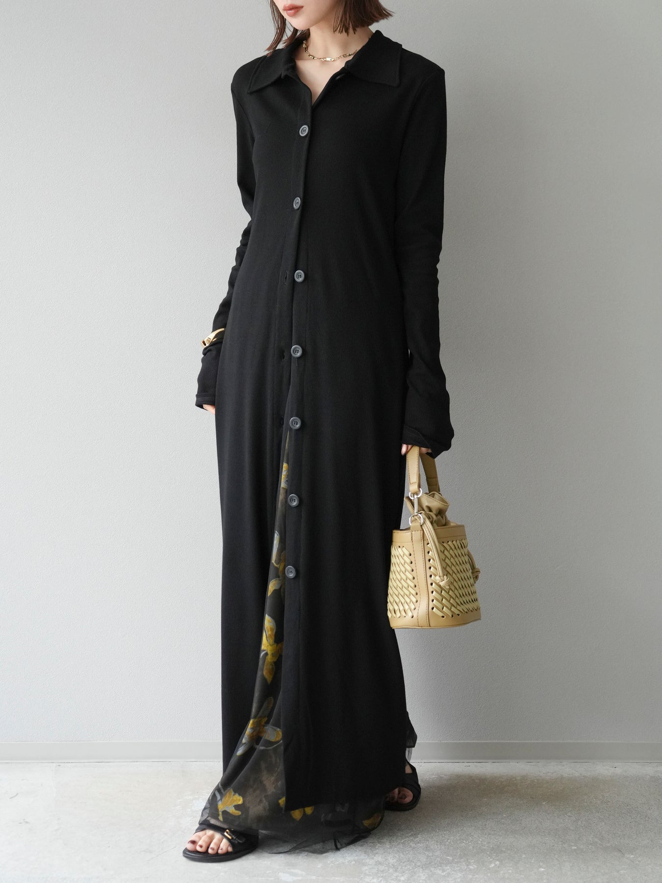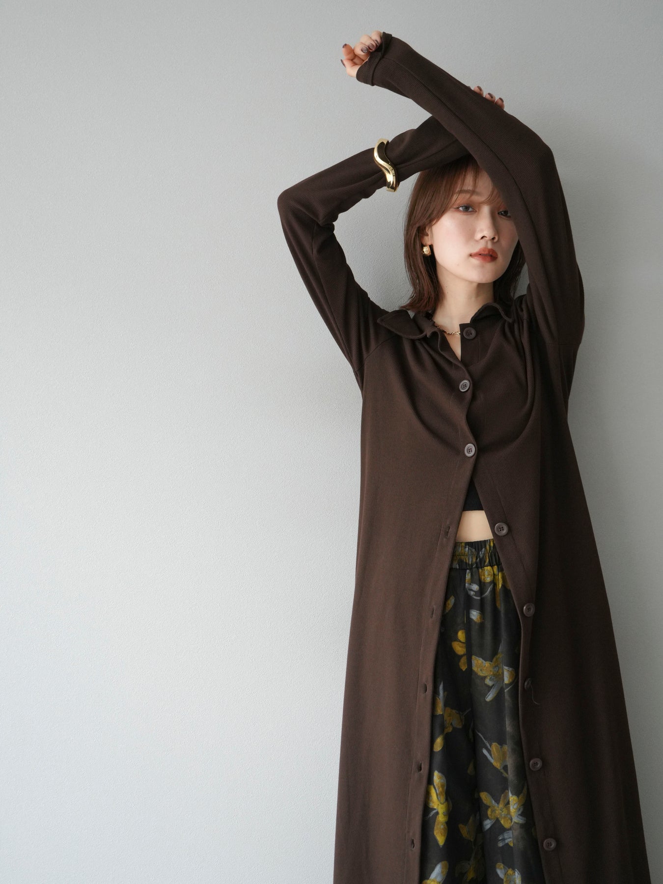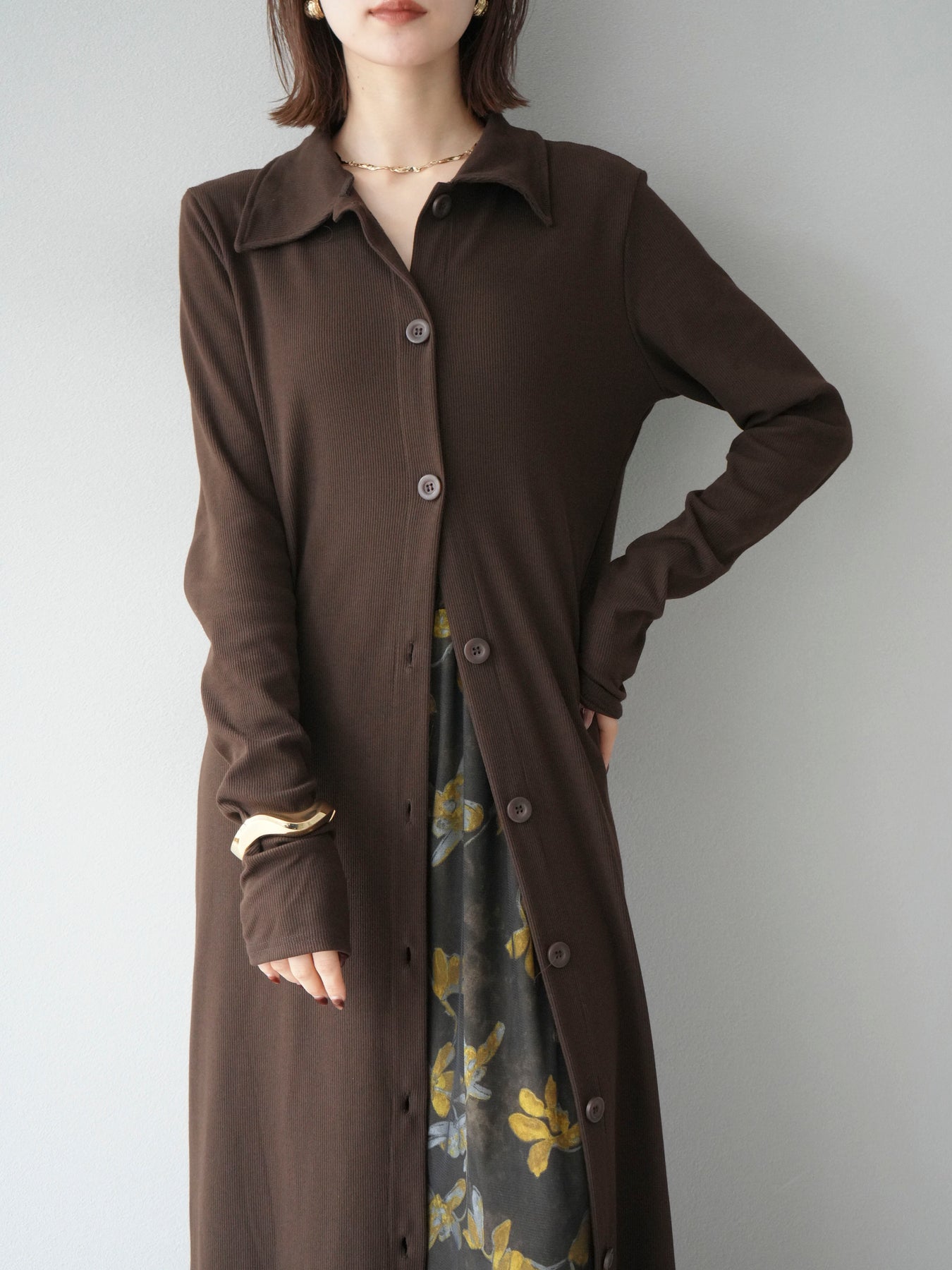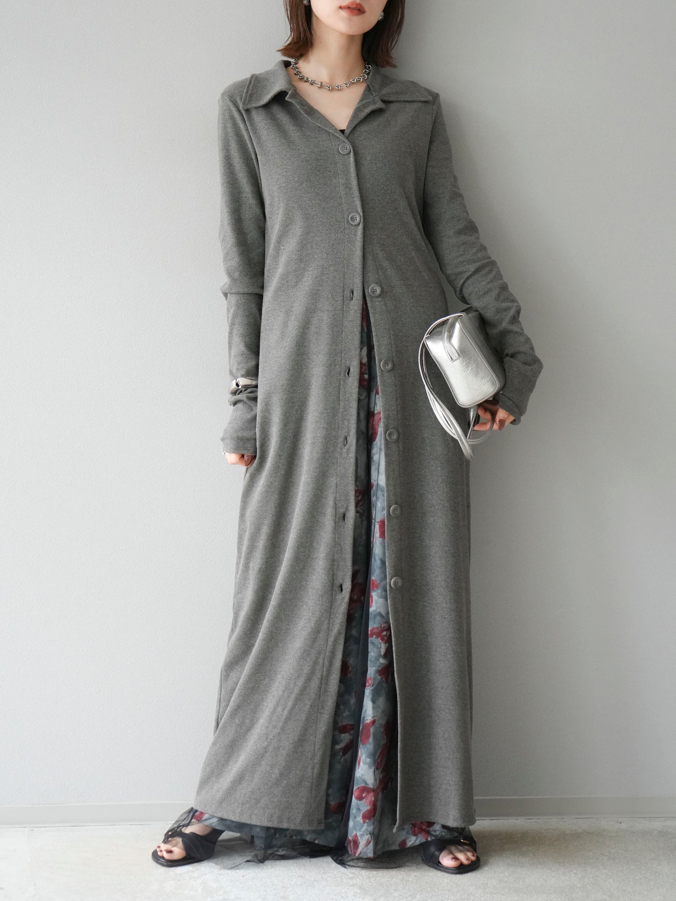 クラシカルな襟付きデザインにフロントボタンをあしらったカットリブ素材のワンピース。縦長シルエットと程よいフィット感で、女性らしいすっきりとした印象に。全ボタン開閉可能で羽織りとしても着回せる2WAY仕様。1枚での着用はもちろん、パンツとのレイヤードにも活躍。ロングシーズン使える汎用性の高い一着。