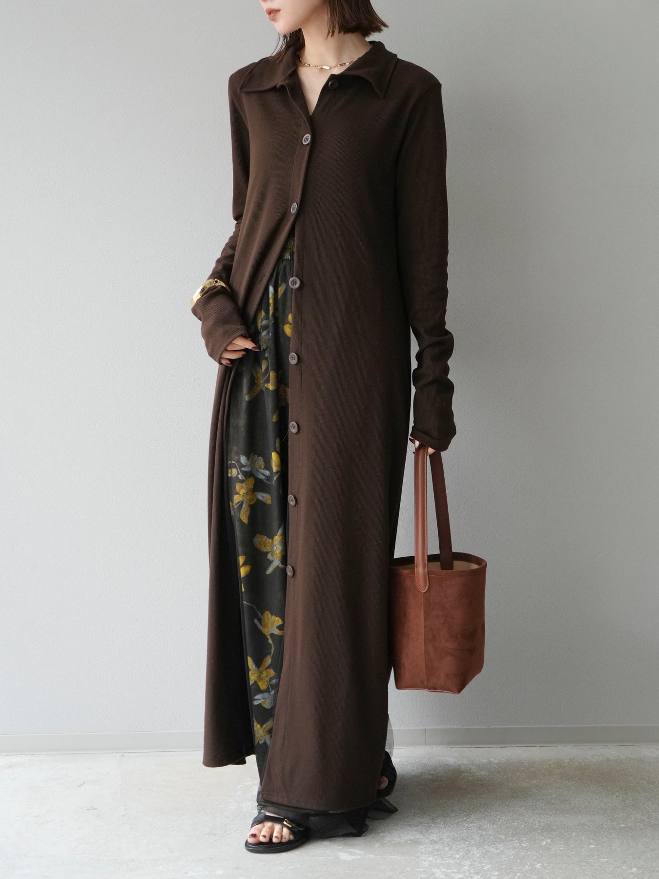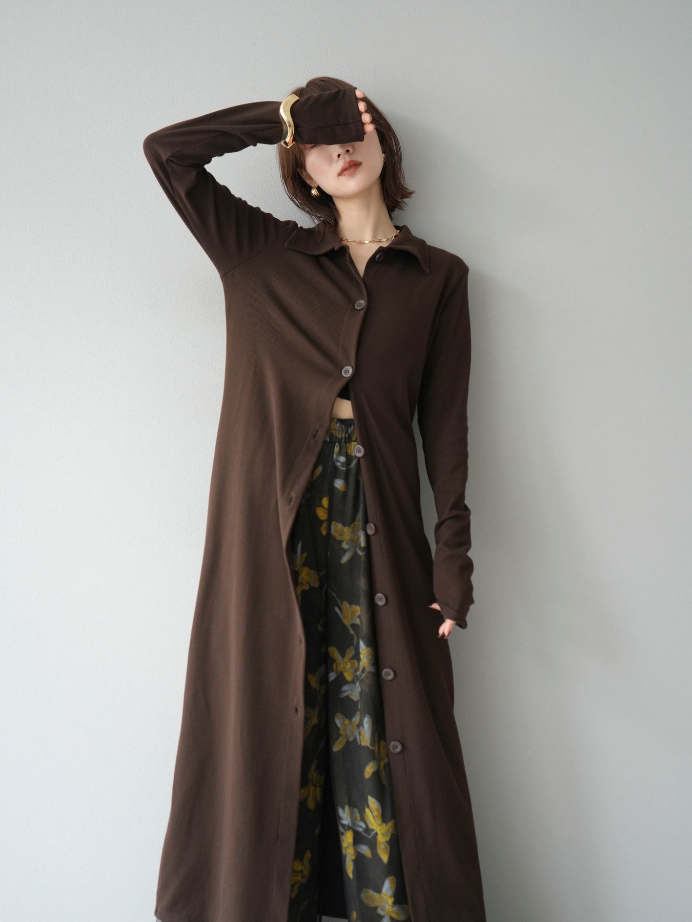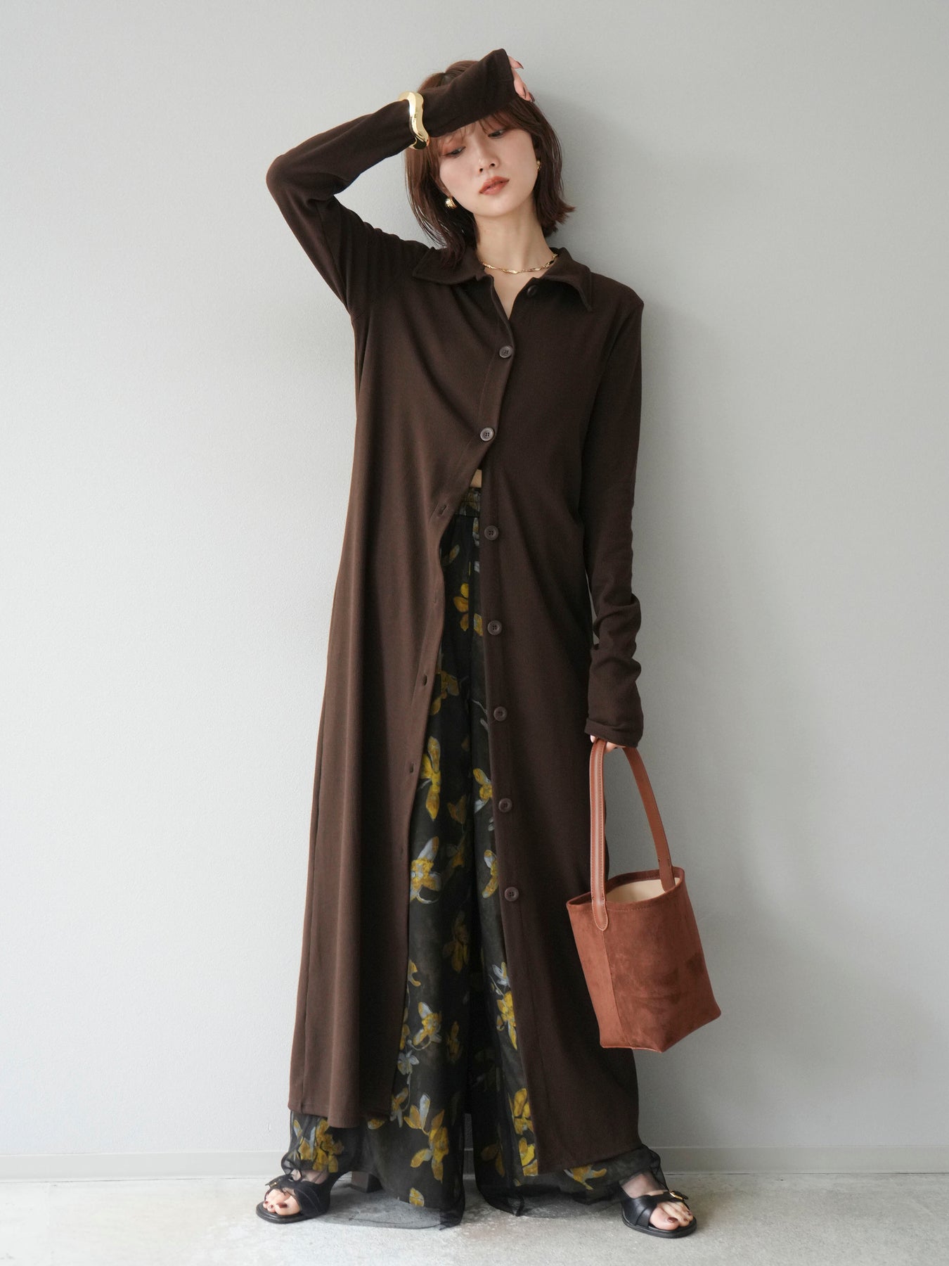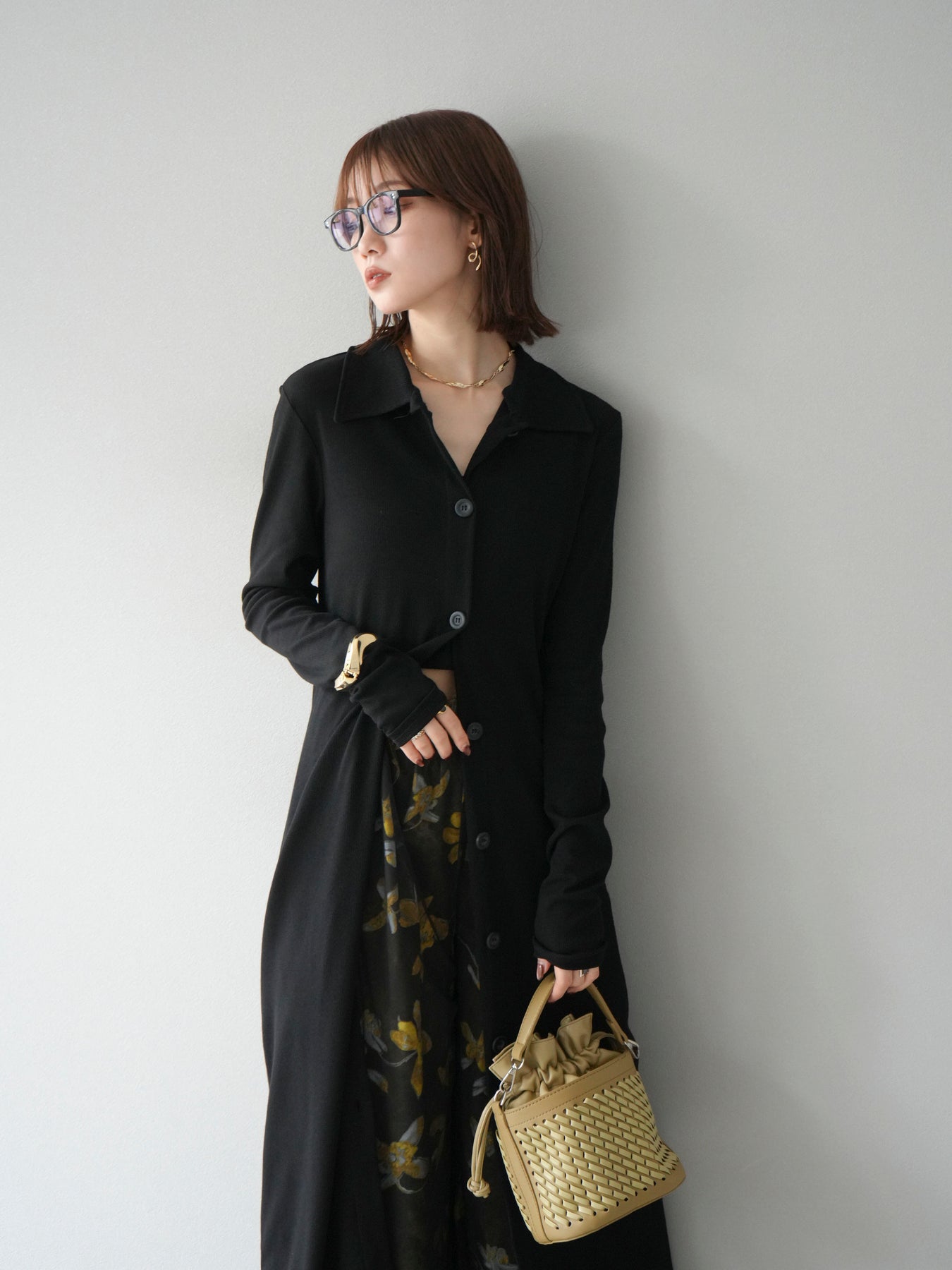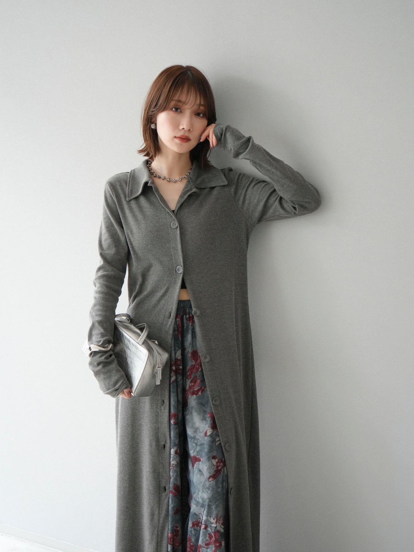 クラシカルな襟付きデザインにフロントボタンをあしらったカットリブ素材のワンピース。縦長シルエットと程よいフィット感で、女性らしいすっきりとした印象に。全ボタン開閉可能で羽織りとしても着回せる2WAY仕様。1枚での着用はもちろん、パンツとのレイヤードにも活躍。ロングシーズン使える汎用性の高い一着。