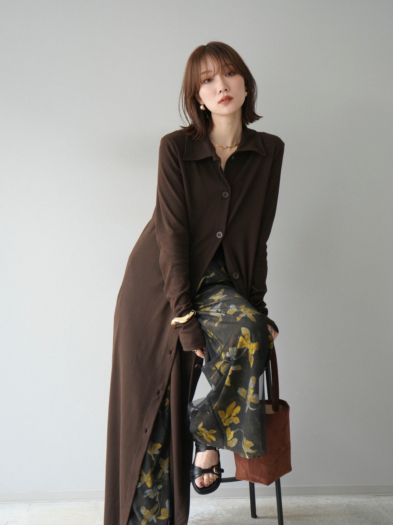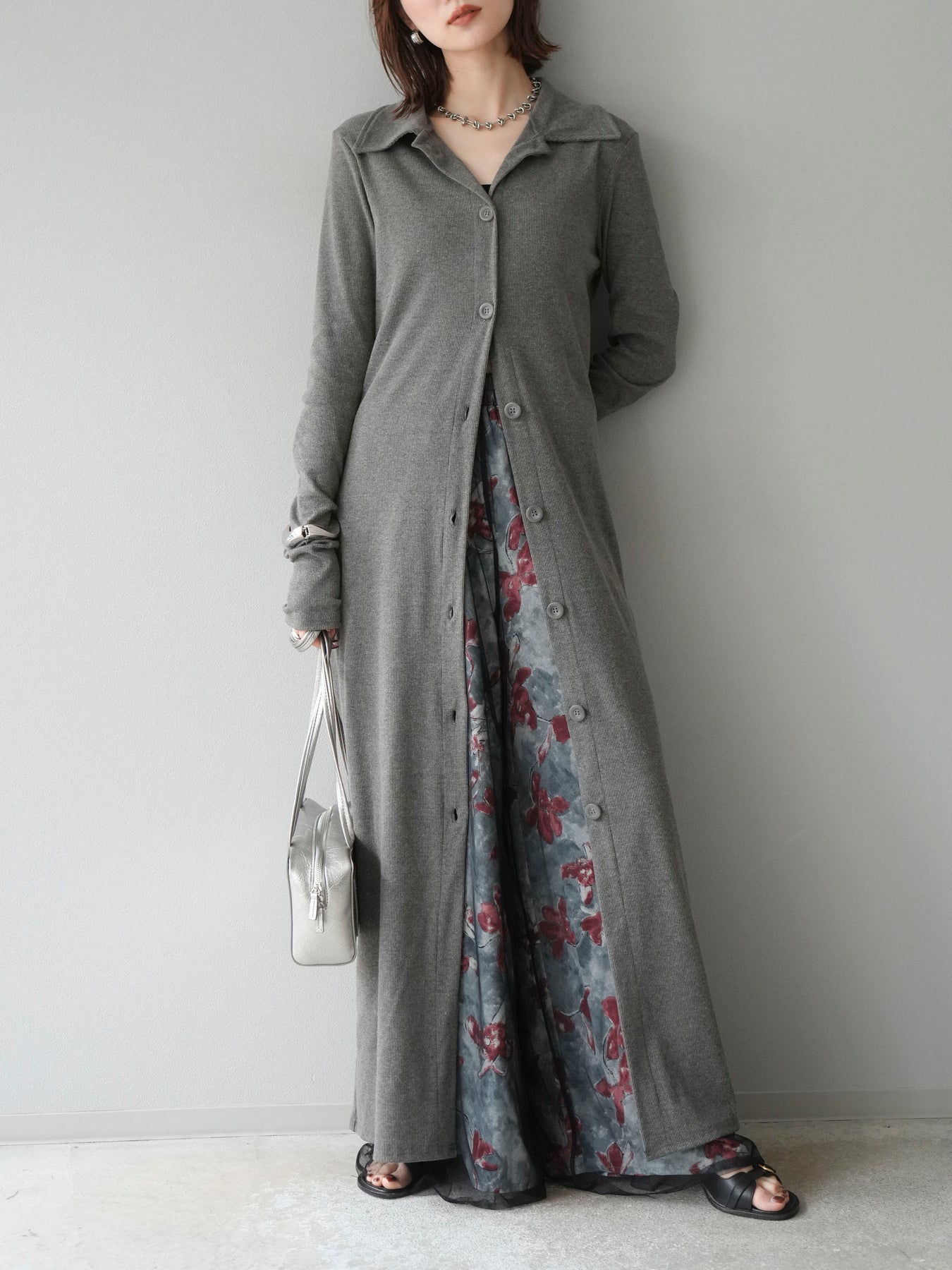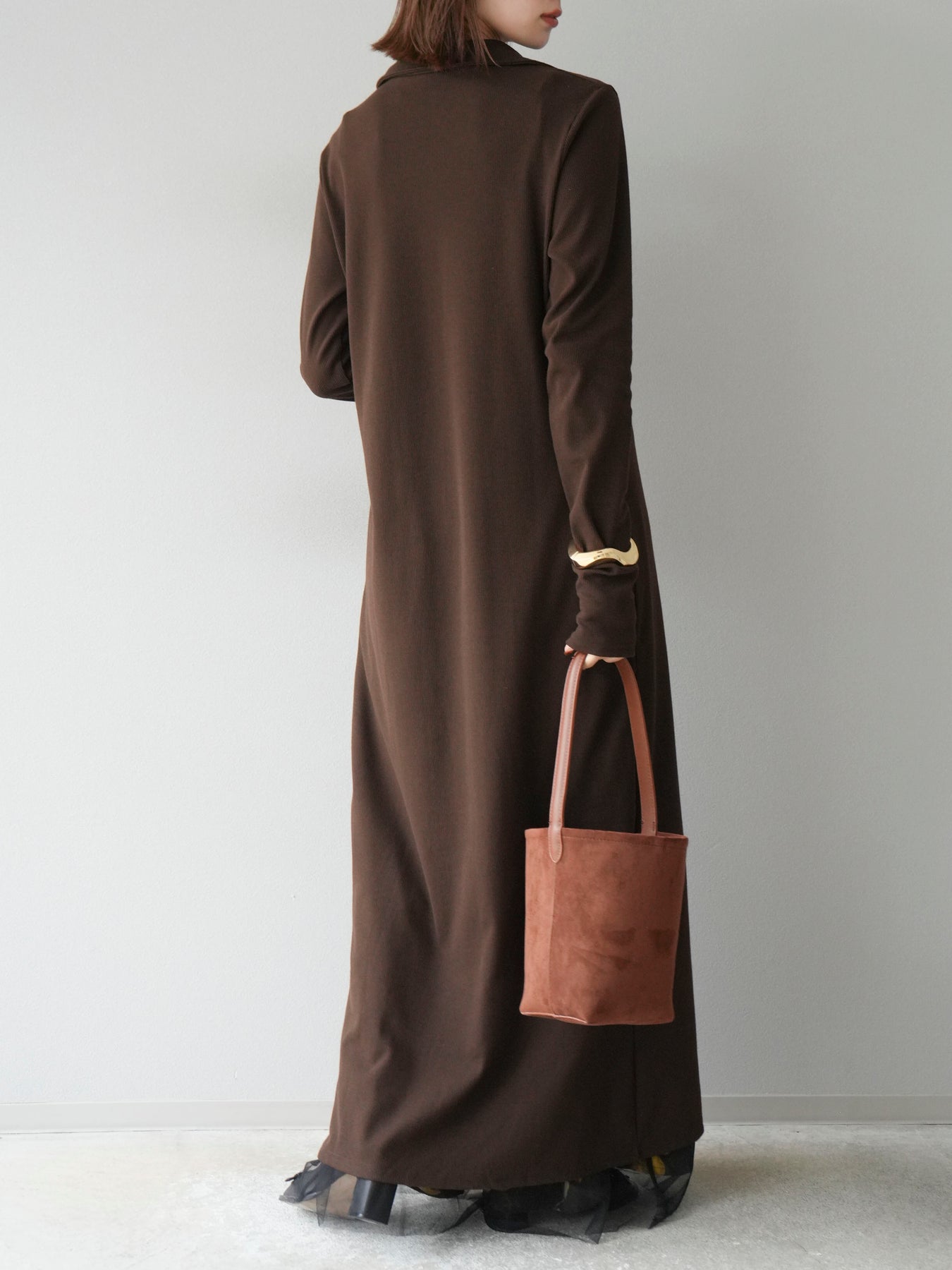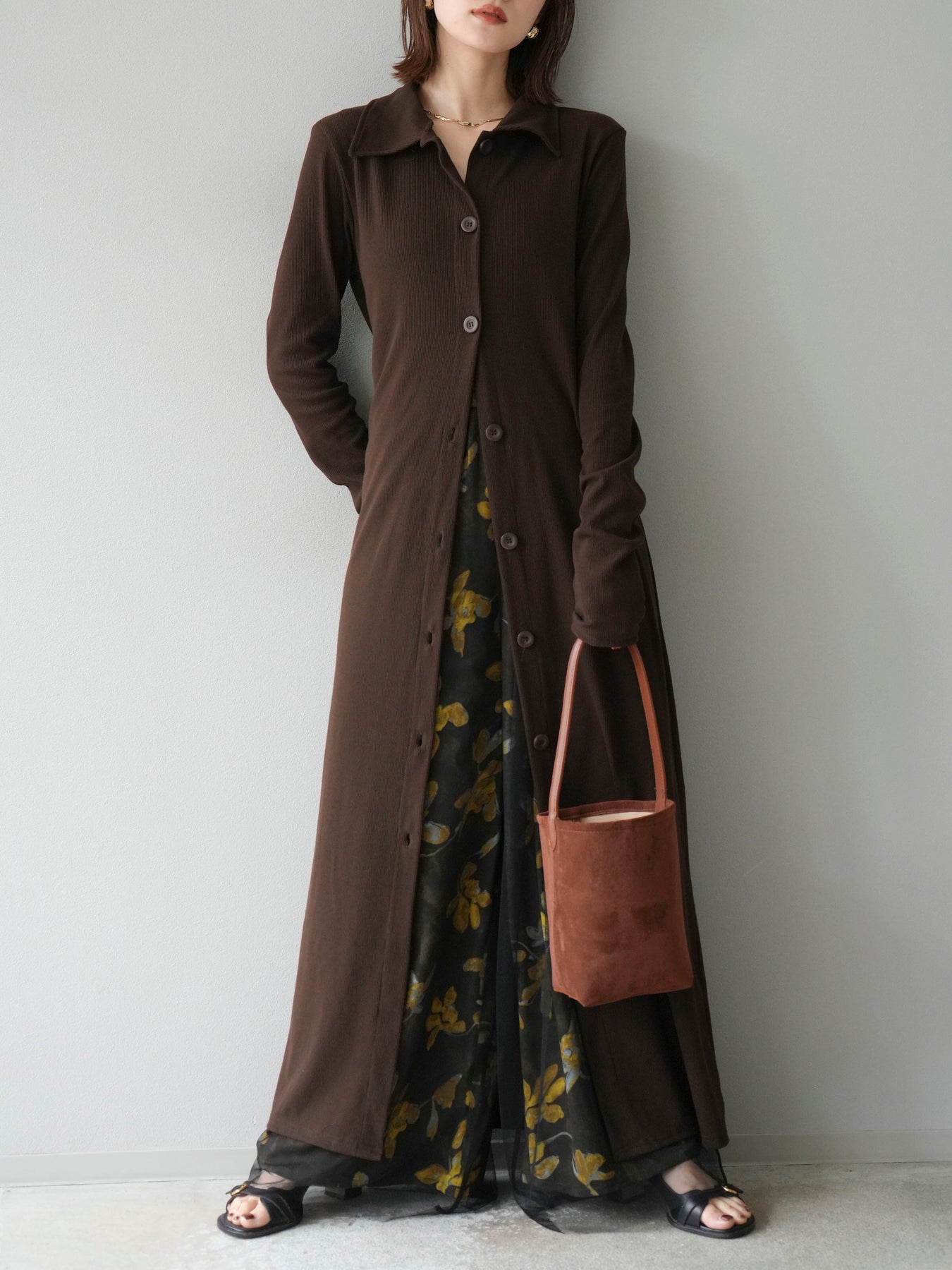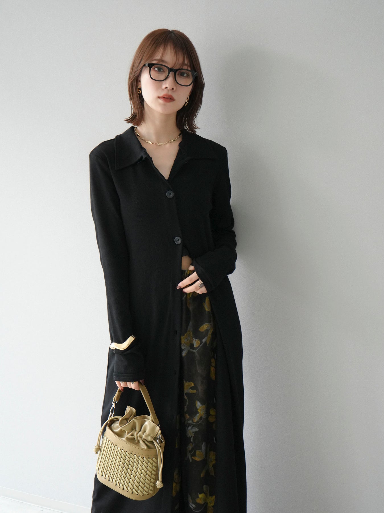 クラシカルな襟付きデザインにフロントボタンをあしらったカットリブ素材のワンピース。縦長シルエットと程よいフィット感で、女性らしいすっきりとした印象に。全ボタン開閉可能で羽織りとしても着回せる2WAY仕様。1枚での着用はもちろん、パンツとのレイヤードにも活躍。ロングシーズン使える汎用性の高い一着。