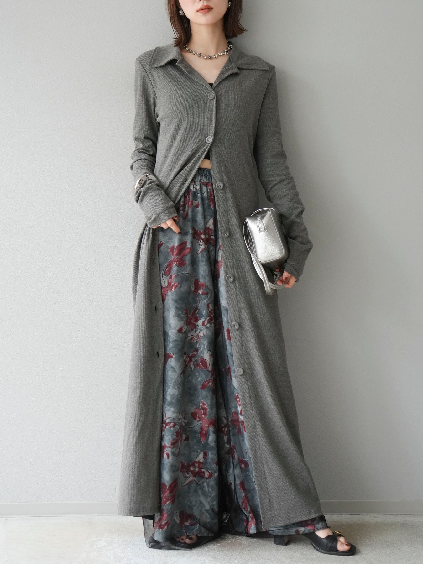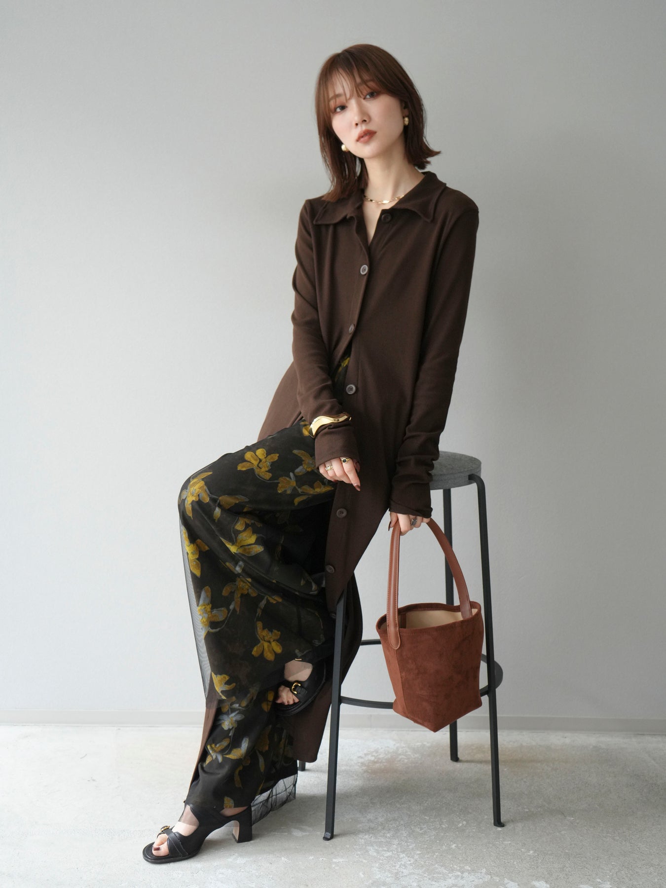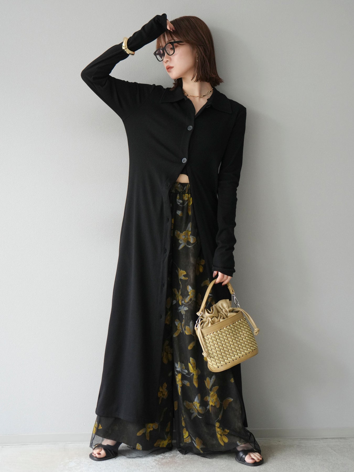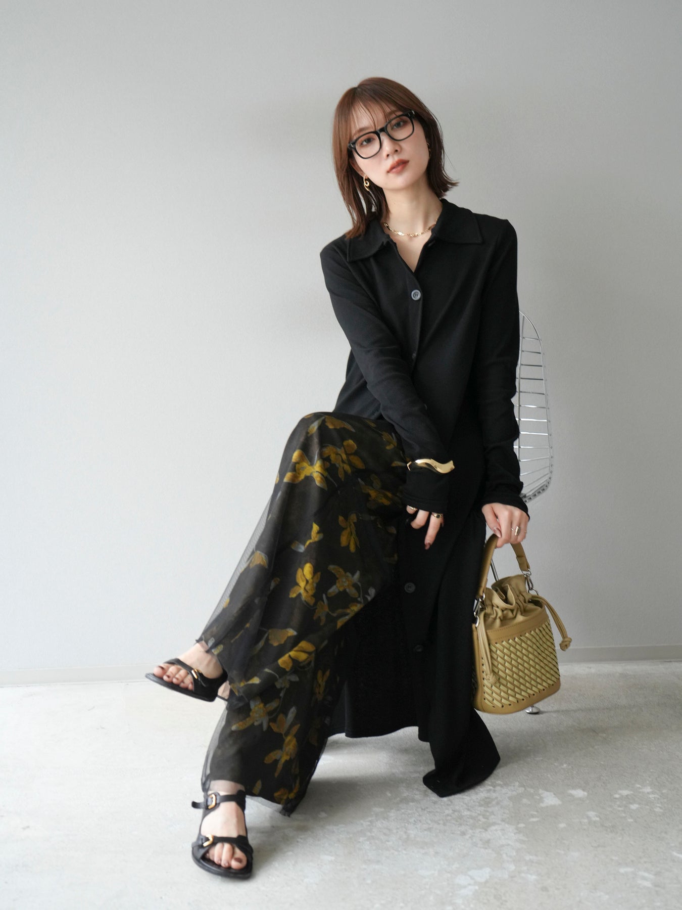 [SET]襟付きカットリブボタンワンピース+フラワープリントチュールレイヤードパンツ(2set)