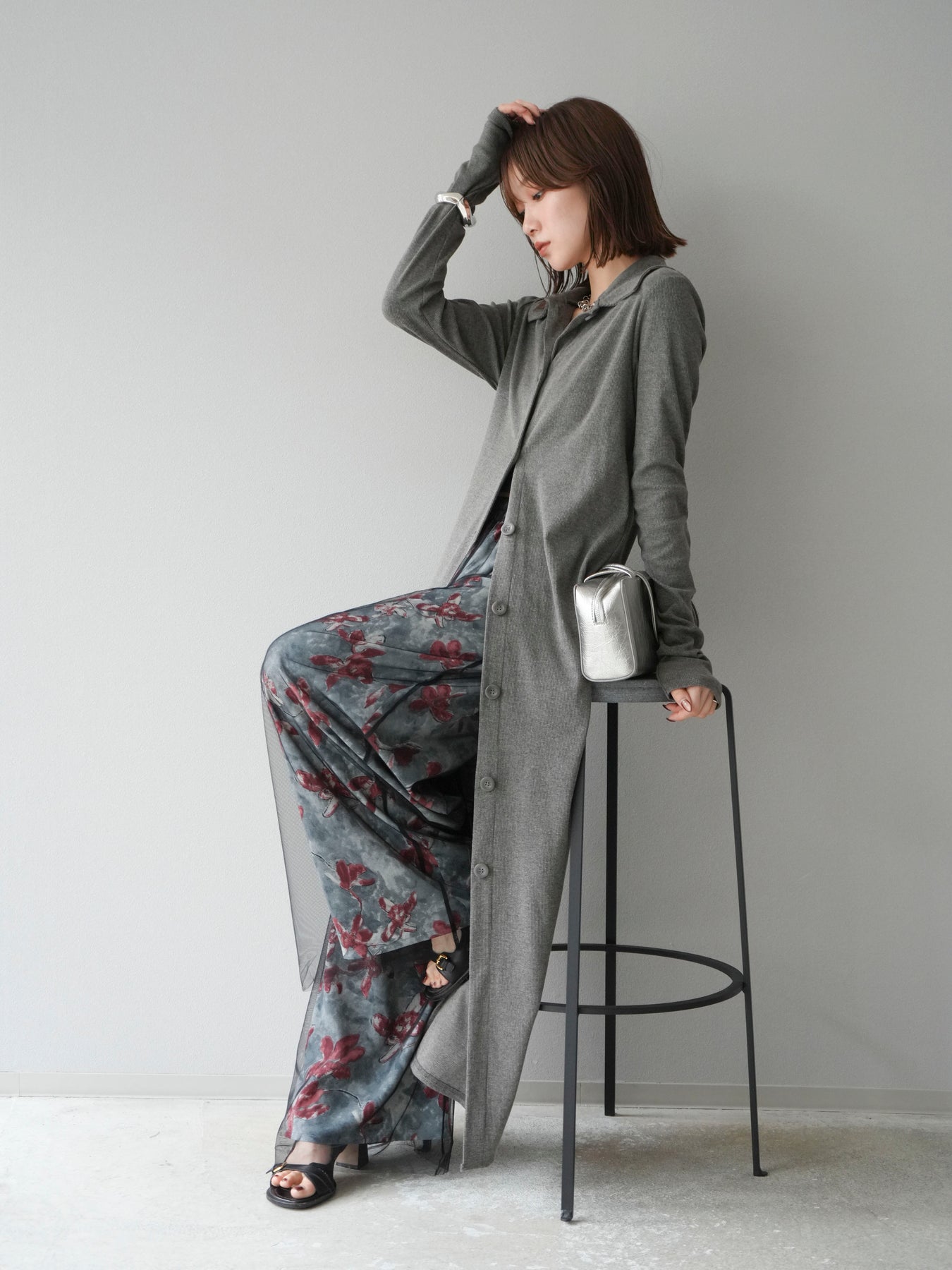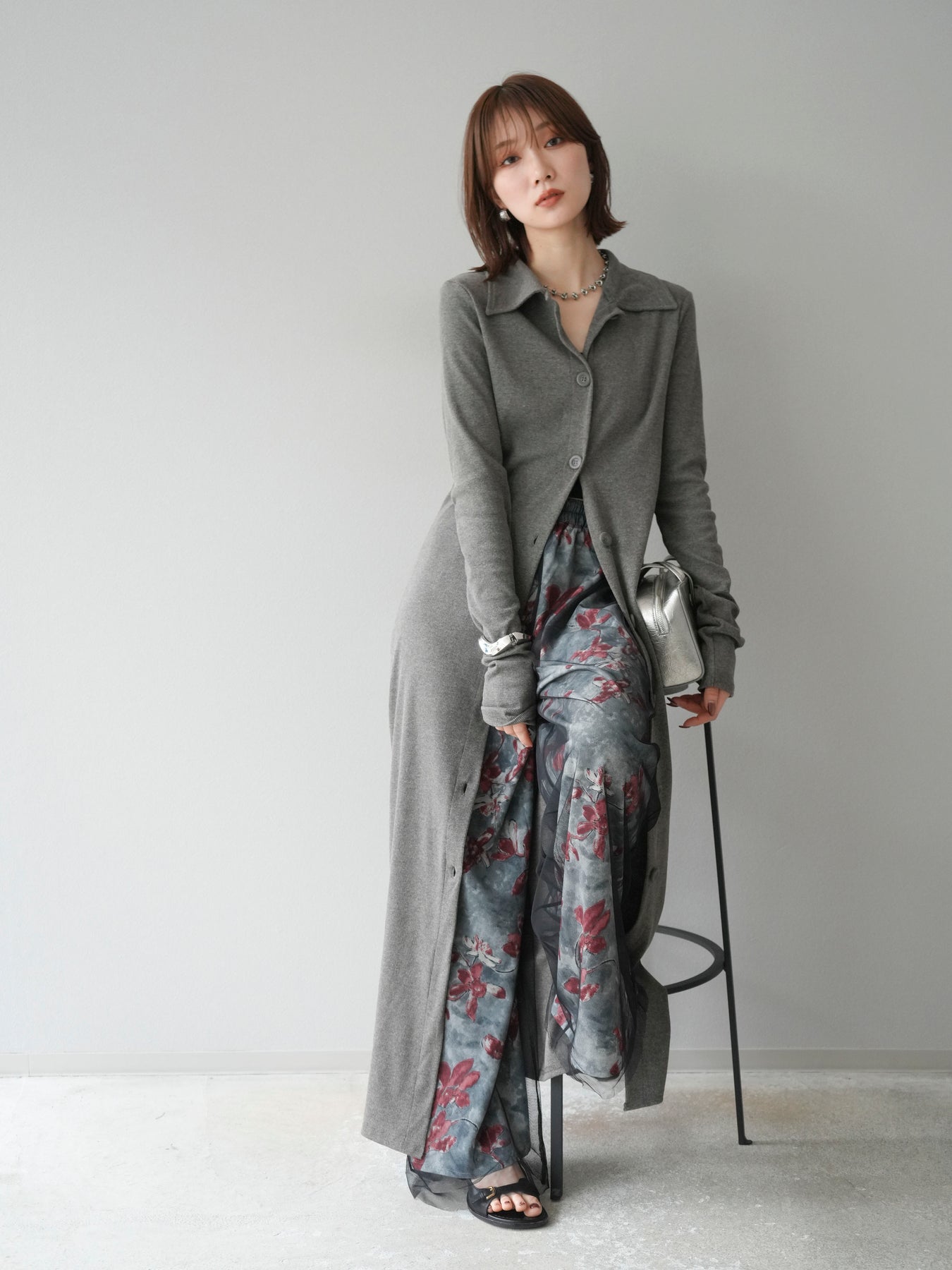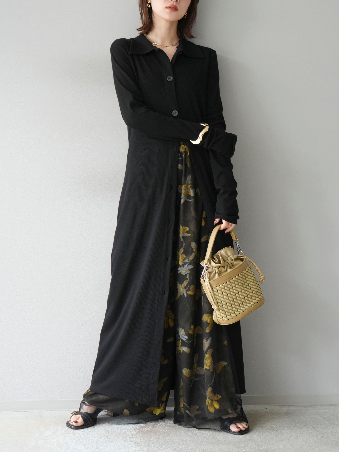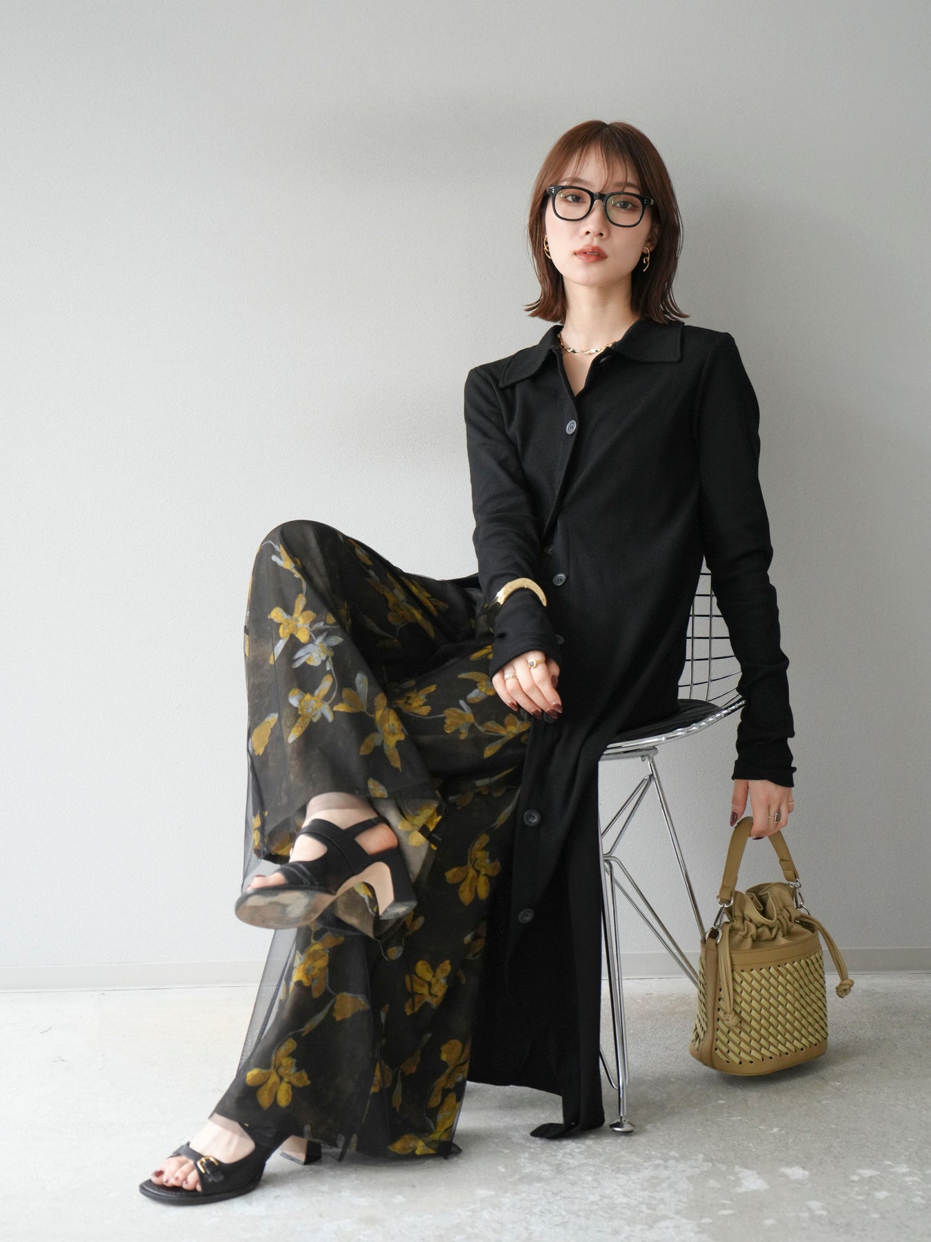 [SET]襟付きカットリブボタンワンピース+フラワープリントチュールレイヤードパンツ(2set)