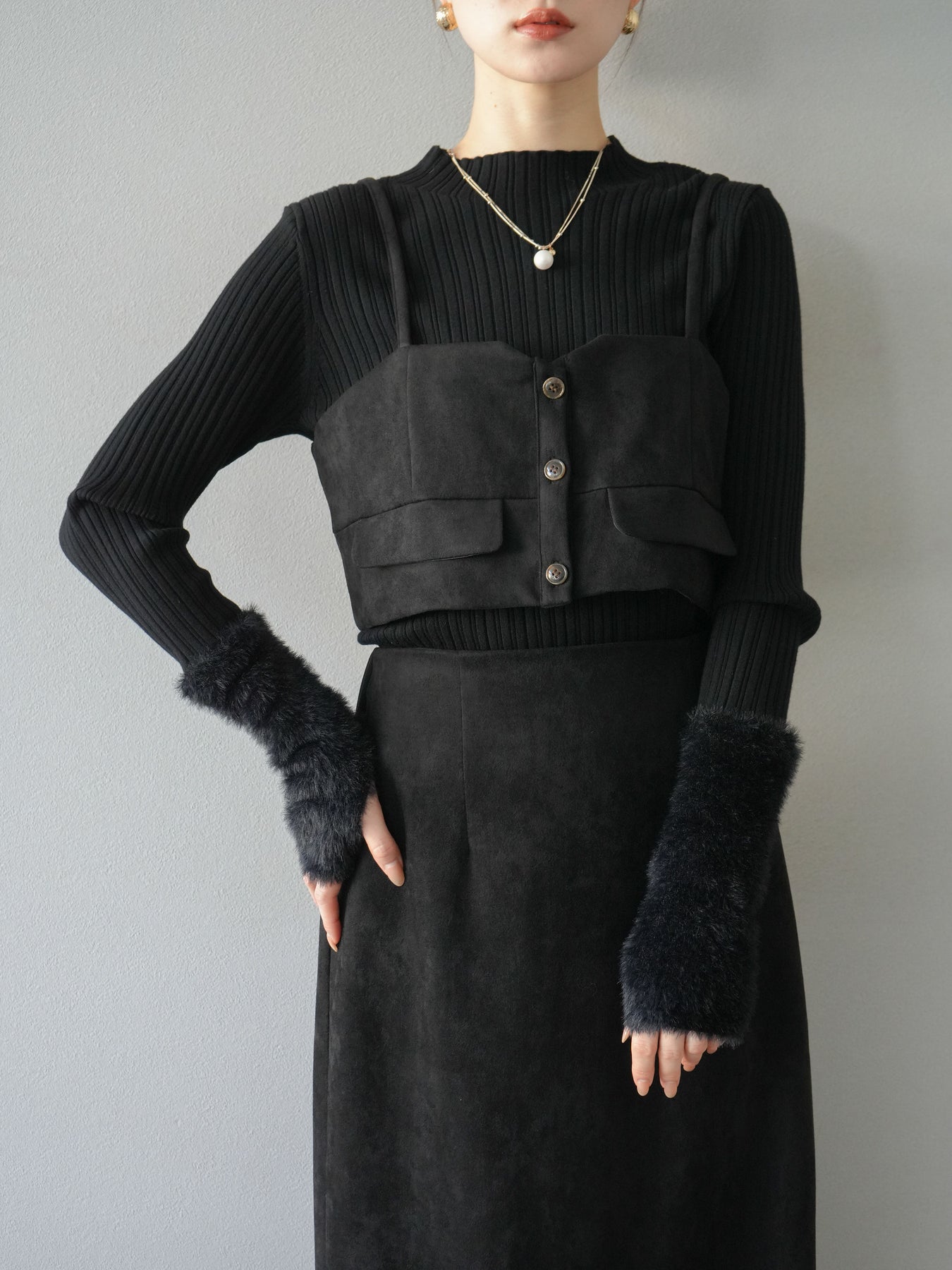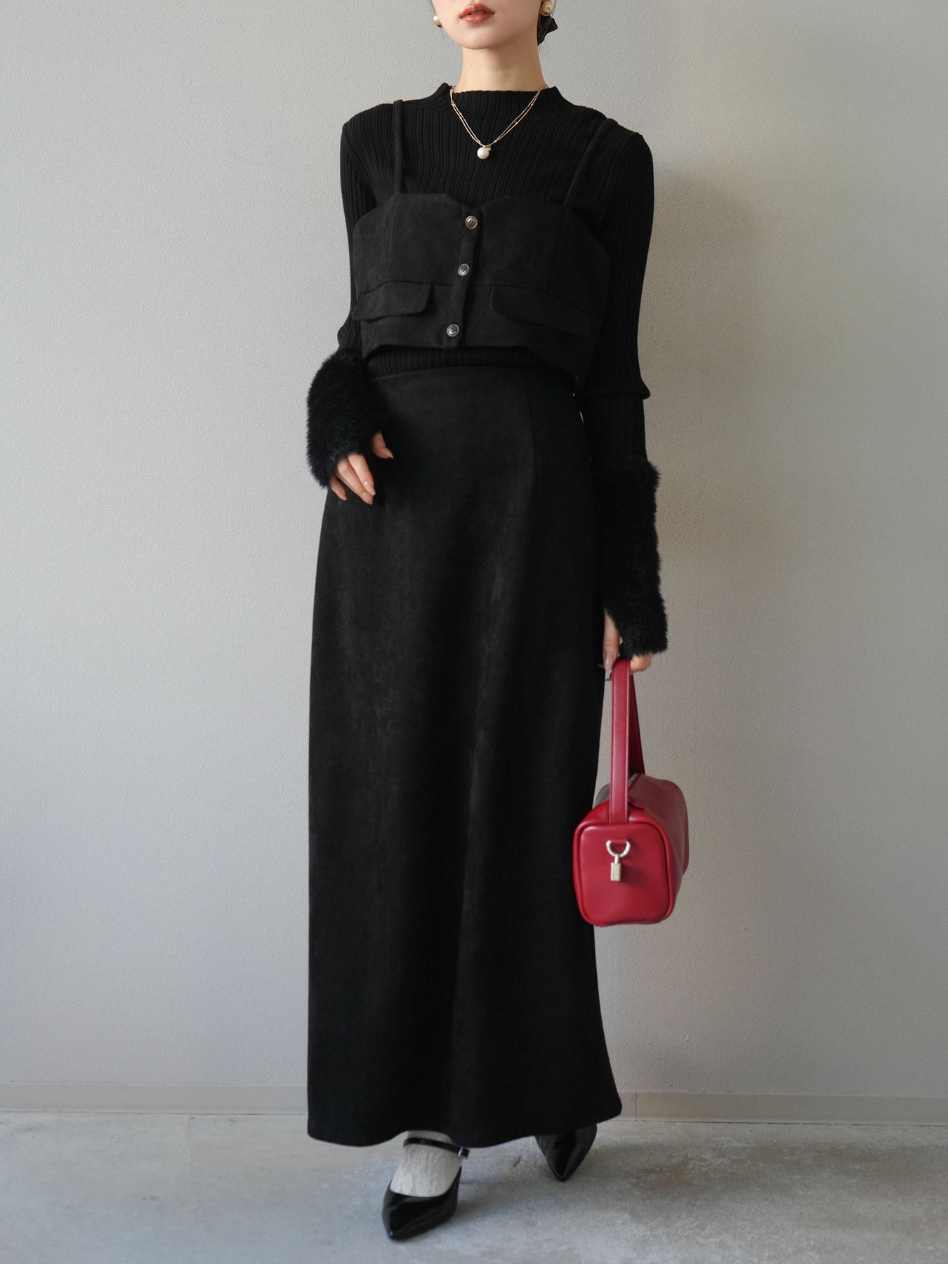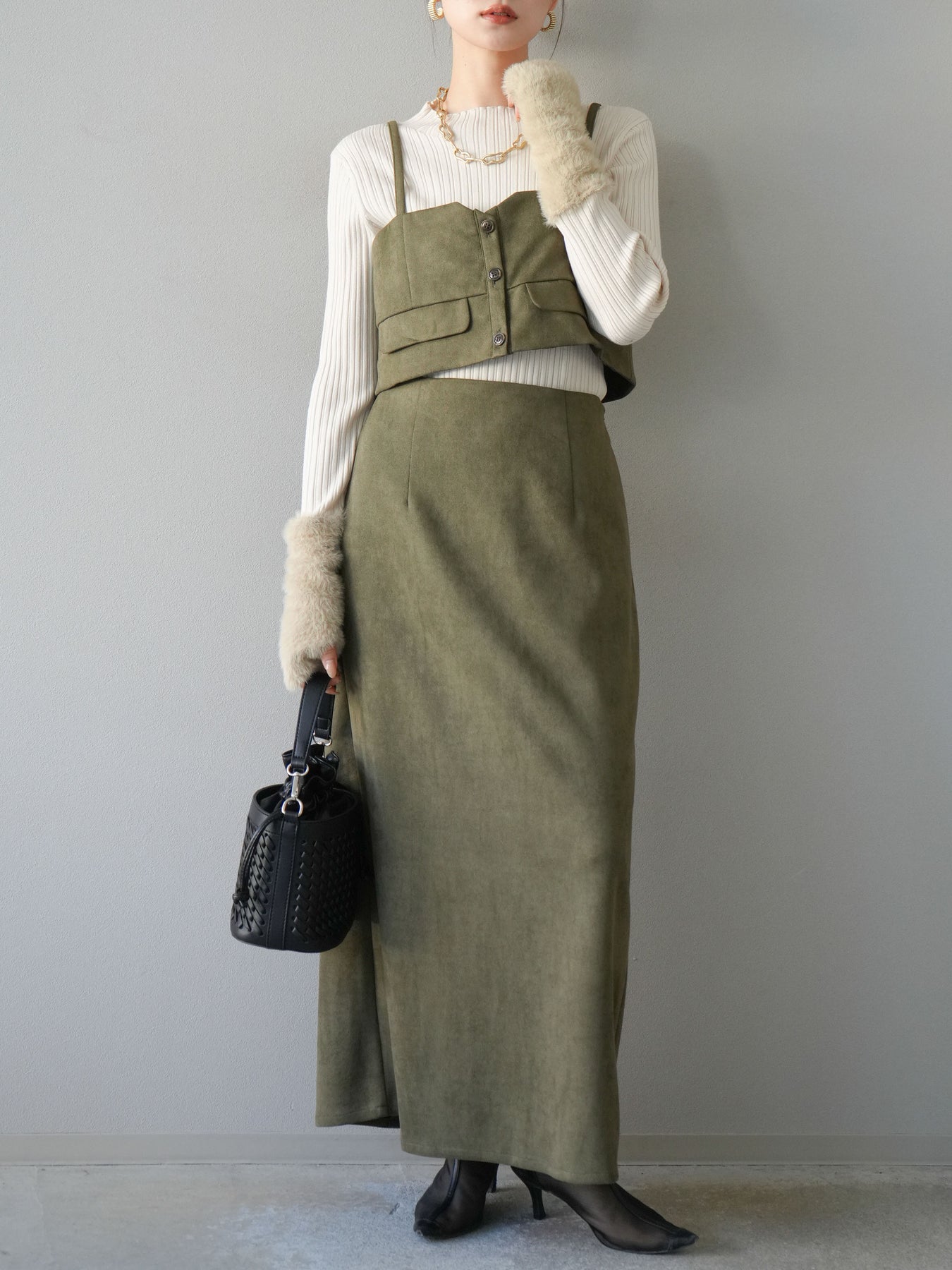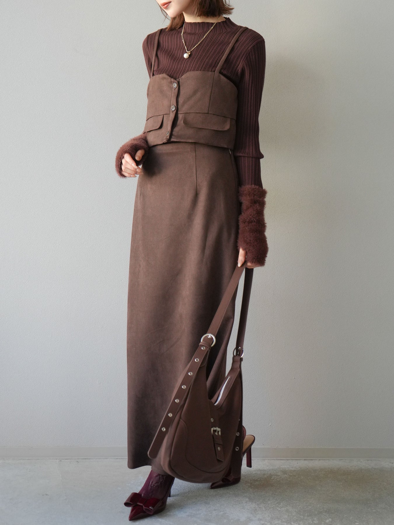 [SET]スウェードビスチェ+アームシャギーランダムリブニットトップス+スウェードIラインスカート(3set)
