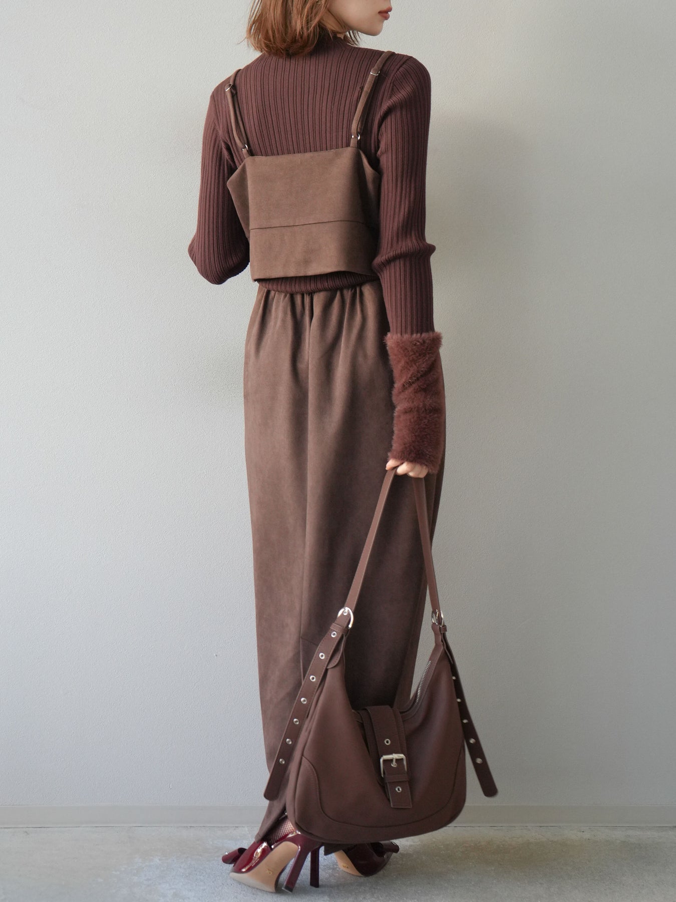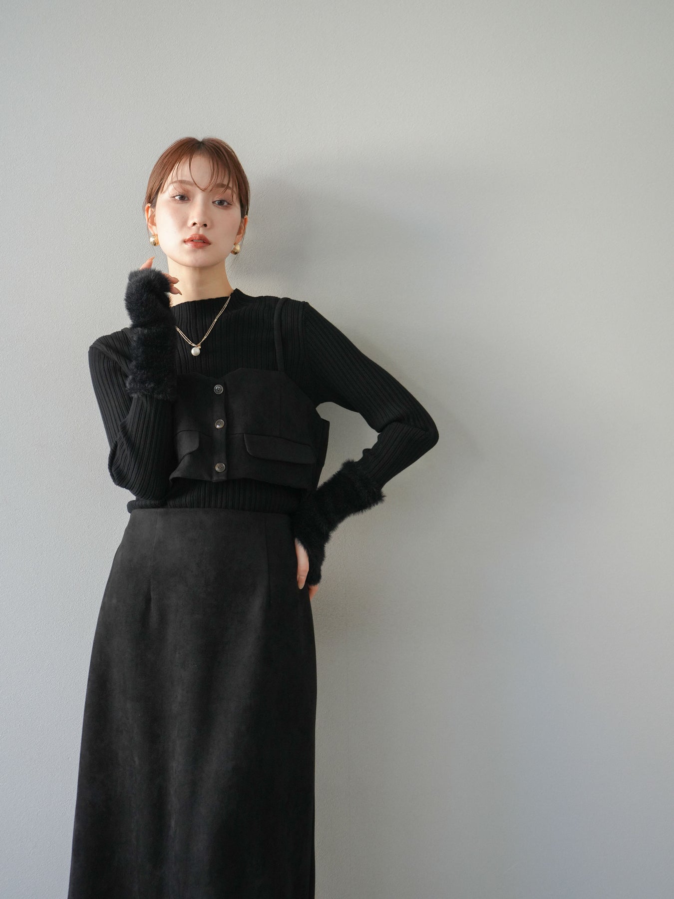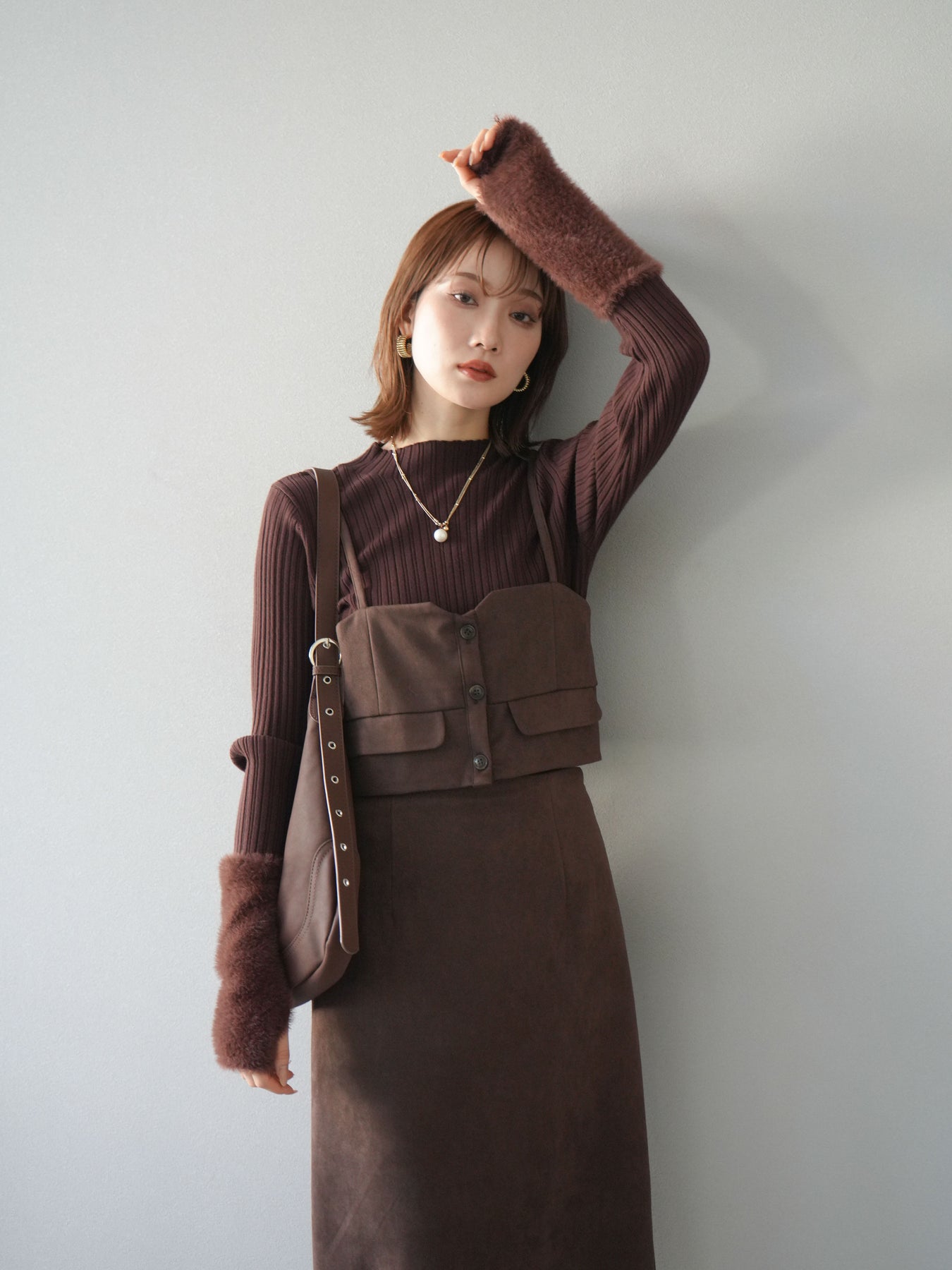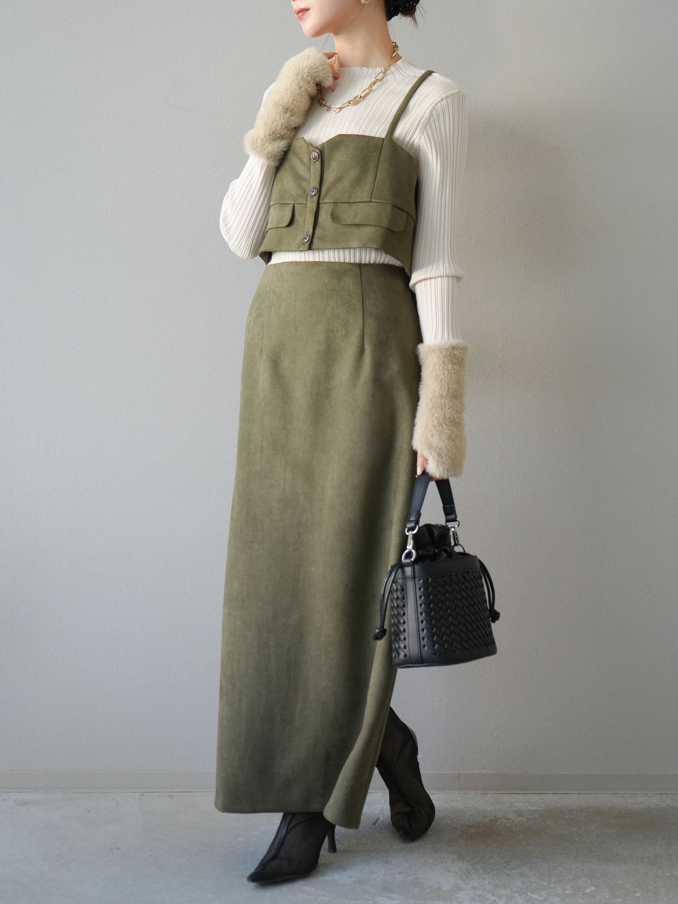 [SET]スウェードビスチェ+アームシャギーランダムリブニットトップス+スウェードIラインスカート(3set)