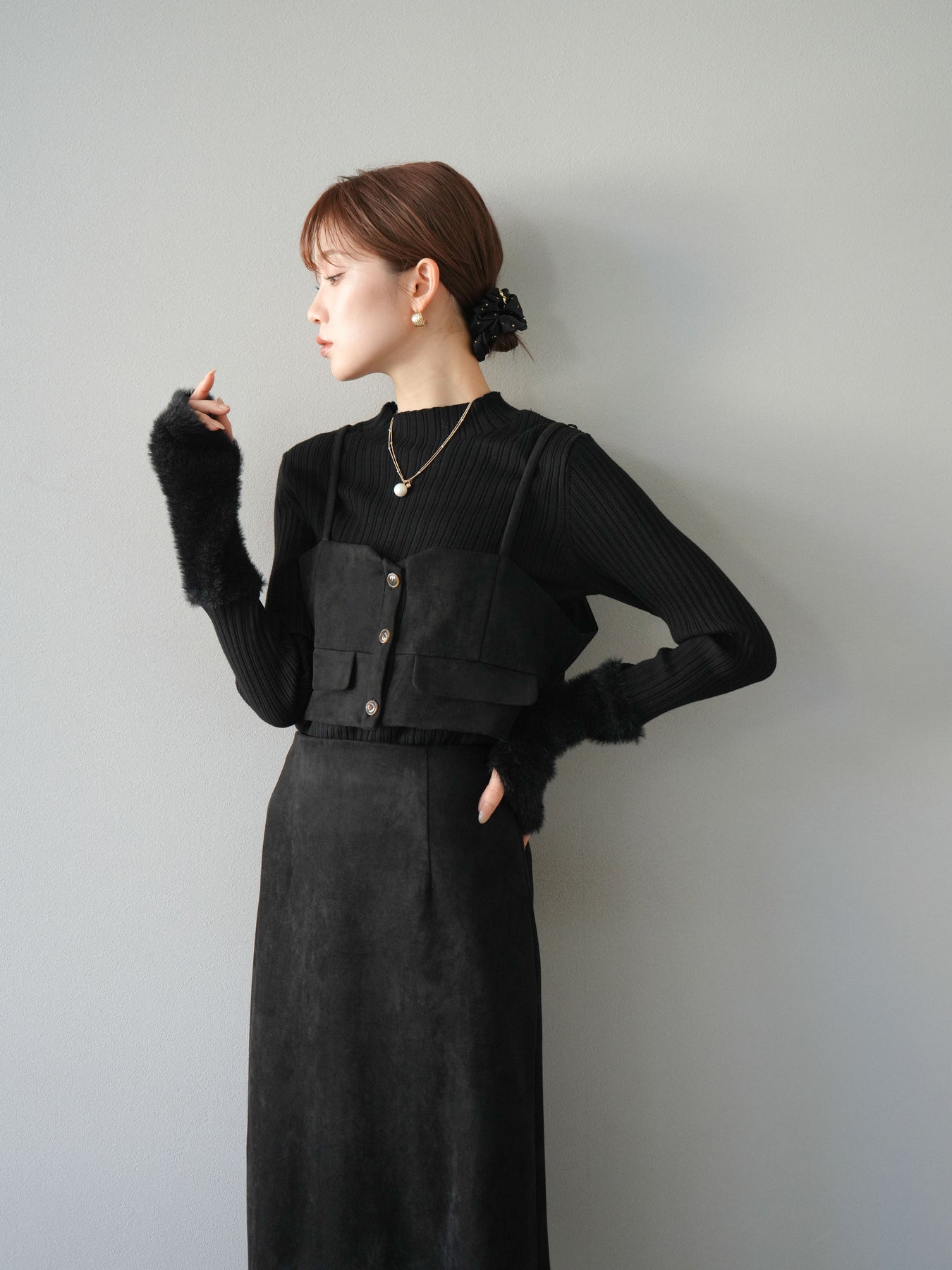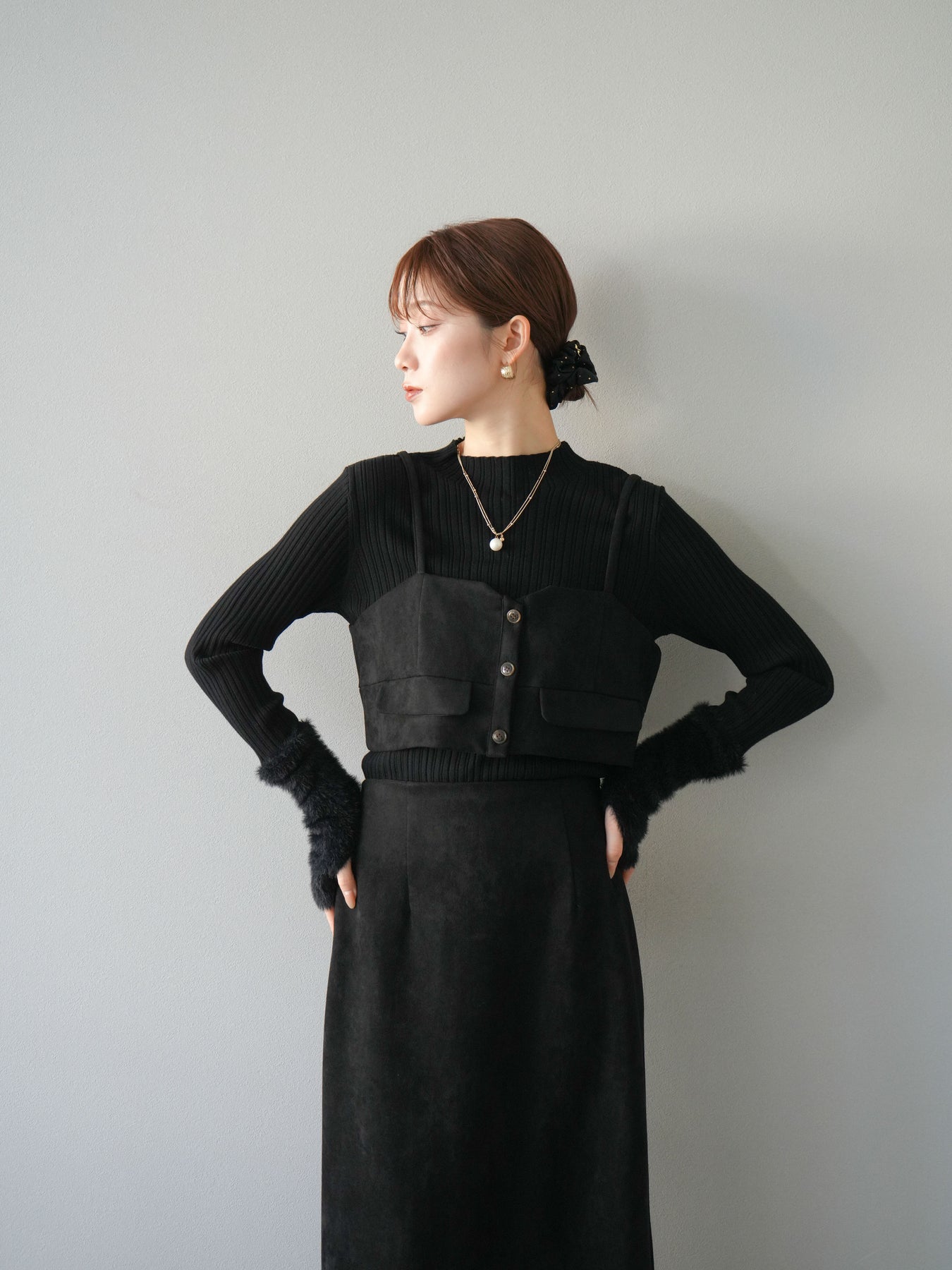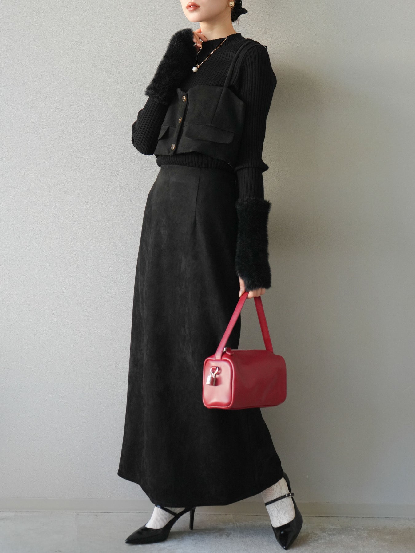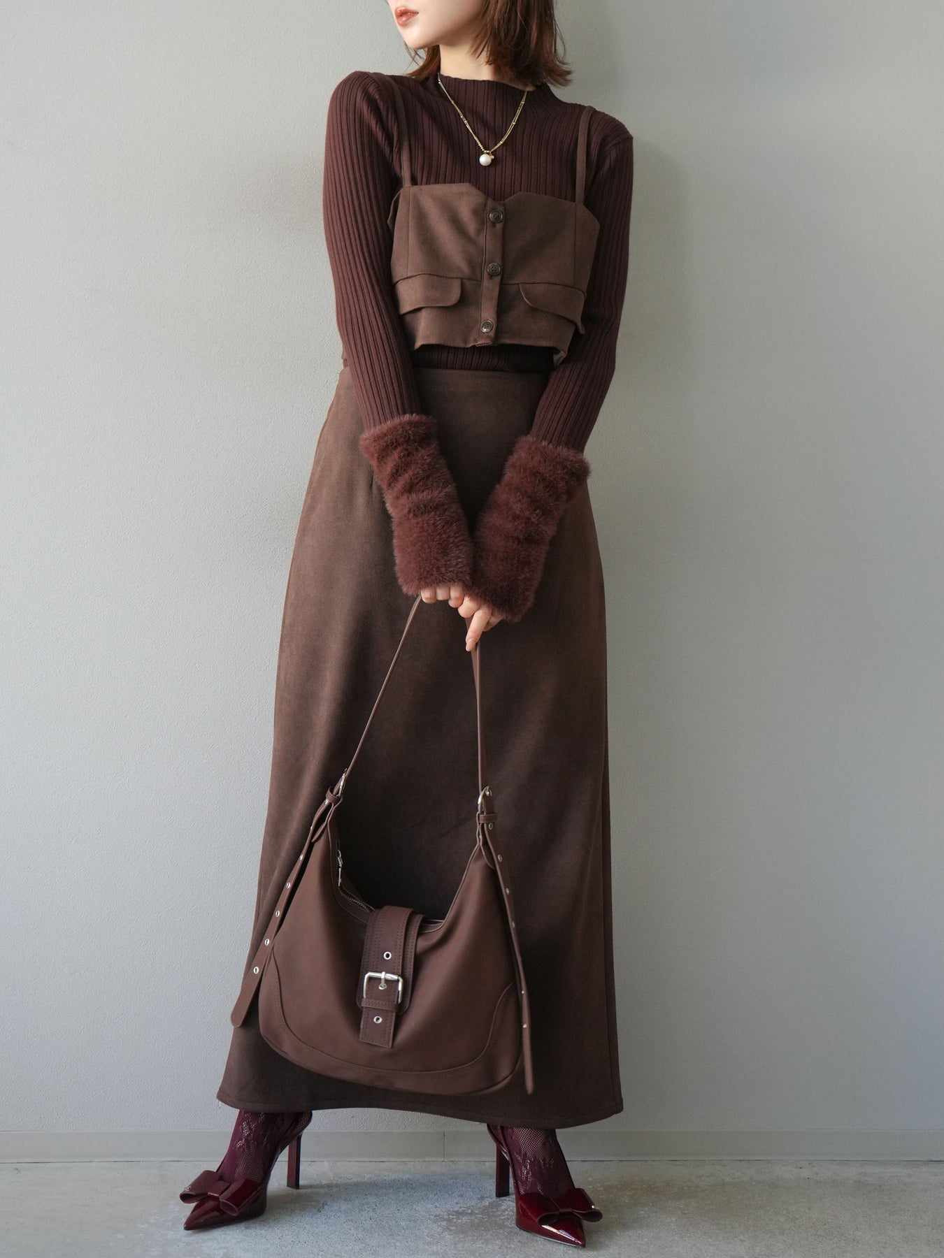 [SET]スウェードビスチェ+アームシャギーランダムリブニットトップス+スウェードIラインスカート(3set)