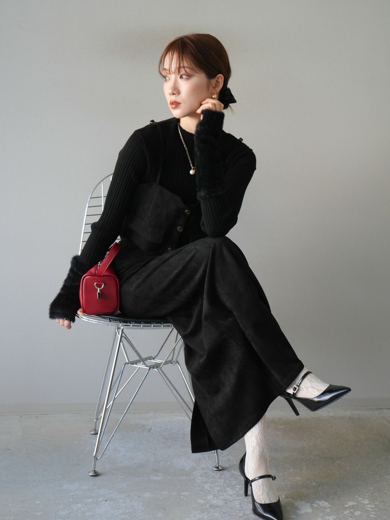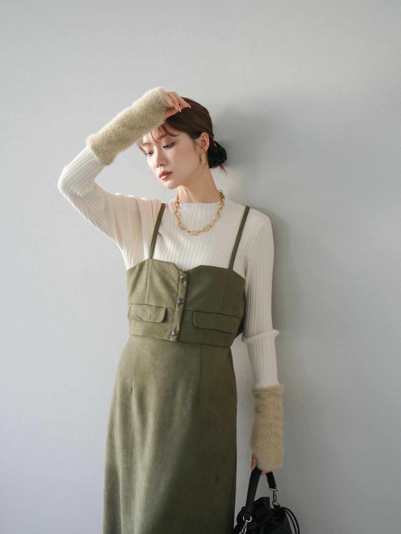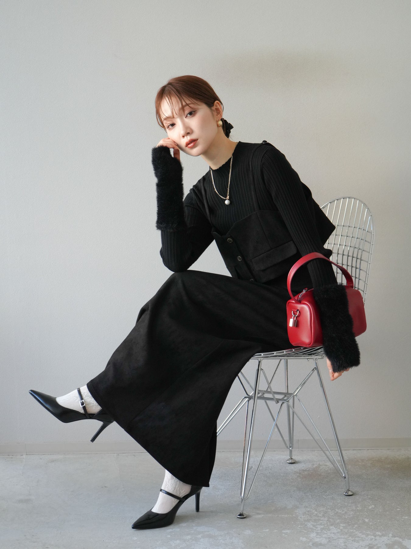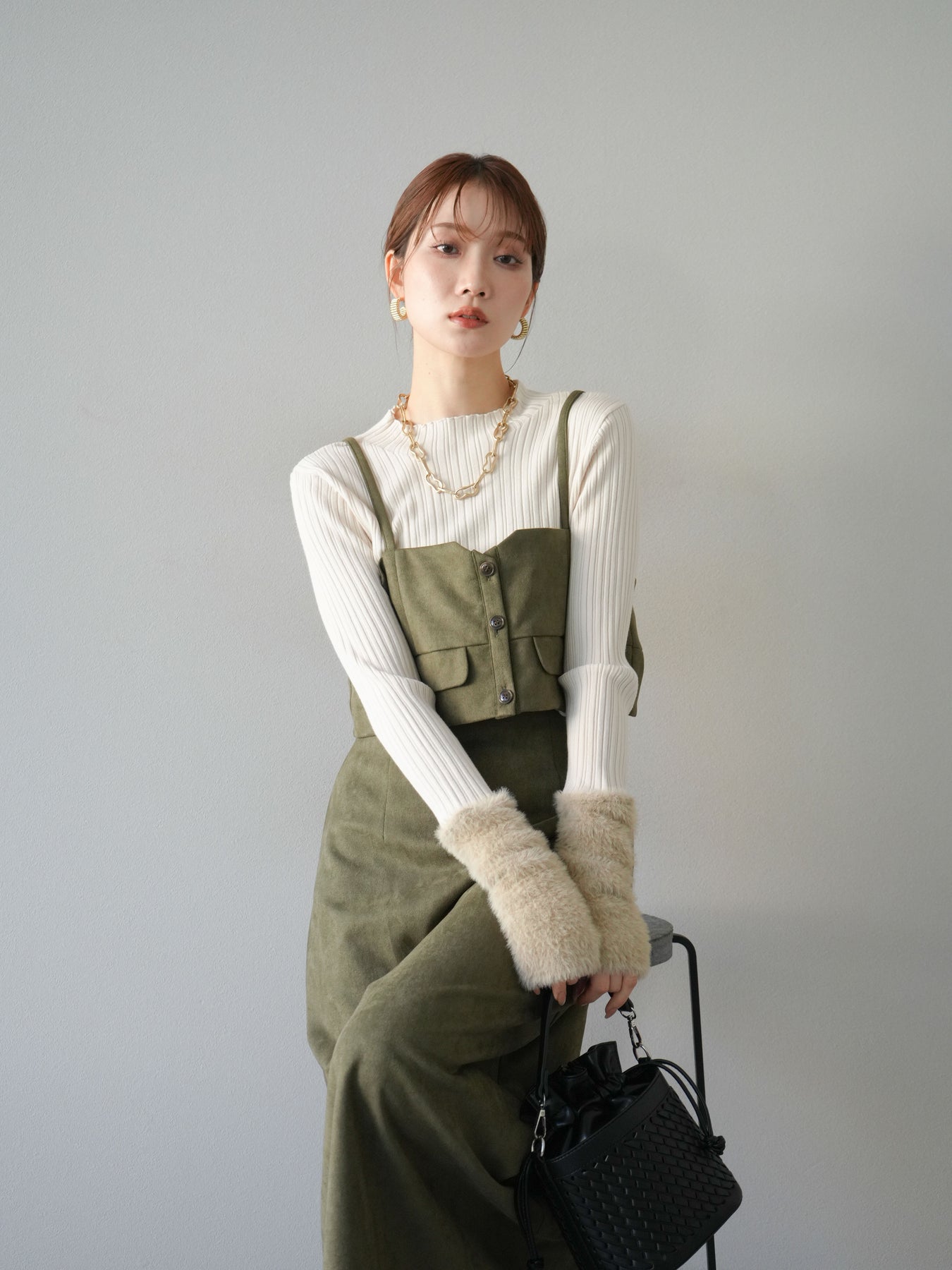 [SET]スウェードビスチェ+アームシャギーランダムリブニットトップス+スウェードIラインスカート(3set)