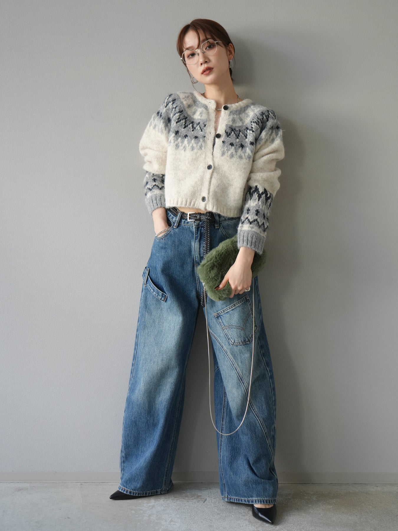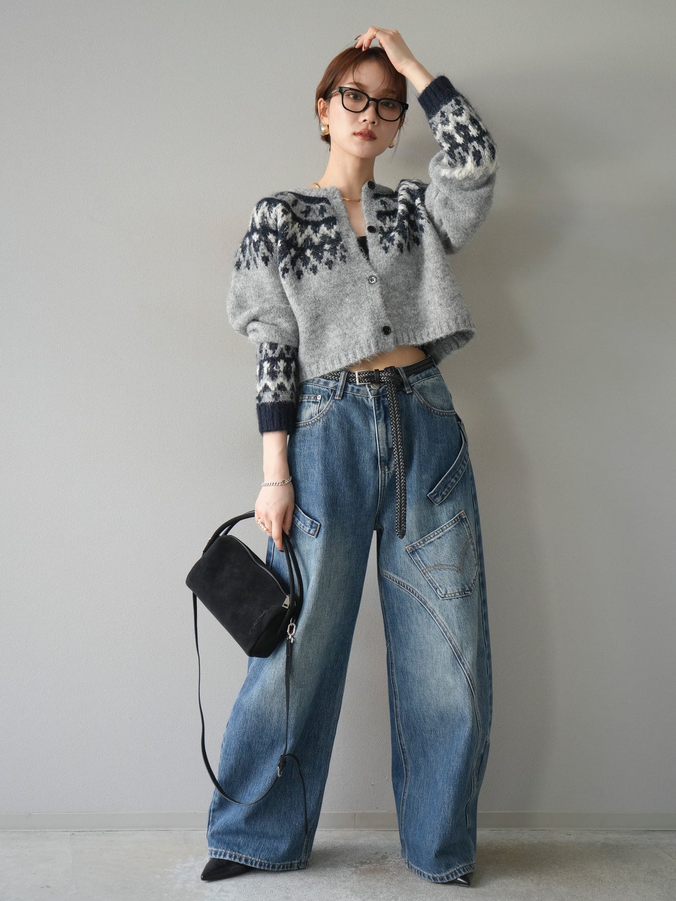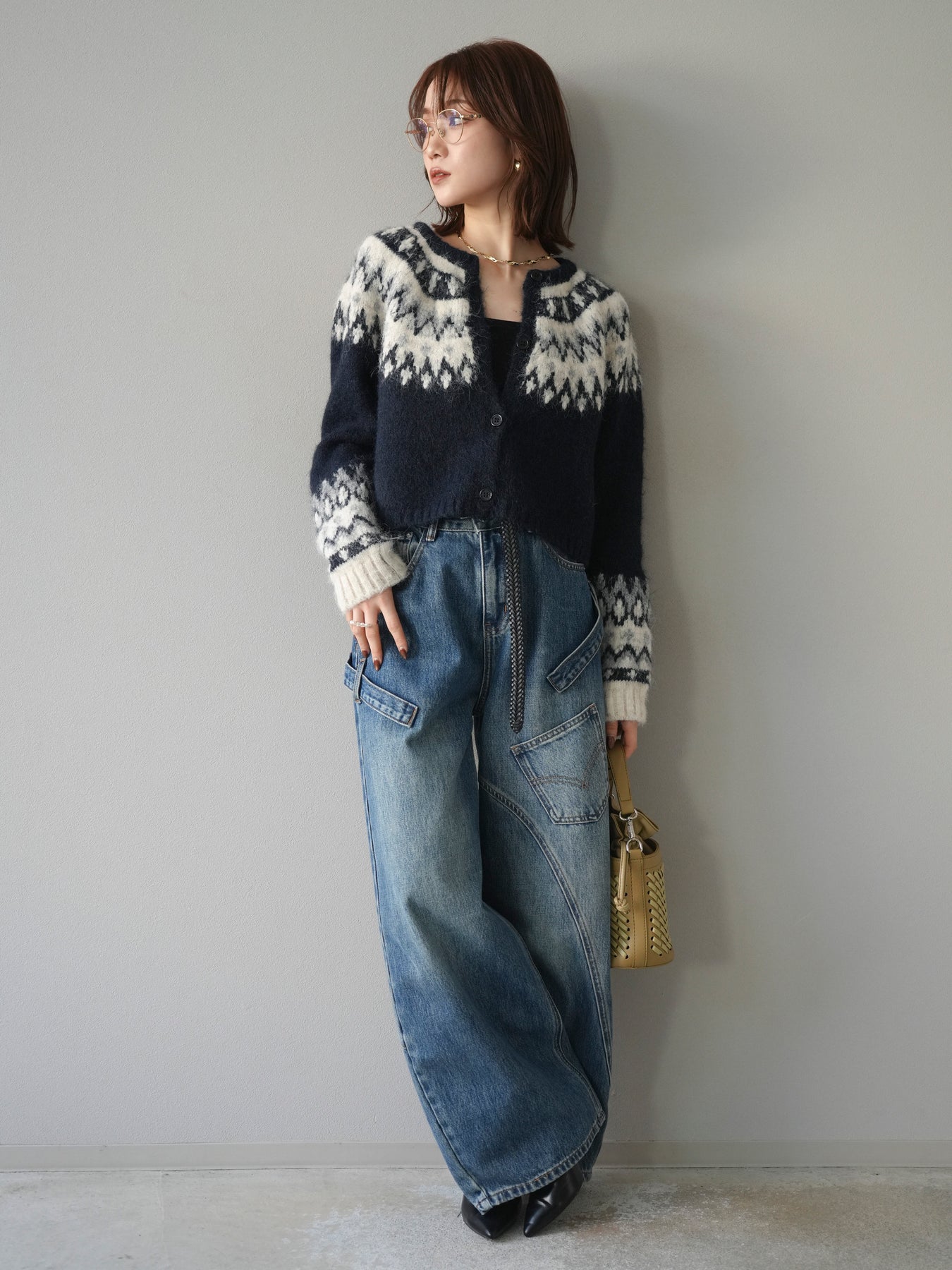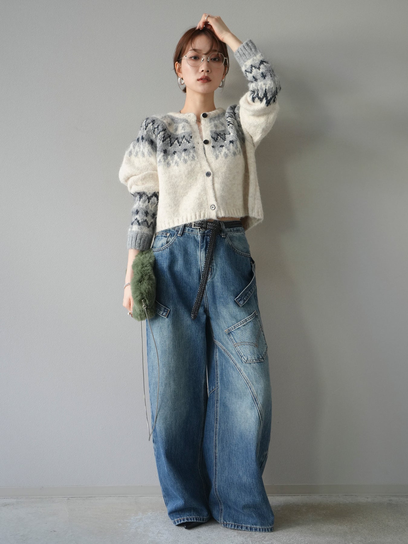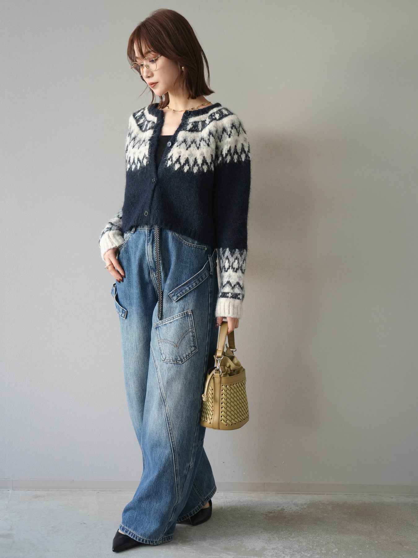 [SET]求心柄クロップドニットカーディガン+ペインターカーブデニムパンツ(2set)