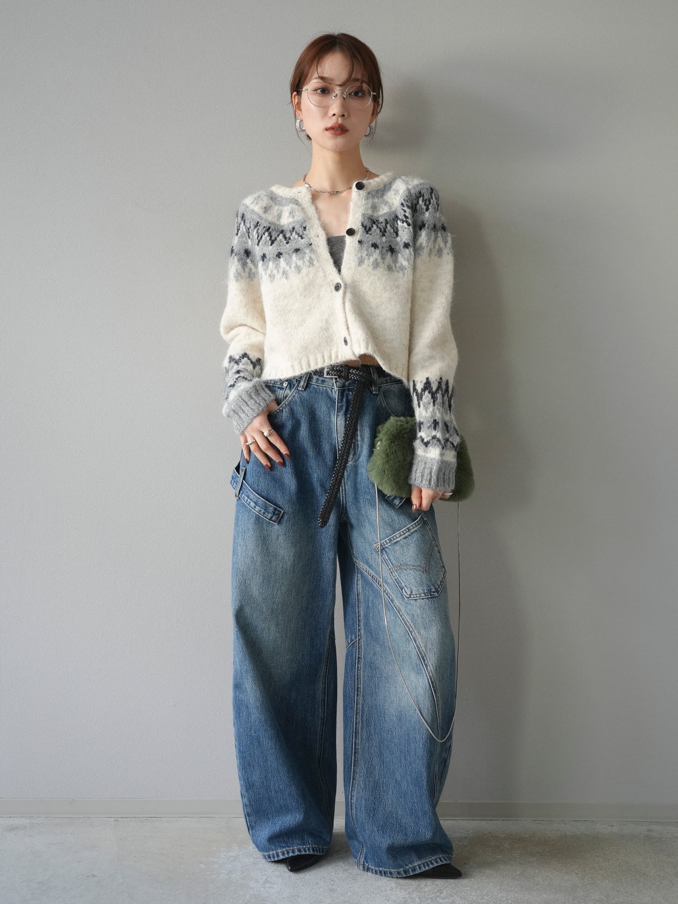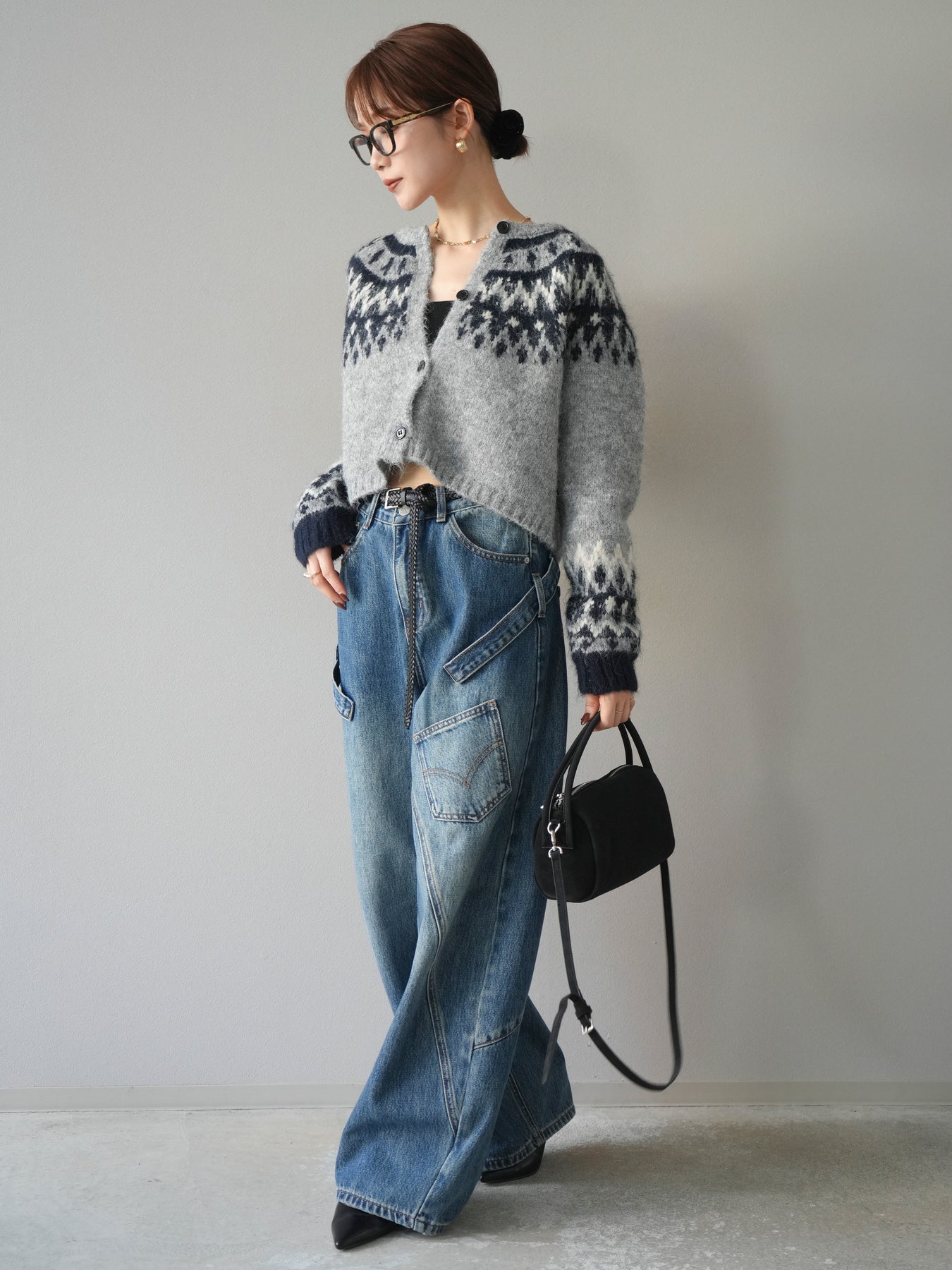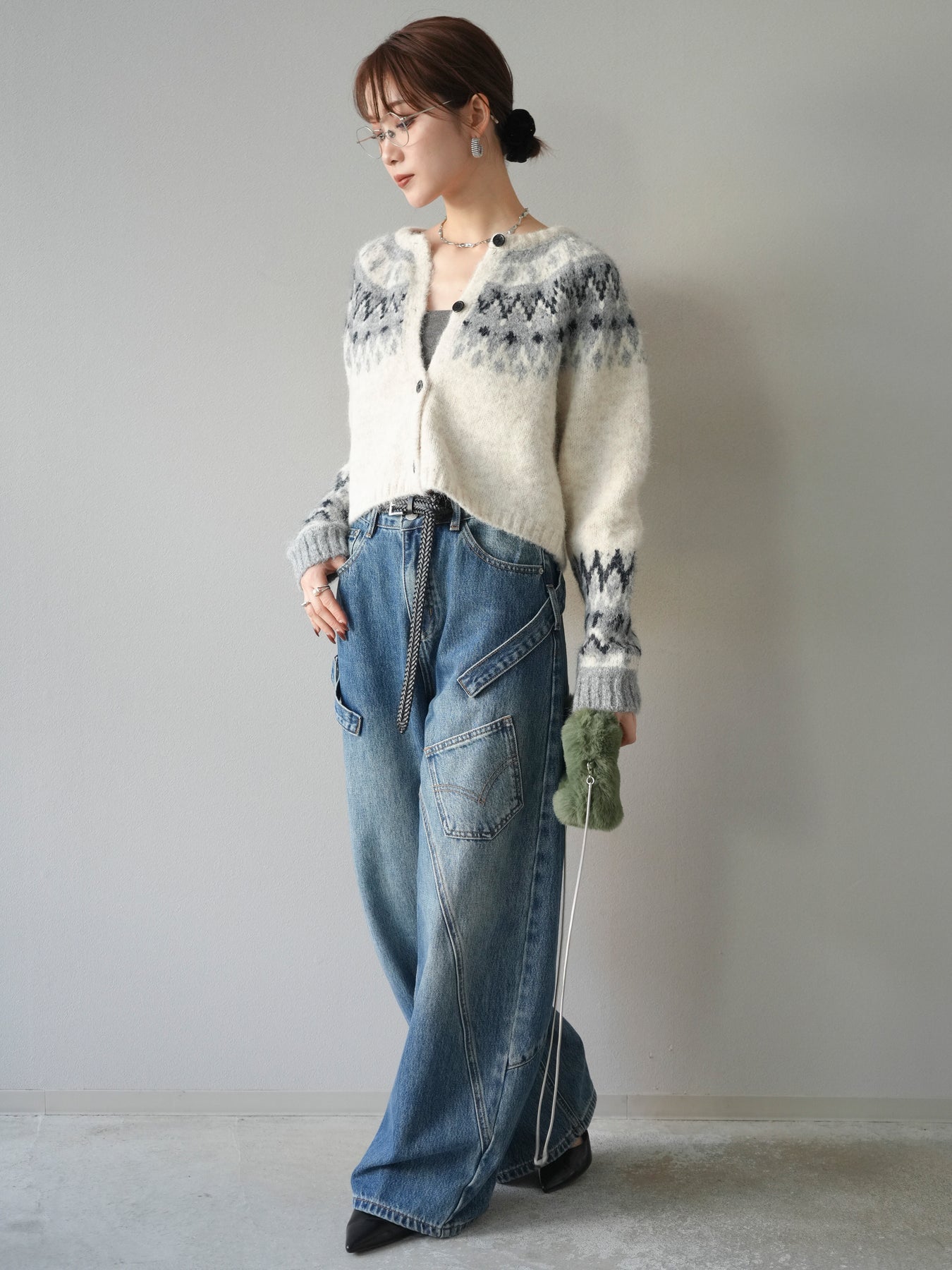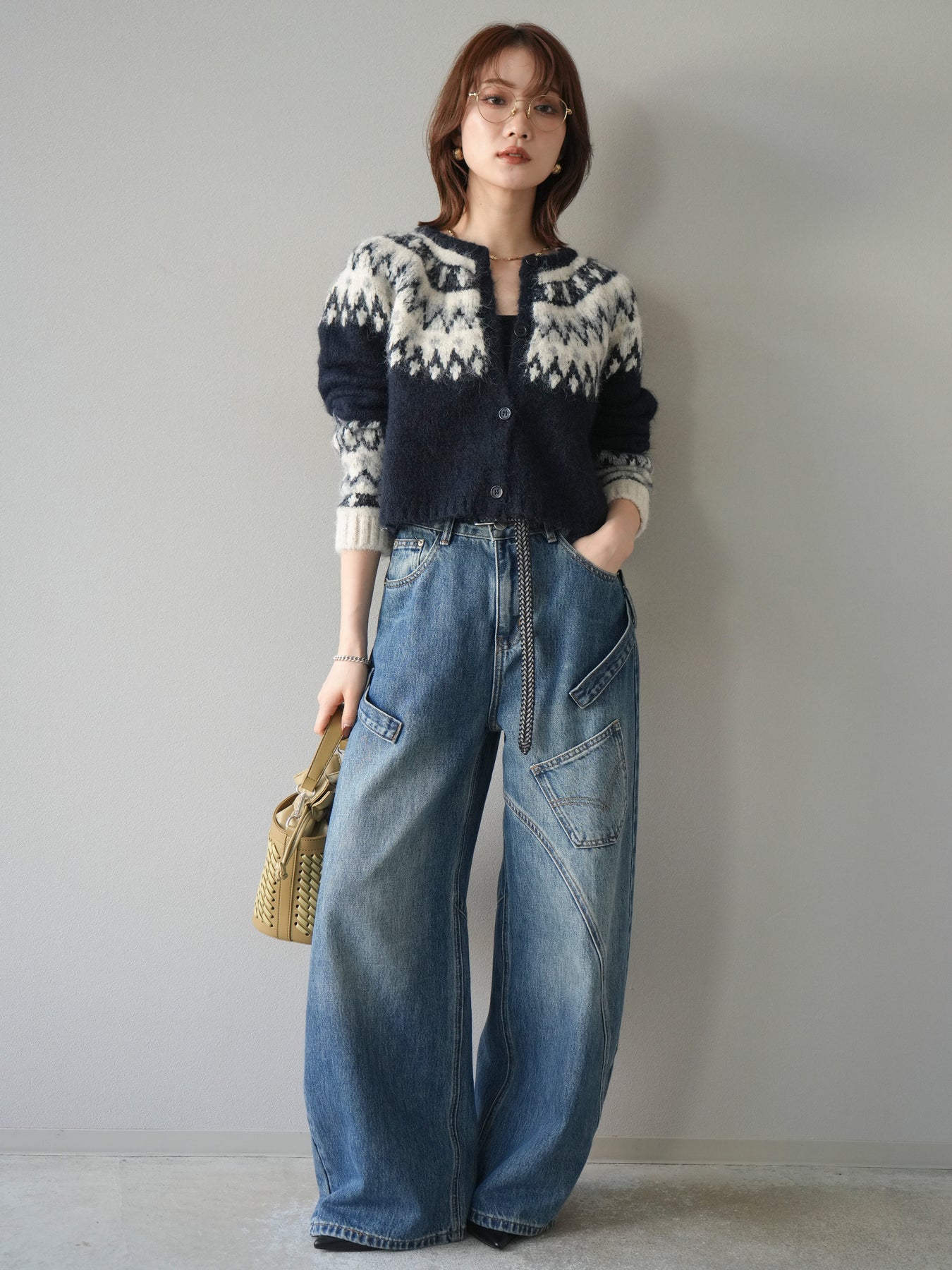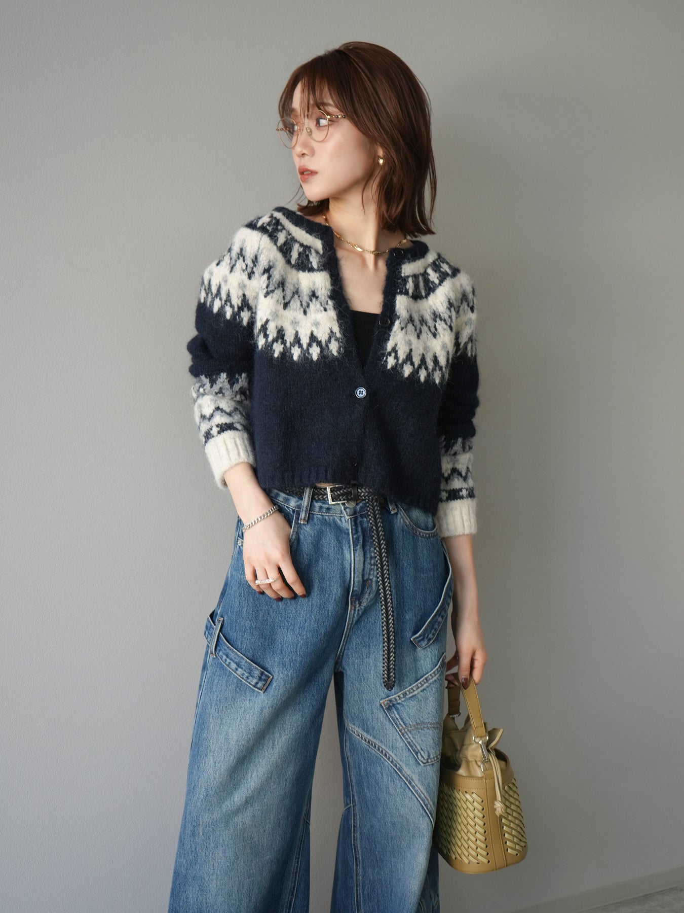 [SET]求心柄クロップドニットカーディガン+ペインターカーブデニムパンツ(2set)