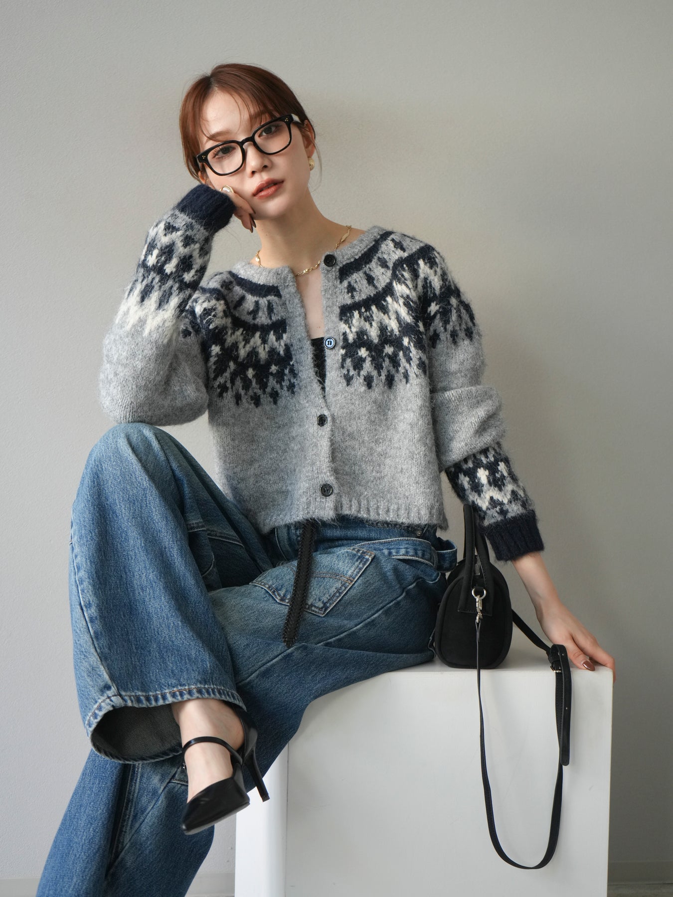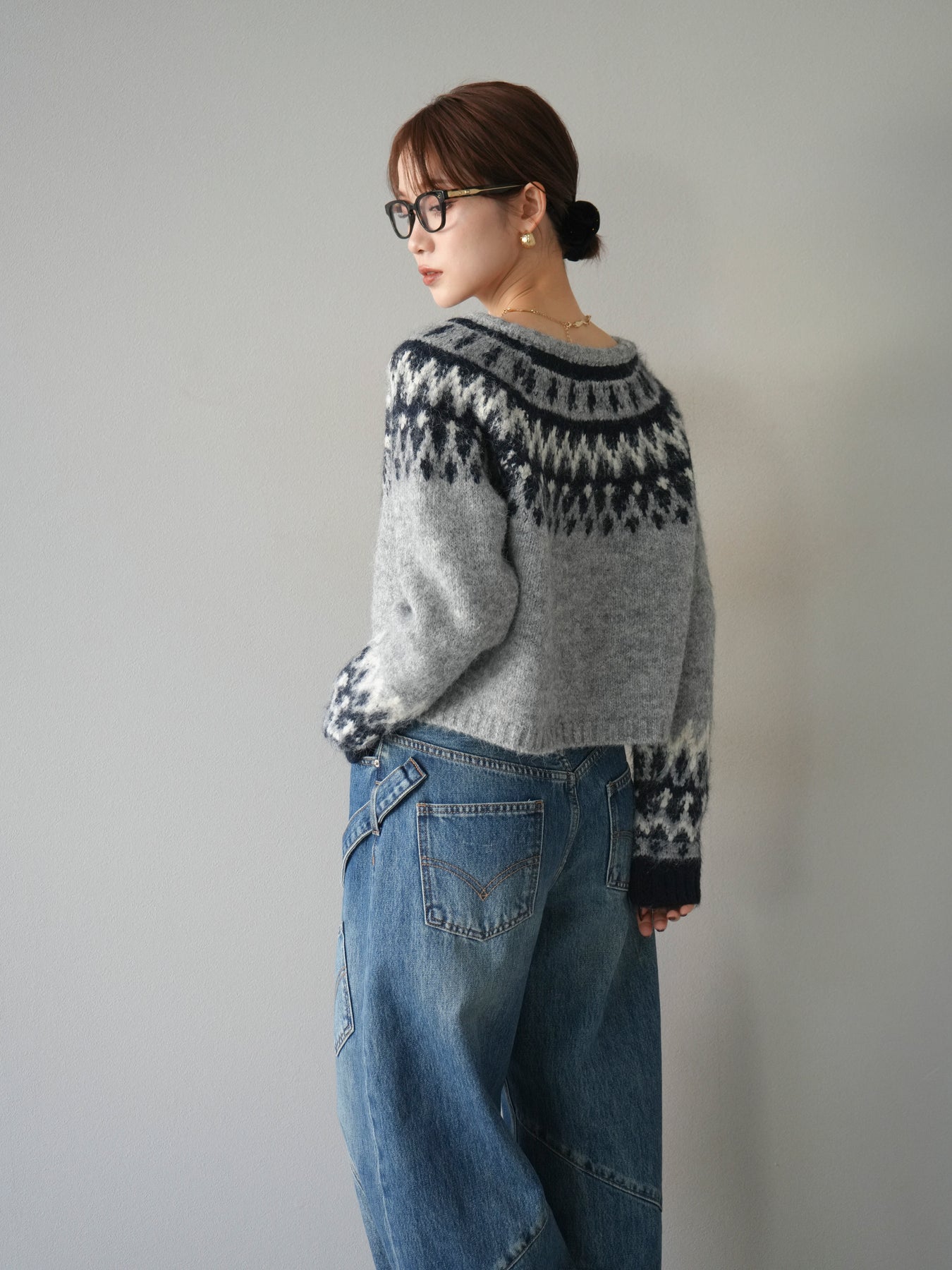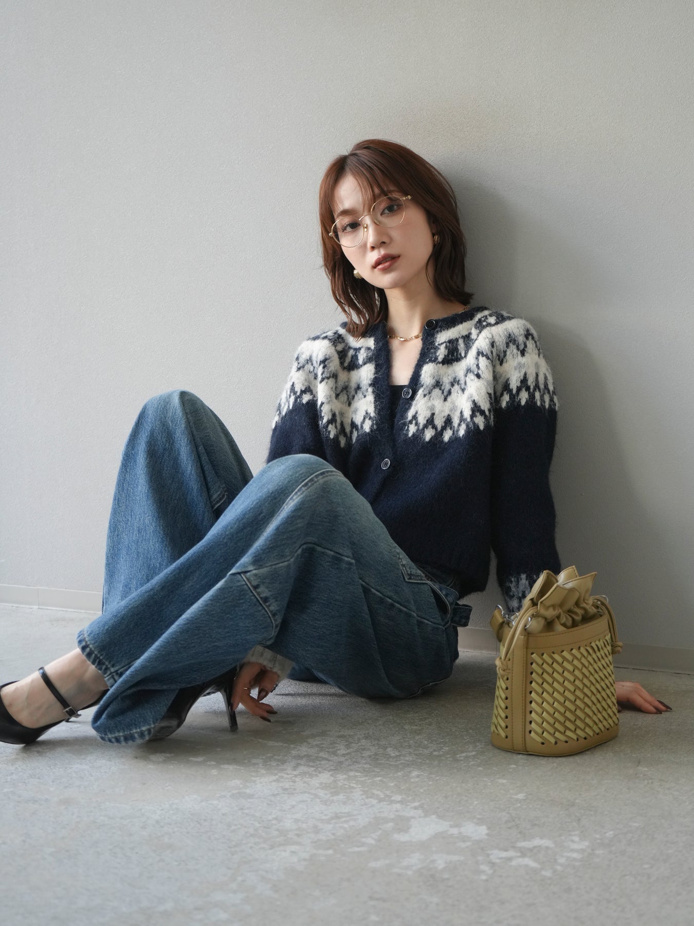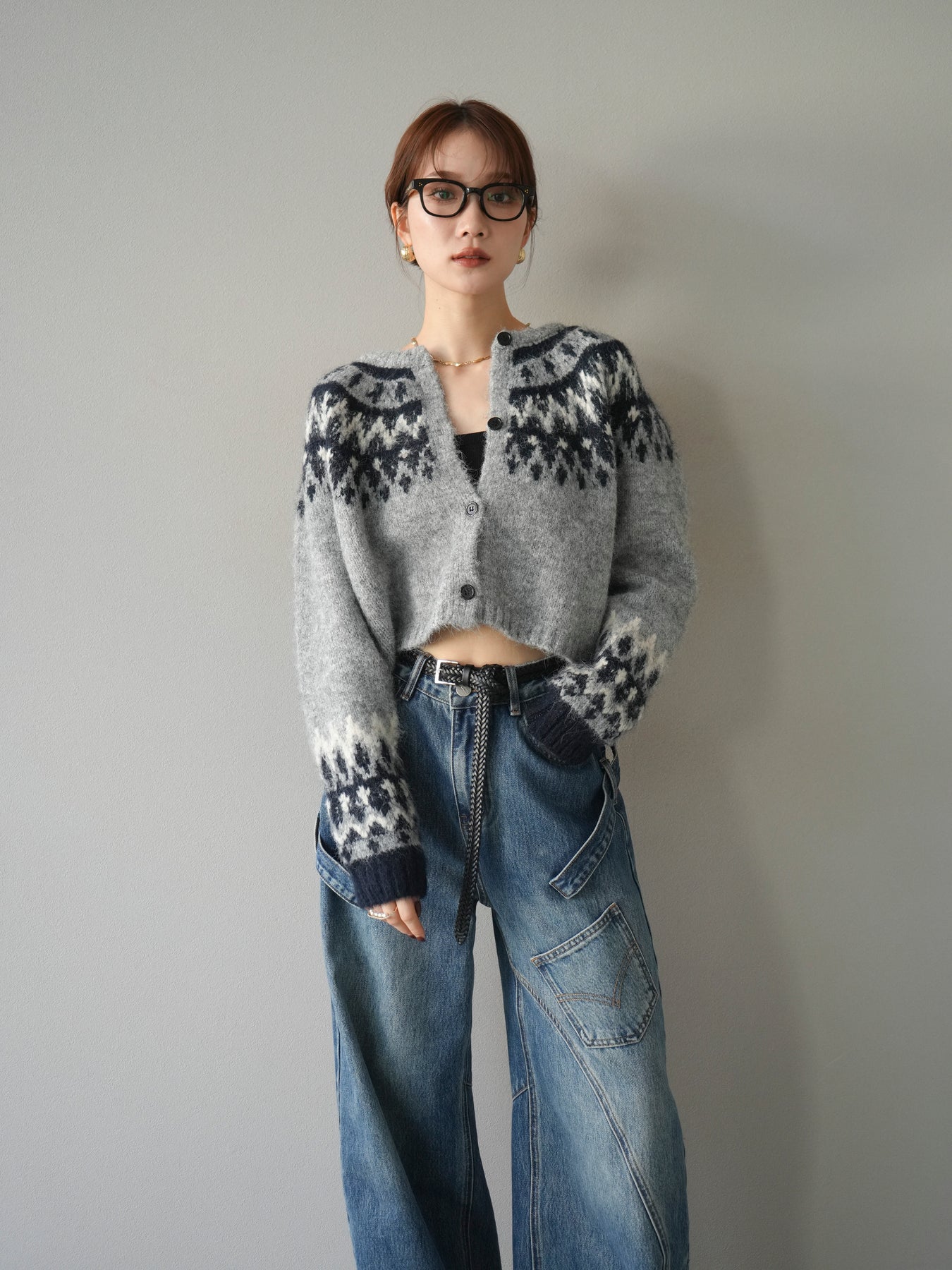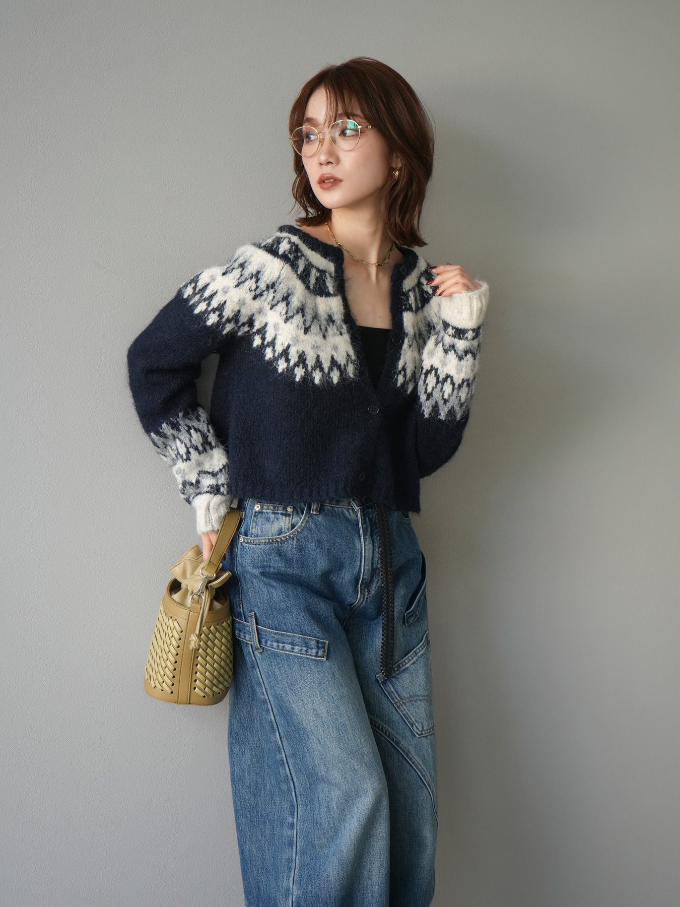 [SET]求心柄クロップドニットカーディガン+ペインターカーブデニムパンツ(2set)