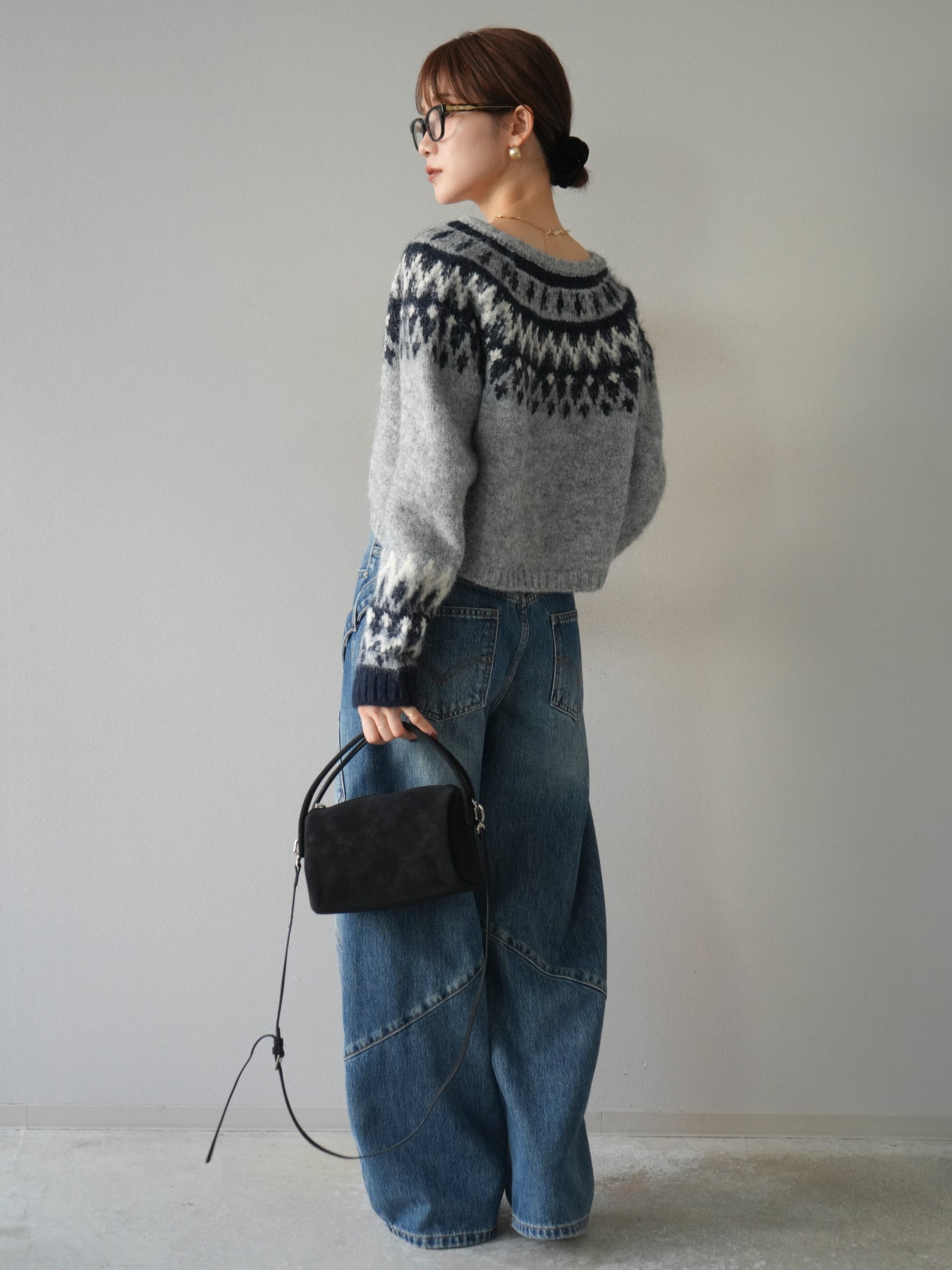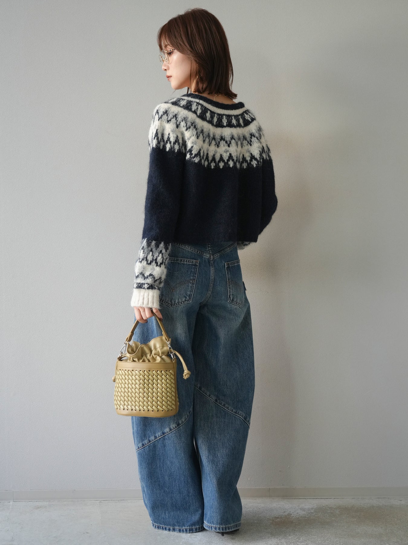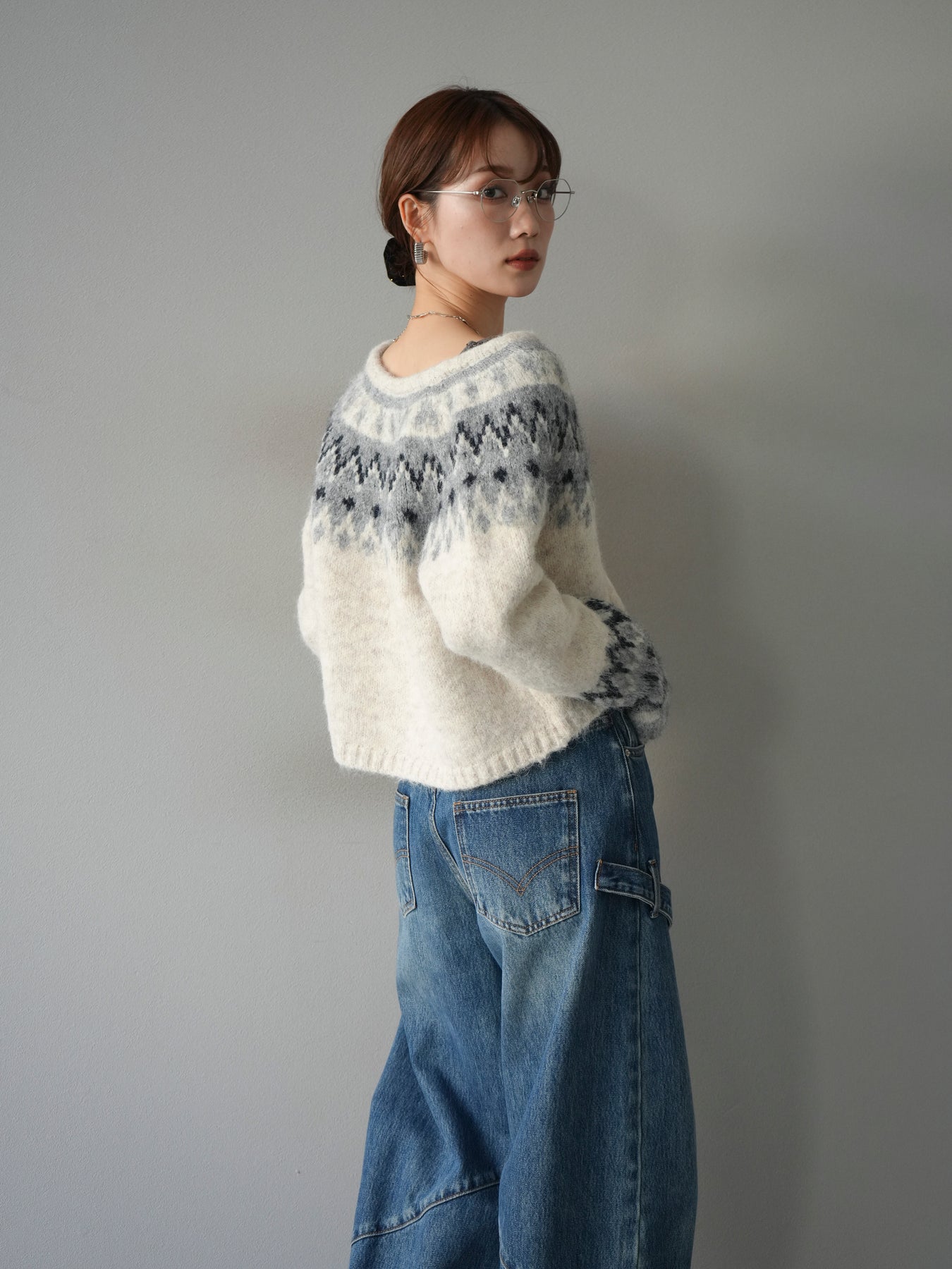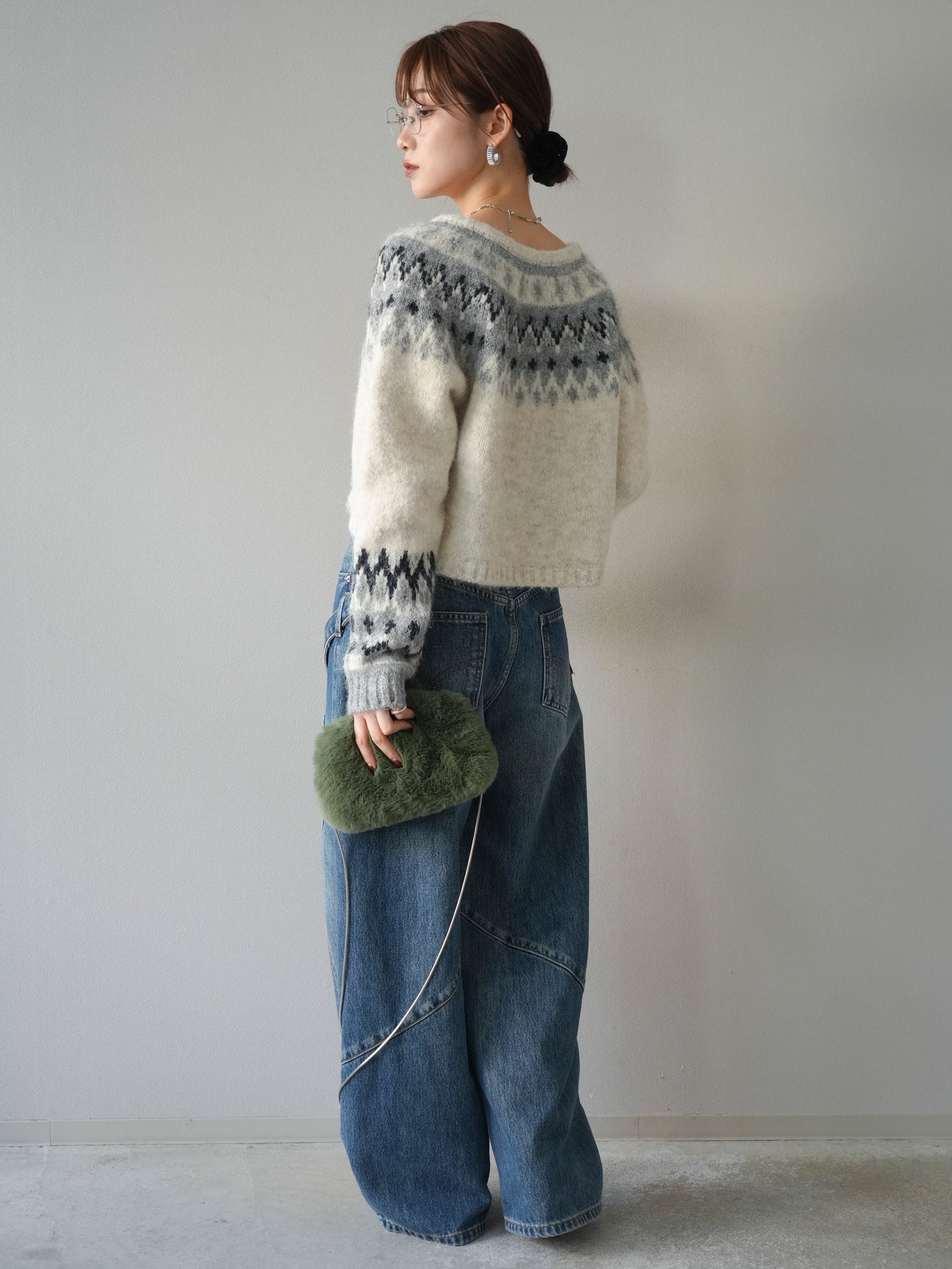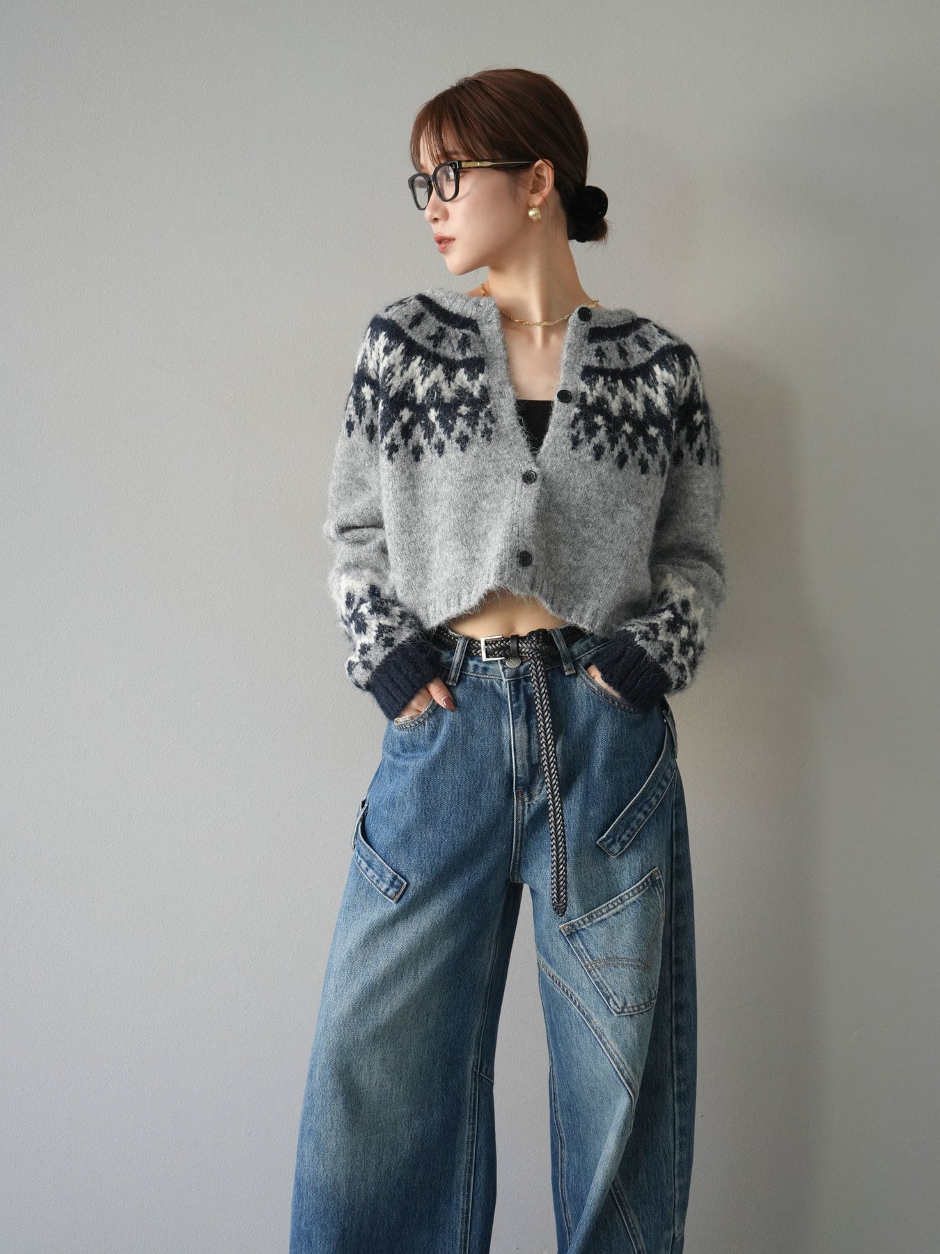 [SET]求心柄クロップドニットカーディガン+ペインターカーブデニムパンツ(2set)