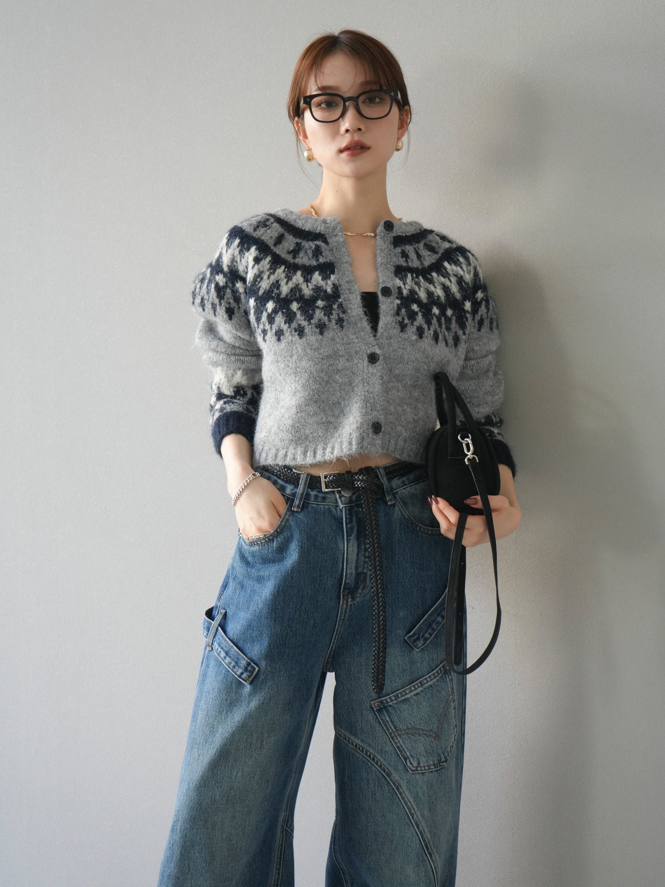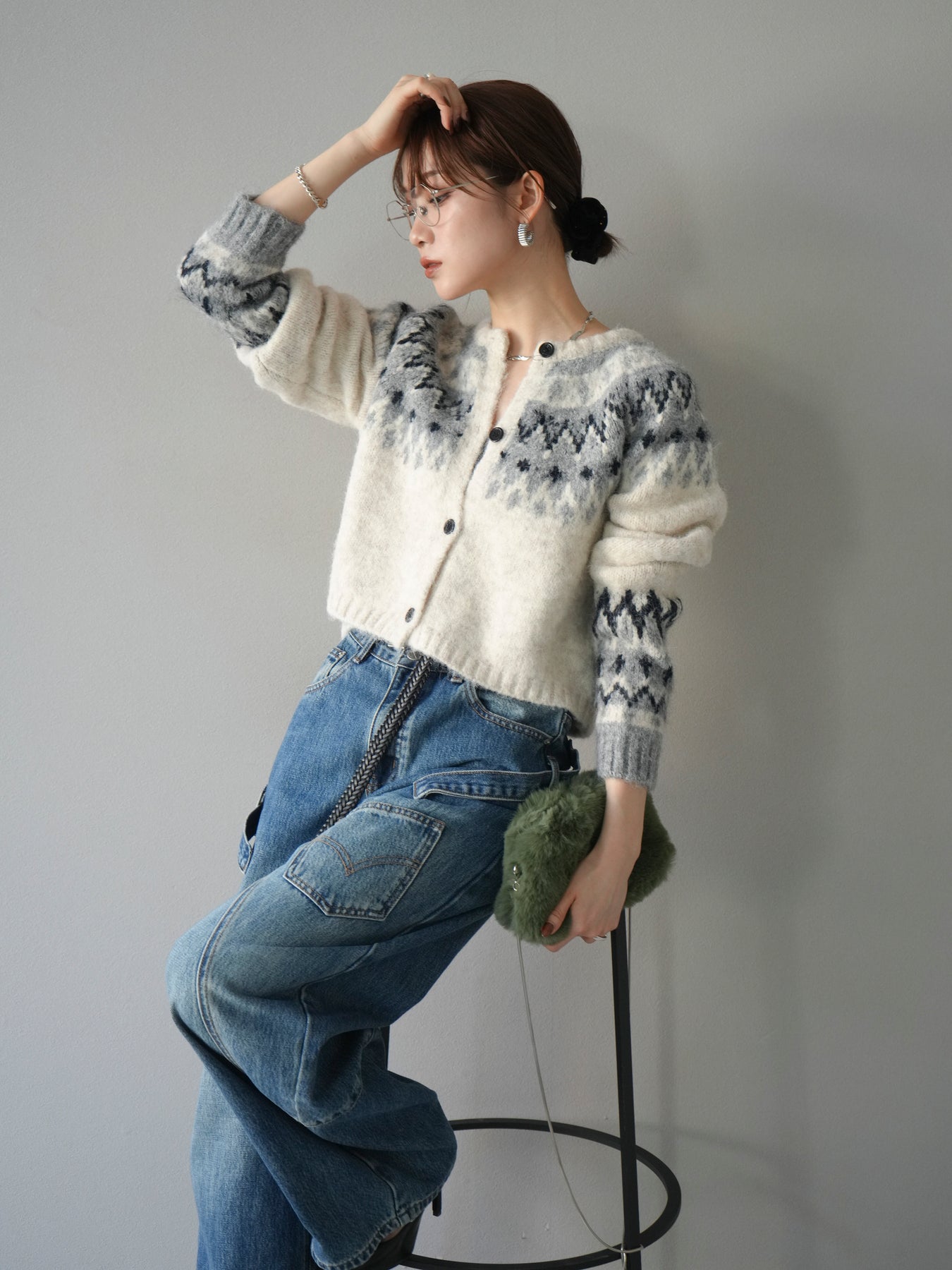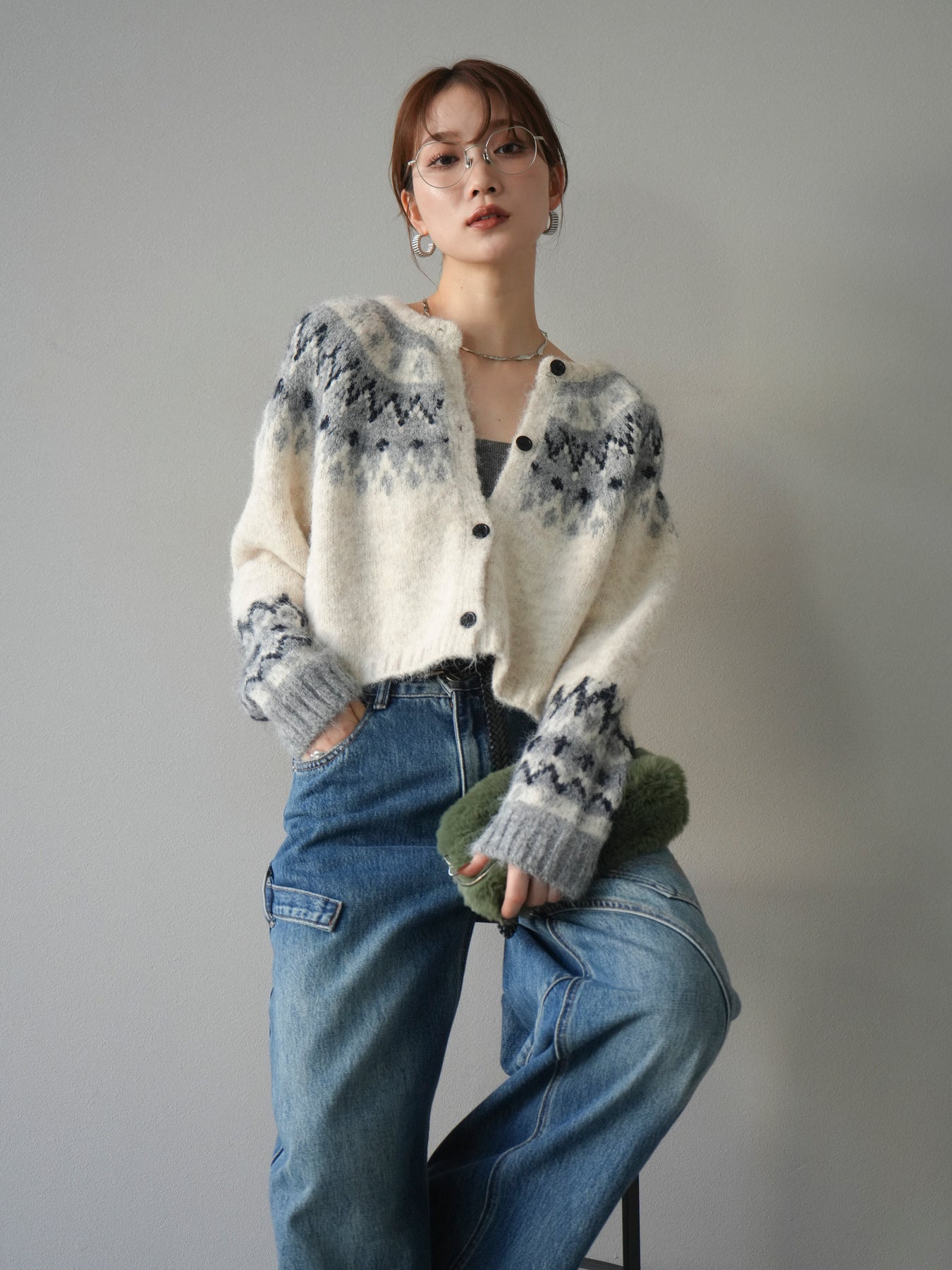 丸みのある求心柄が印象的なクロップド丈ニットカーディガン。 ふんわりとしたシャギー感のある編地がやさしい表情を演出し、柔らかく温かみのある着心地も魅力。 身頃と袖に施されたパターンが、シンプルながらも季節感のあるアクセントになっています。 ショート丈のバランスでワイドパンツやロングスカートとも好相性。 前開き仕様でアウター感覚でも着用でき、秋冬のスタイリングに活躍する1枚です。