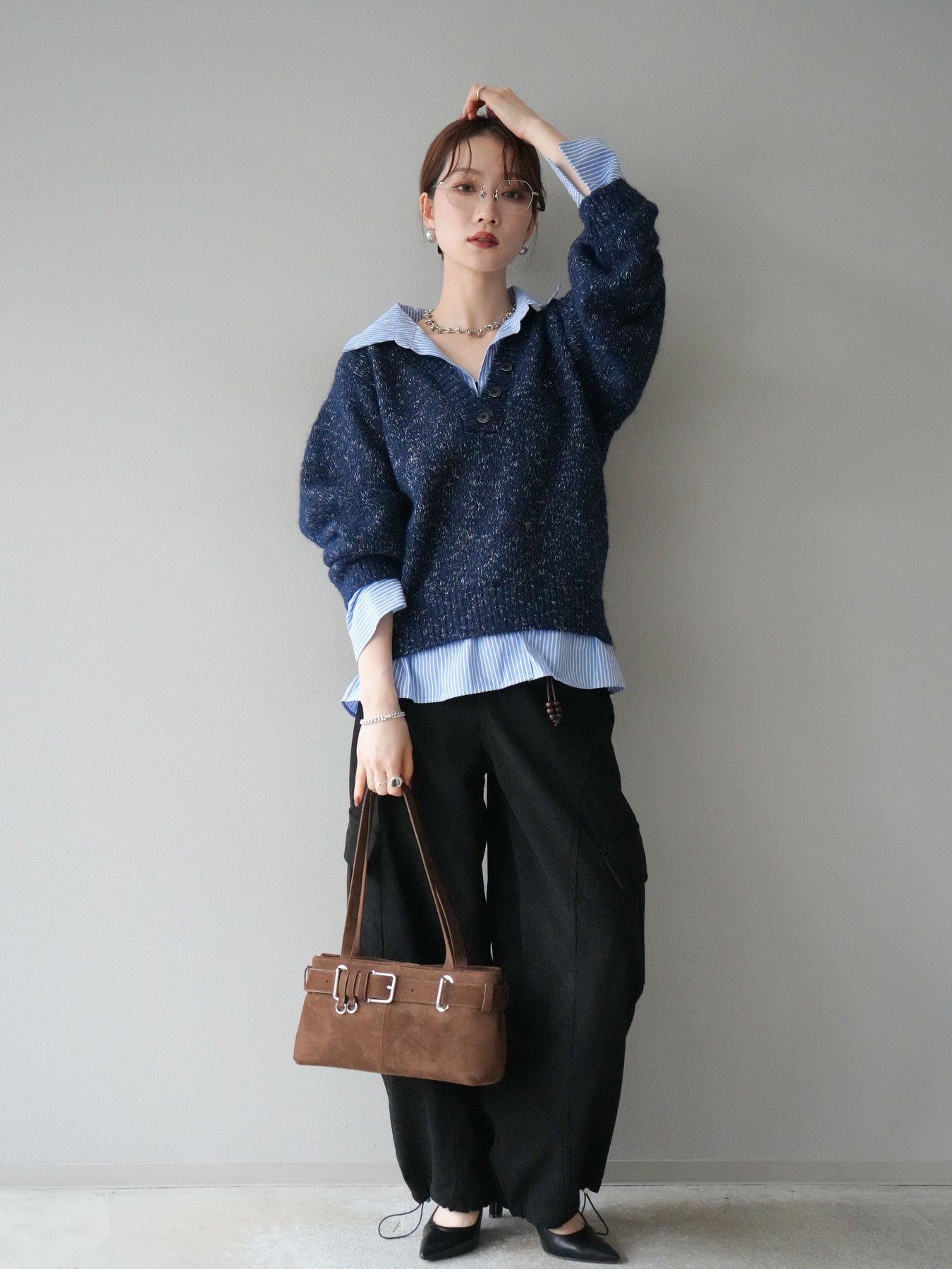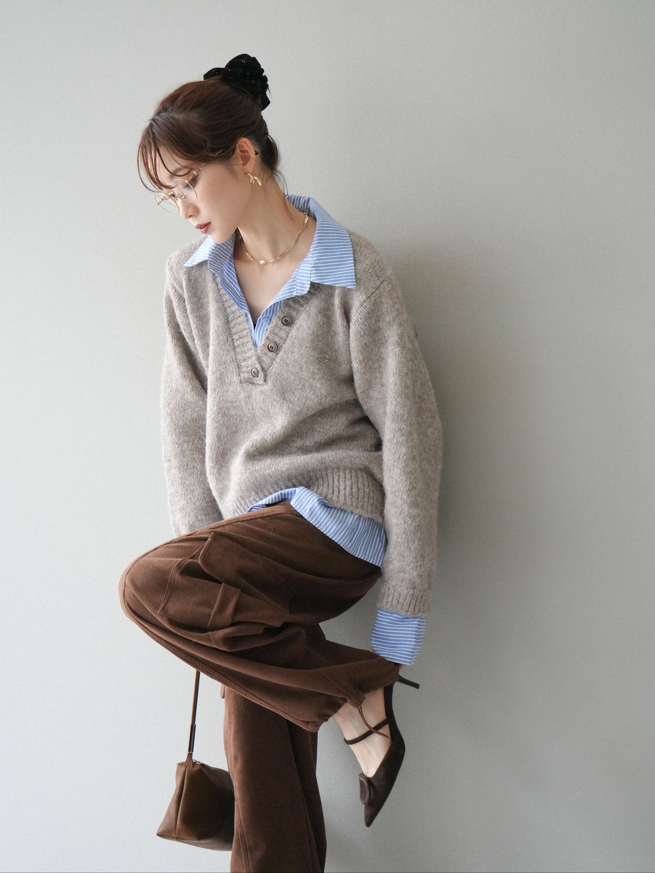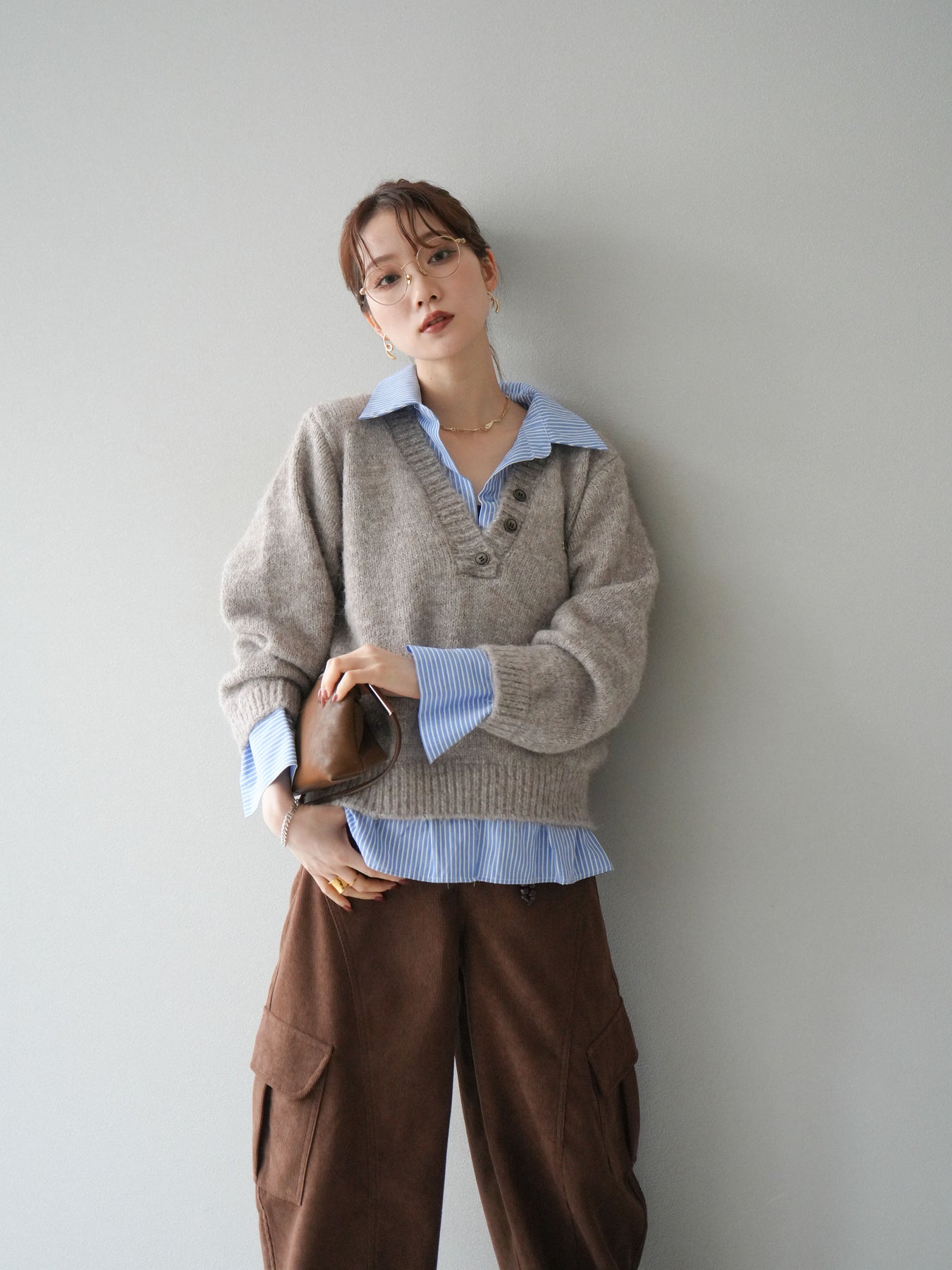 ◆ [予約]ストライプシャツドッキングMIXヤーンニットプルオーバー
