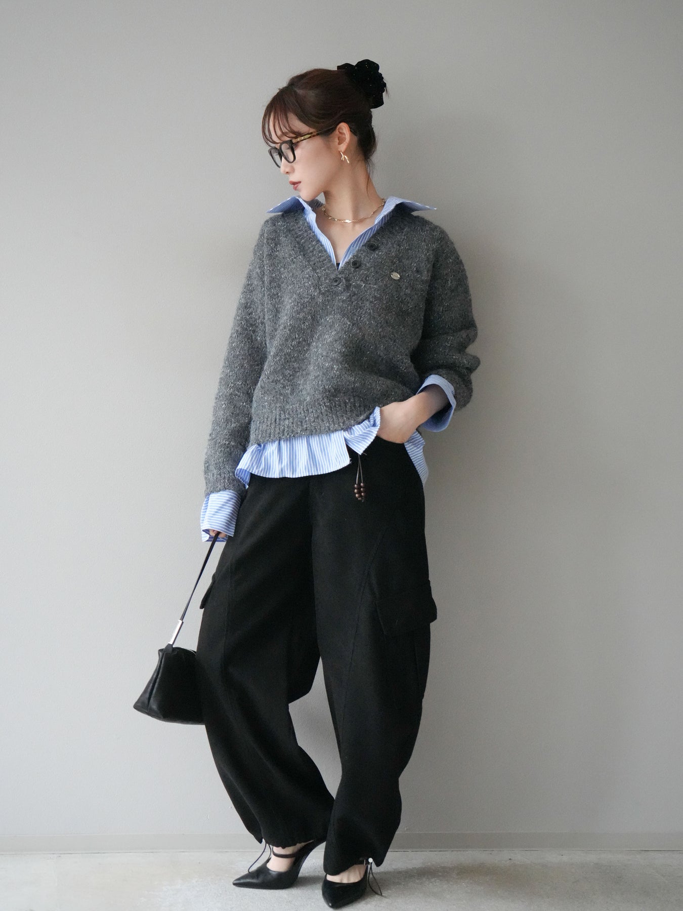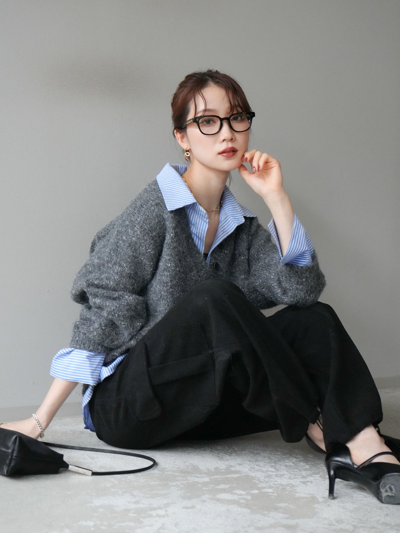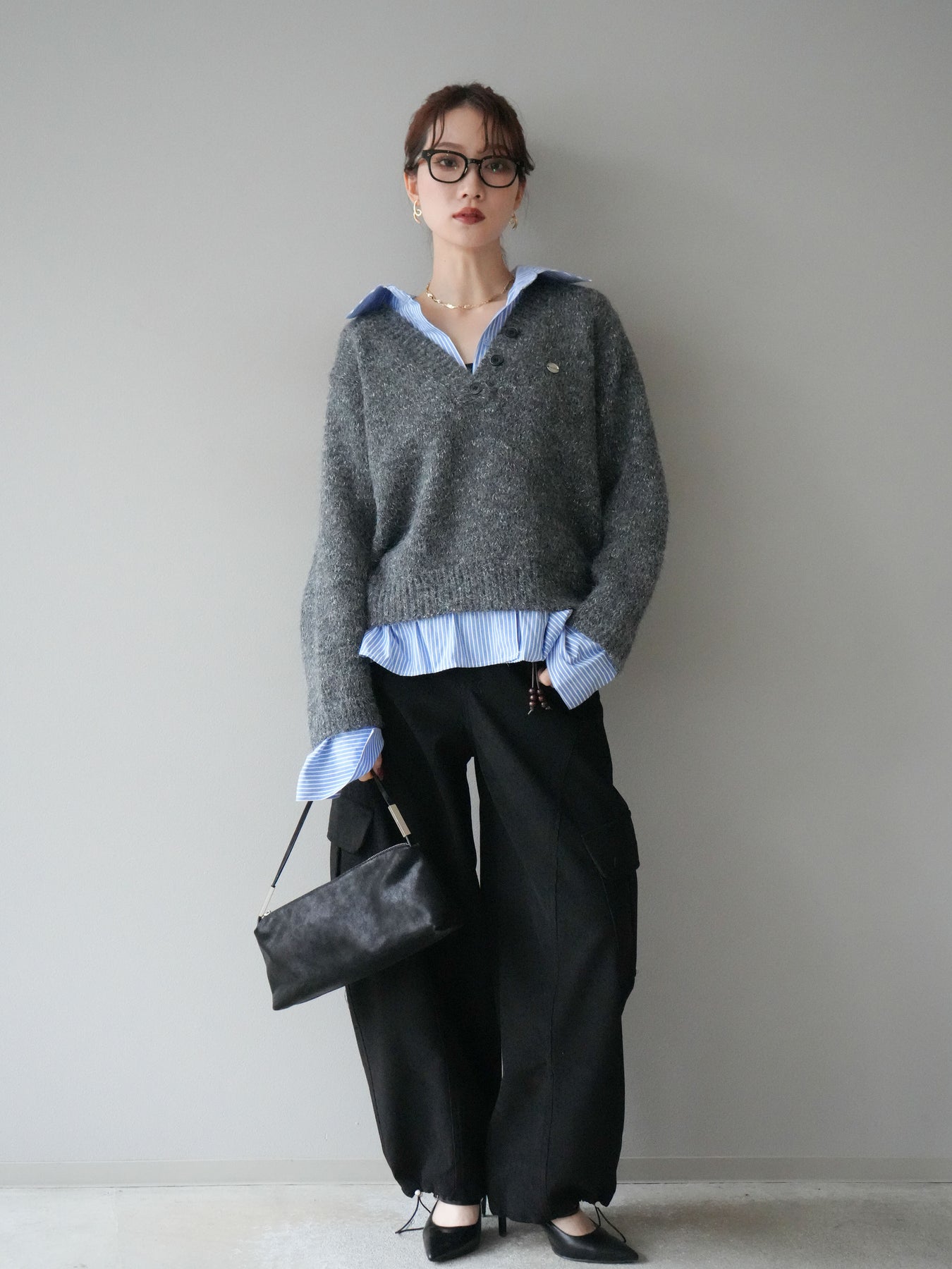 ◆ [予約]ストライプシャツドッキングMIXヤーンニットプルオーバー